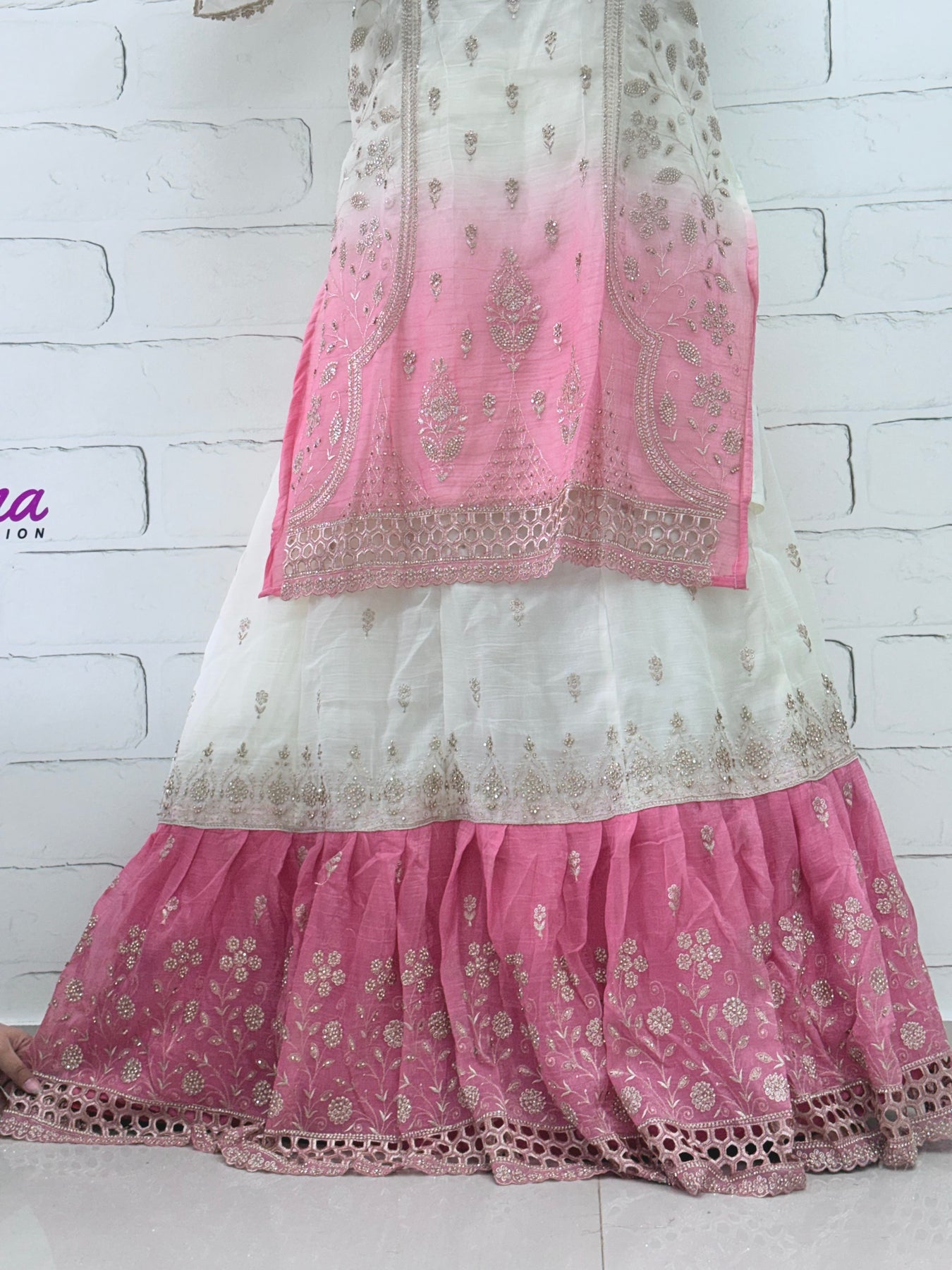 Farshi Lahenga 3 layers with heavy embroidery with frill and cancane detailing in two shades.Length inches 43