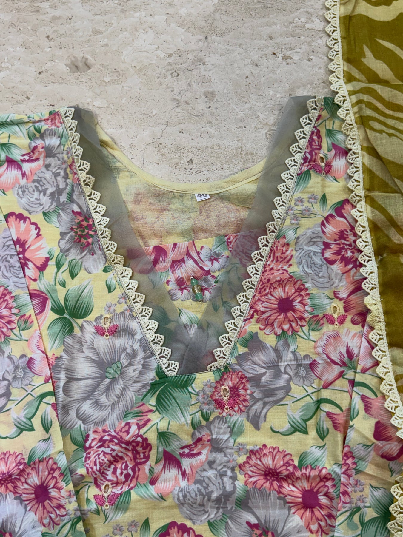 Sleeves printed with lace and organza detailing length..18inches