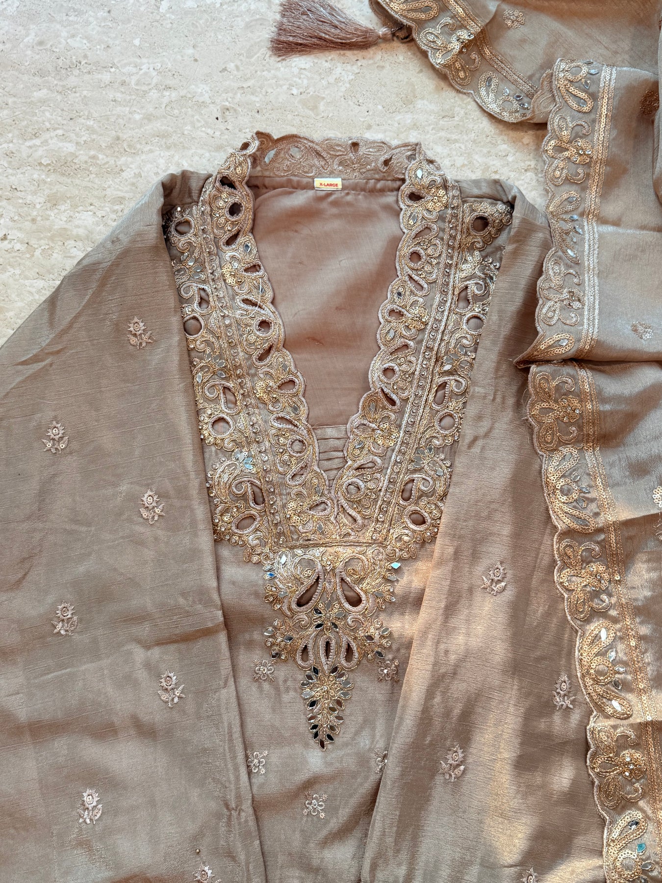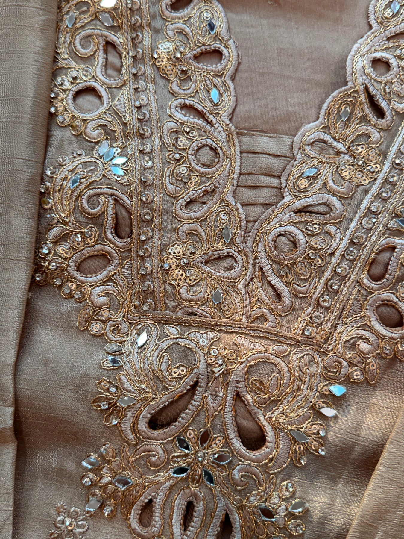 Top Chinnon silk designer stitched  with beautiful cutwork and sequence embroidery...heavy sleeves work..lenght 47 inches with attached lining