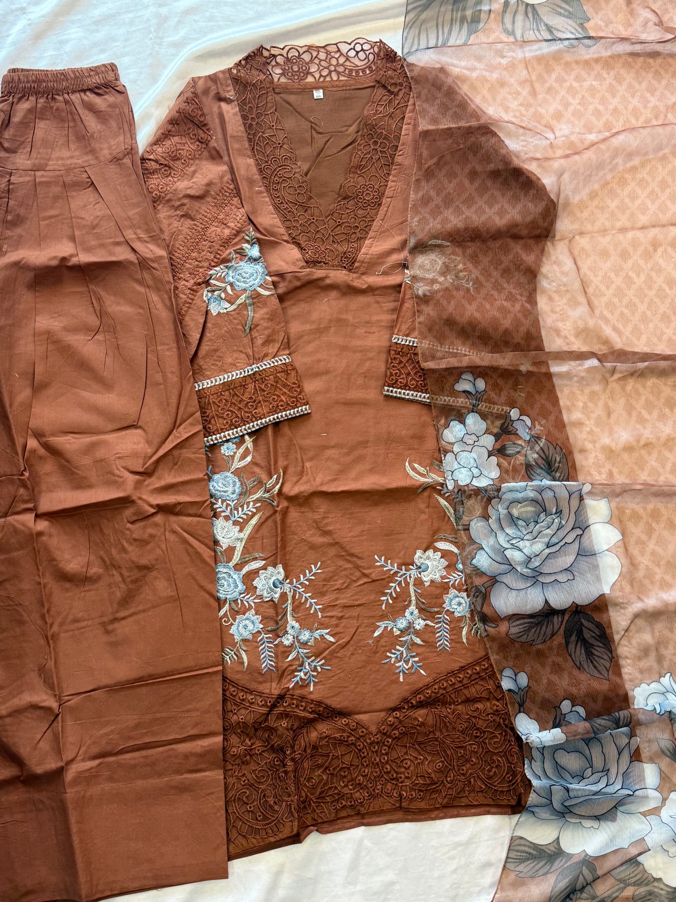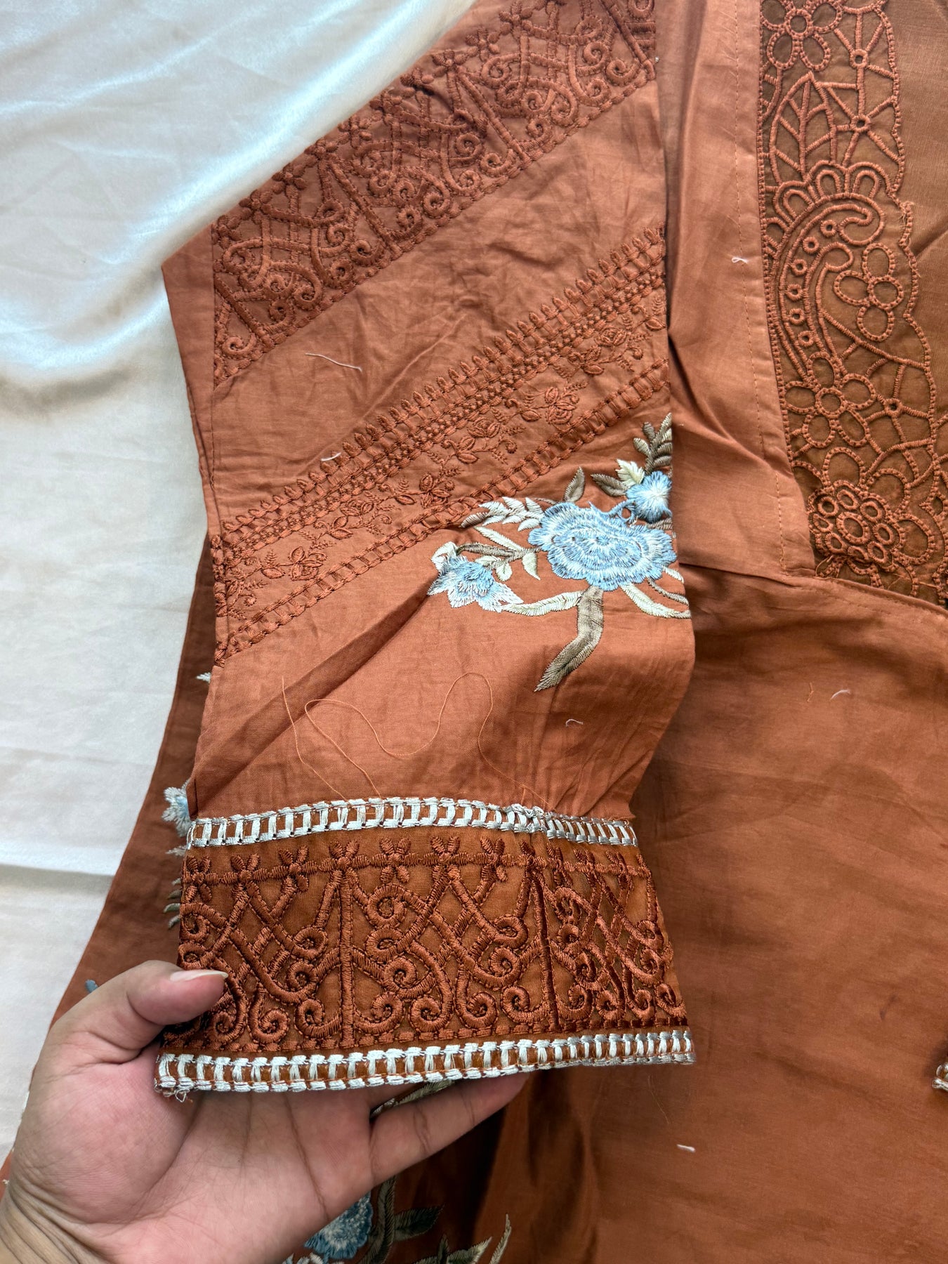Top satin with heavy embroidery on front and sleeves……imported lace on daman.....pakistani style neck......Stitched with lining.....length 38 Inches…