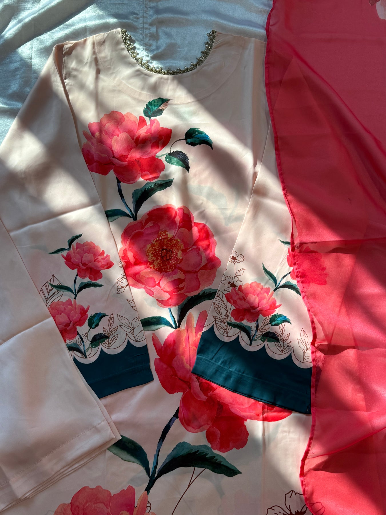 Top Soft satin Digital Printed Top.….. work on neck…..Length 48 Inches...