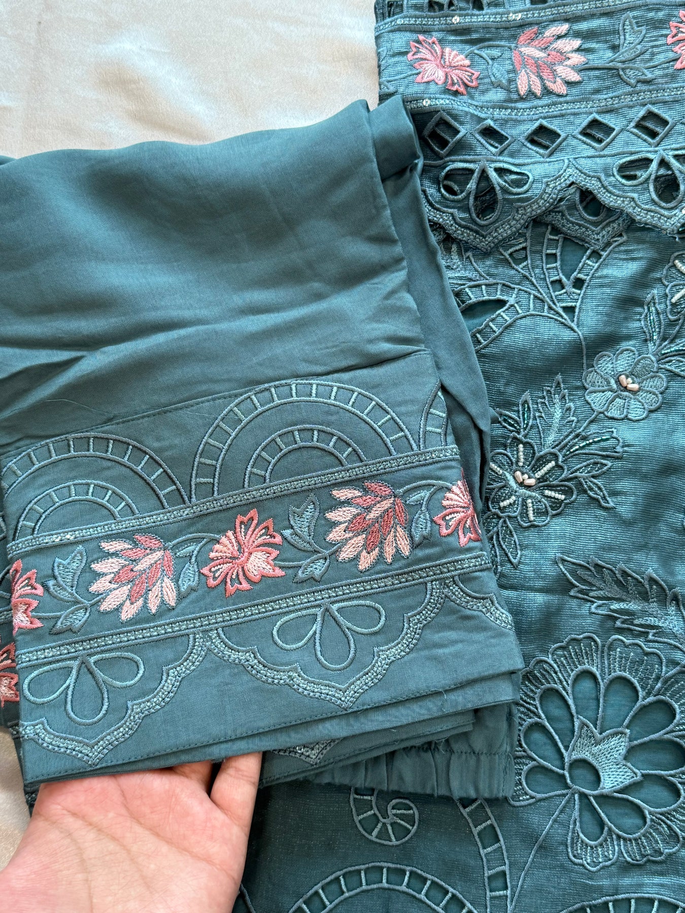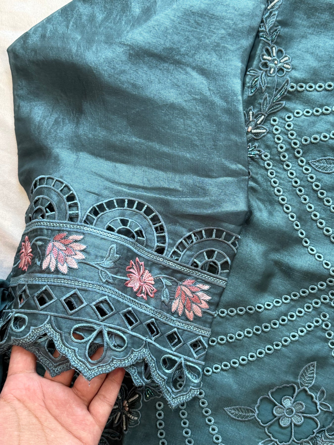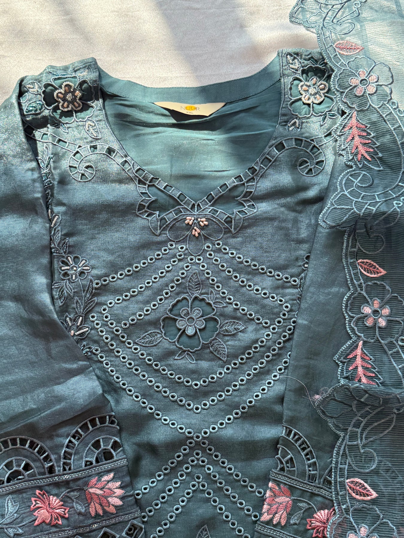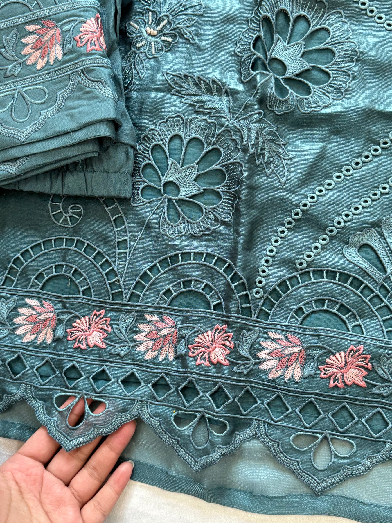 Top pure muslin with beautiful flower cutwork detailing on neck, sleeves and daman with hand work…..length 36 inches