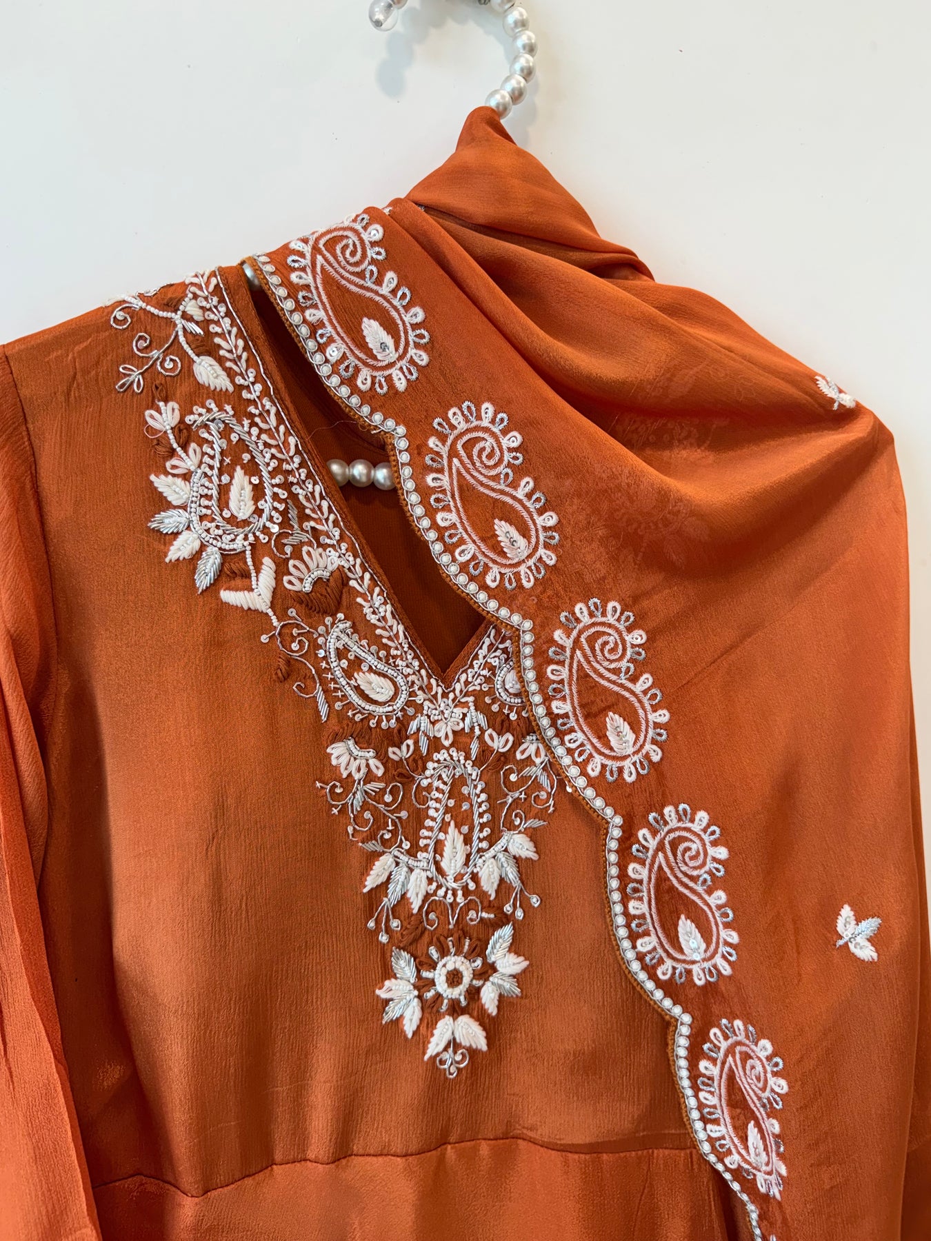 Top Pure crepe A line Frock style with Pocket stitched with beautiful handwork on front.....Pakistani style neck with handwork.... ,heavy handwork on daman and sleeves 20 inches.......attached lining......length 45 inches