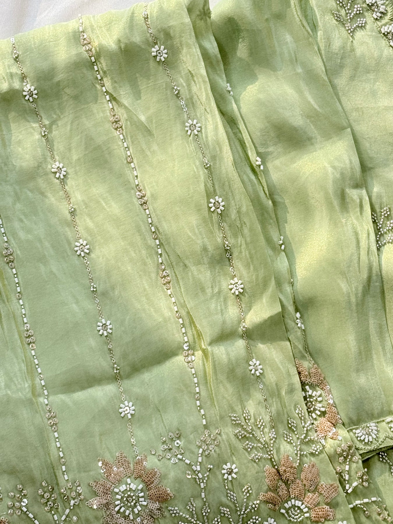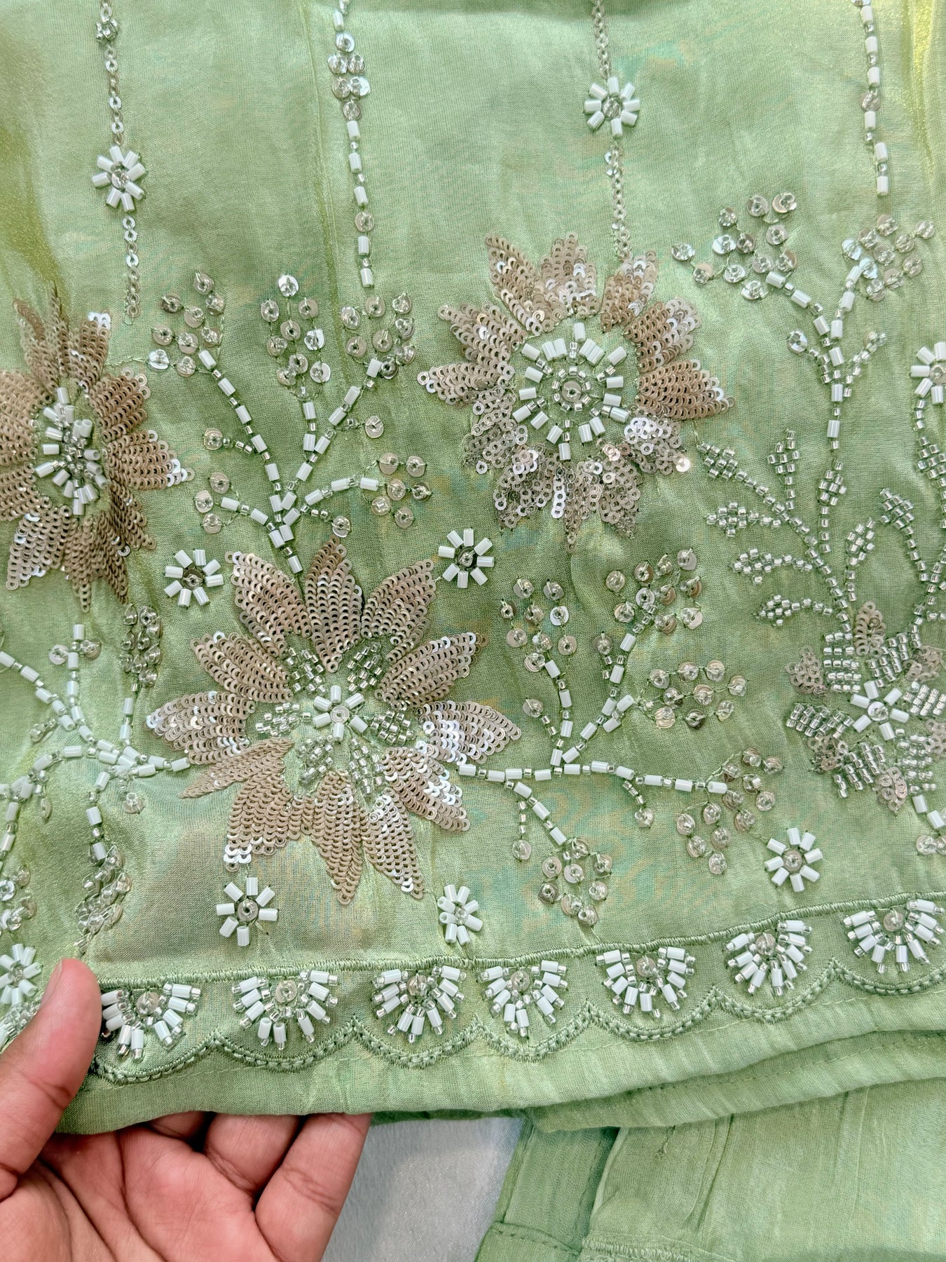 Top Shimmer material..... Short top style stitched with beautiful cut dana and moti work on front.....Pakistani style neck with handwork.... ,boarder work on daman and sleeves 20 inches......attached lining.....top length 32 inches