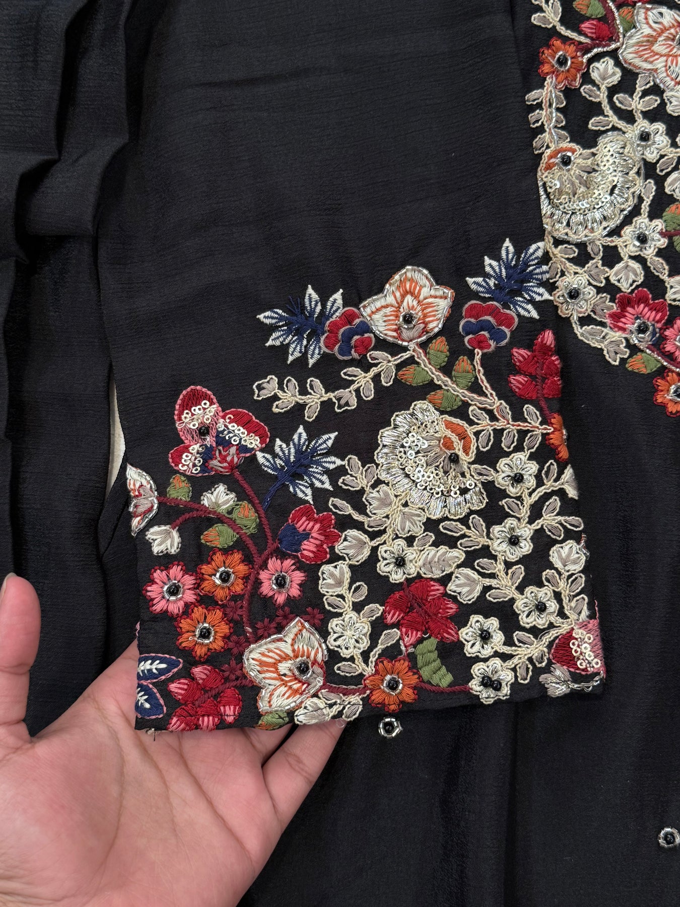 Top Shiffon material stitched with lining with beautiful beads handwork on front ,....... ,heavy boarder work on neck ,daman and sleeves 20 inches i......attached lining......top length 33Inches