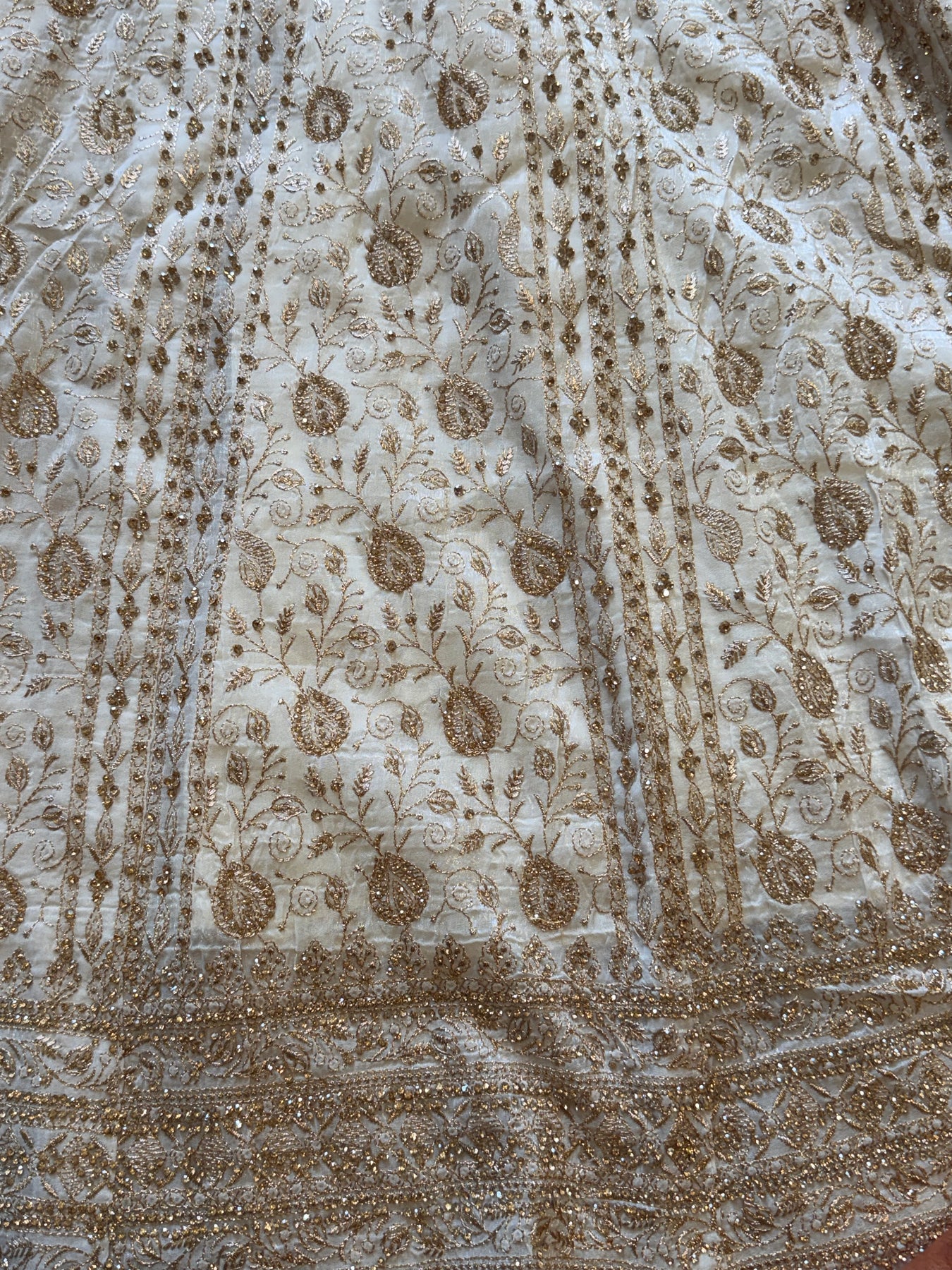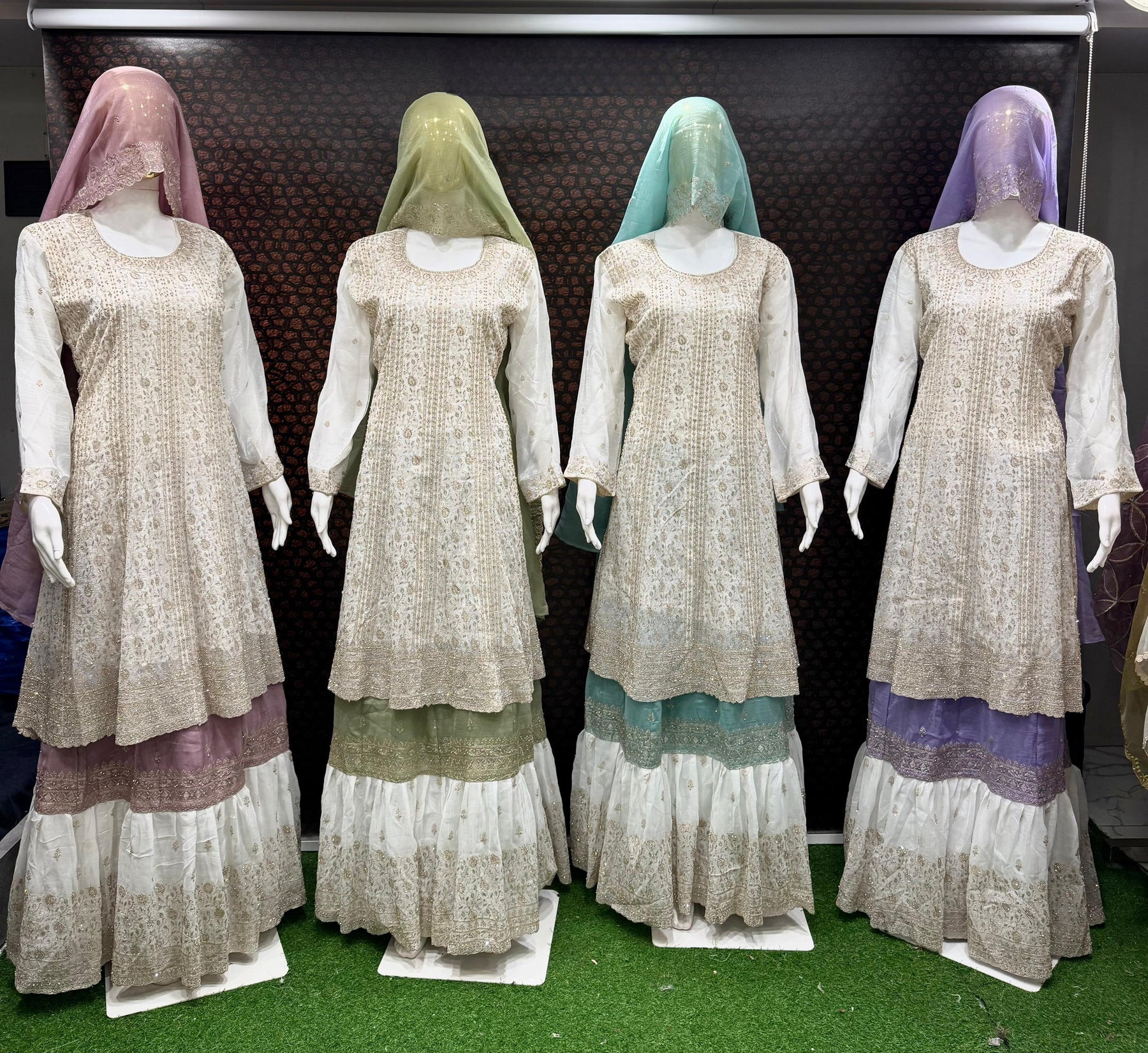 Ruheena Farshi Lahenga suit featuring a fully stitched top in crunchy crush fabric with zarkan embroidery and 20-inch embellished sleeves. The voluminous Farshi Lahenga bottom showcases heavy embroidery with frill and cancane detailing, available in two shades. Includes a 2.25-meter embroidered dupatta. Fits up to 44-inch chest; top length 42 inches, bottom length 41 inches.