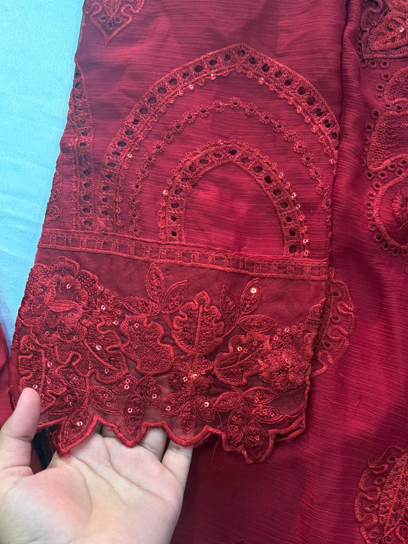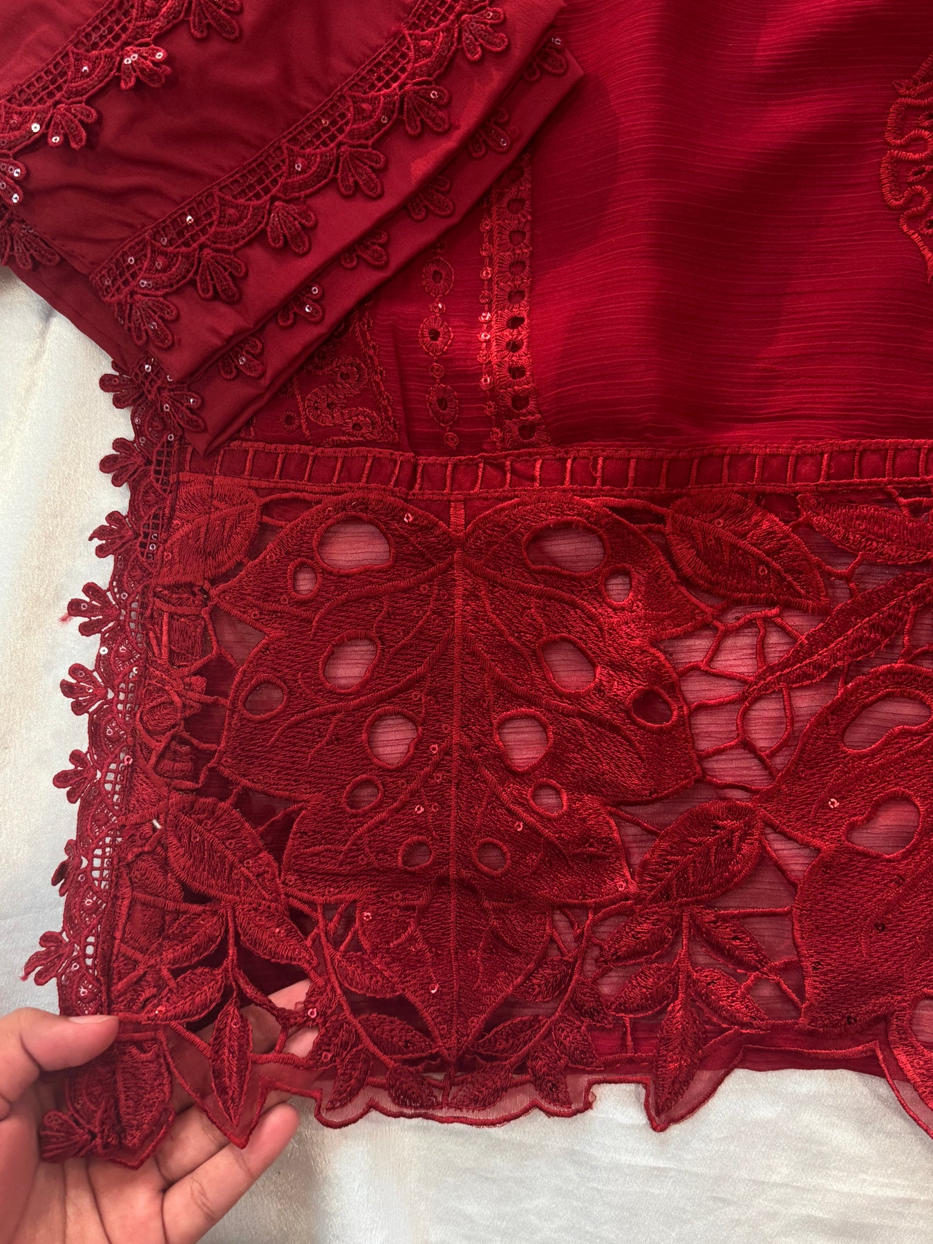 Top Stitches chiffon material with beautiful self embroidery and beads handwork on front ,....... ,heavy Cutwork boarder work on daman and  Sleeves......Pakistani style neck with stone and 3D flowers......top length 43 inches