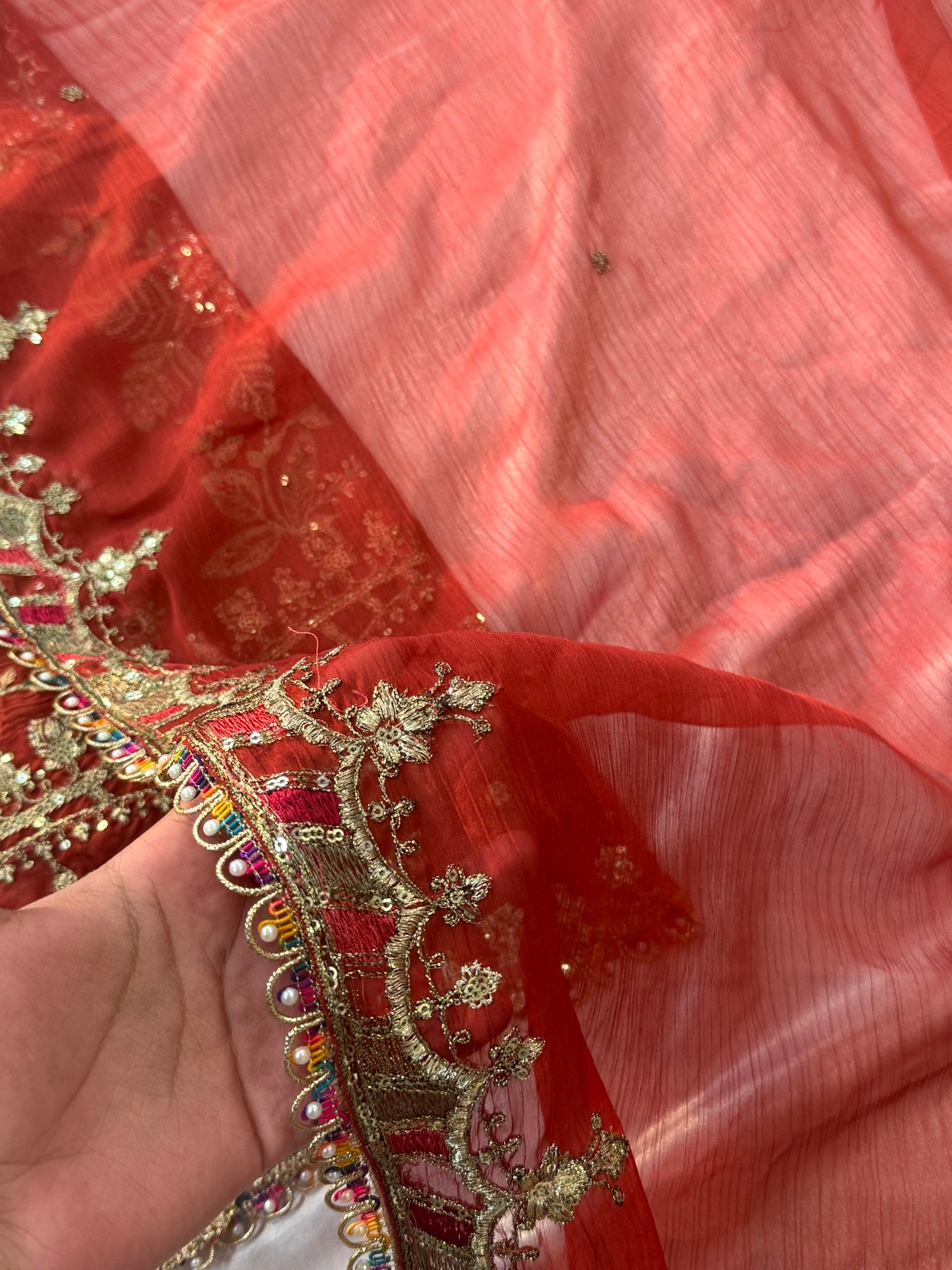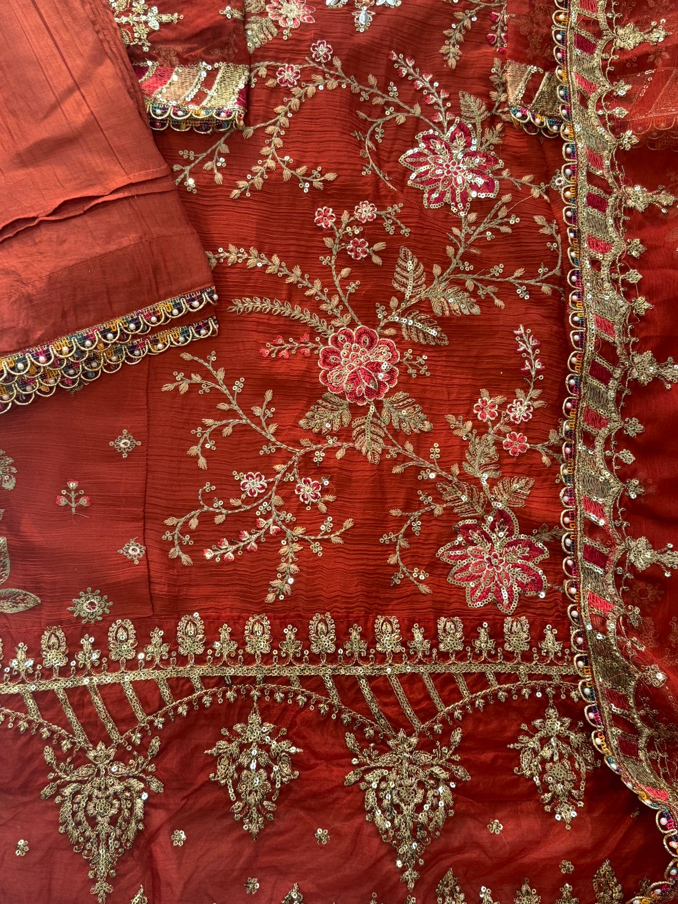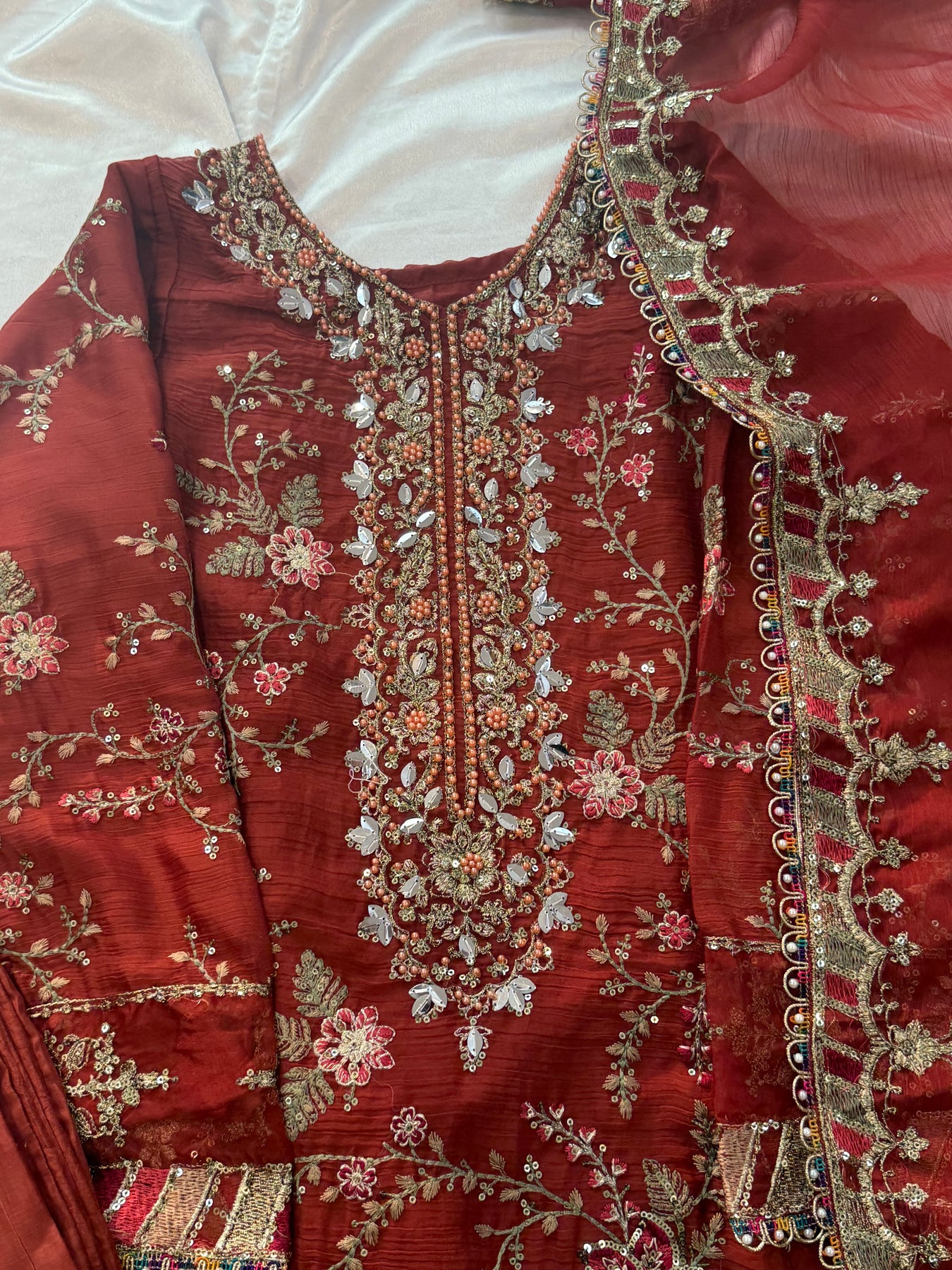 Top Stitches chiffon material with beautiful self embroidery and beads handwork on front ,....... ,heavy Cutwork boarder work on daman and Sleeves......Pakistani style neck with stone and 3D flowers......top length 43 inches
