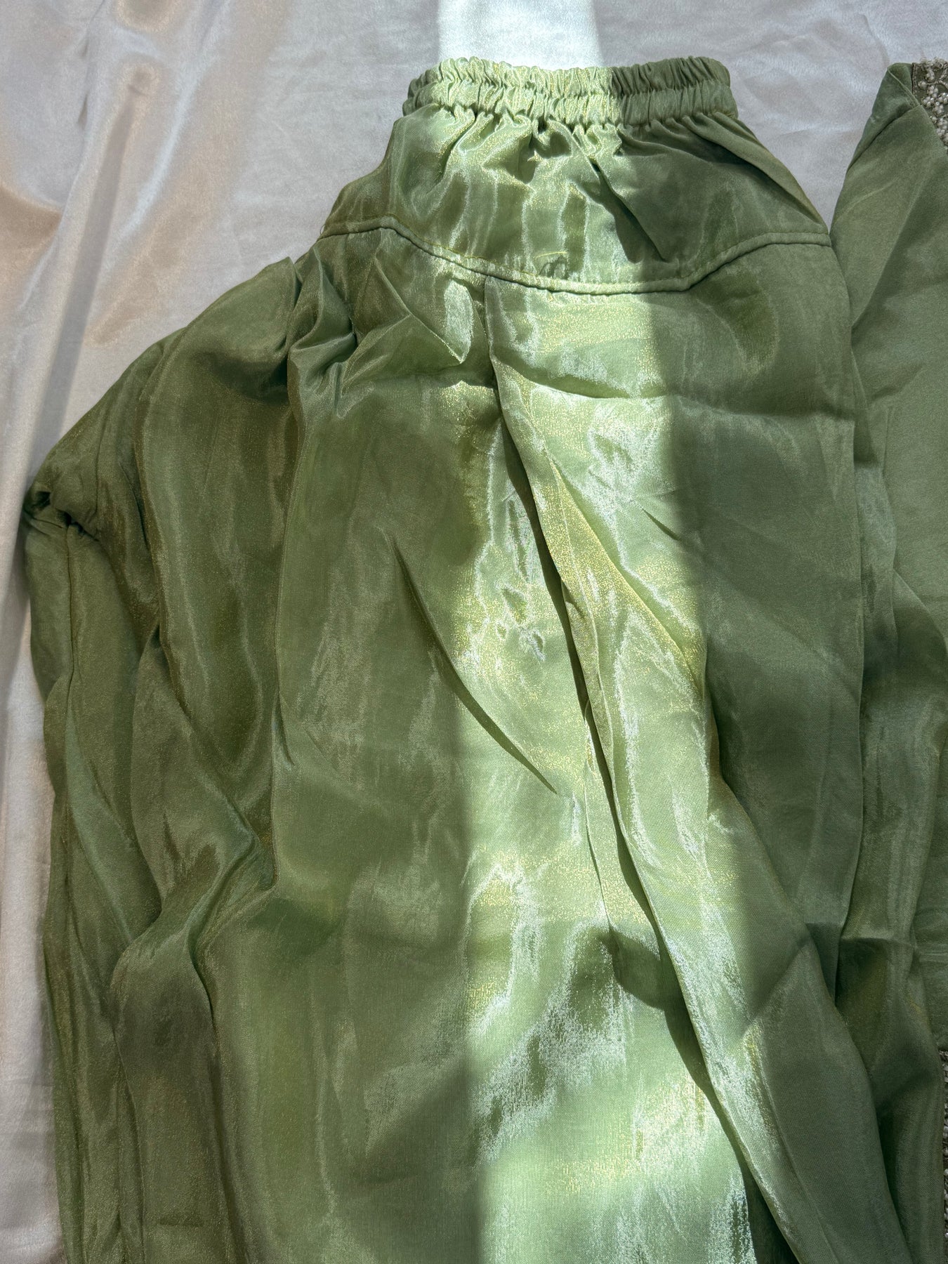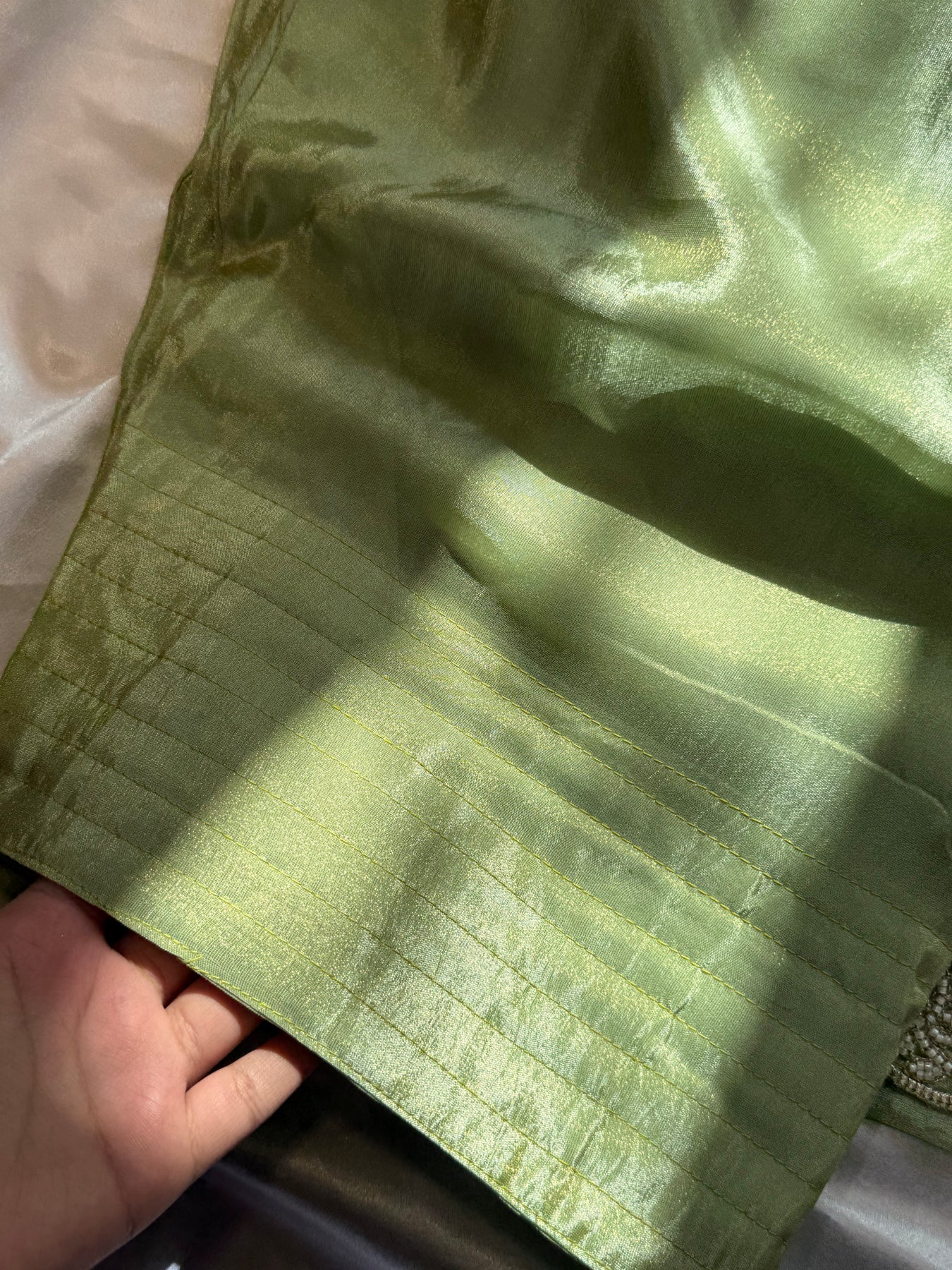 Top shimmar organza material stitched with C cut style with beautiful pearl work neck ,sleeves and  on front daman and sleeves .....attached lining......top length 34 inches