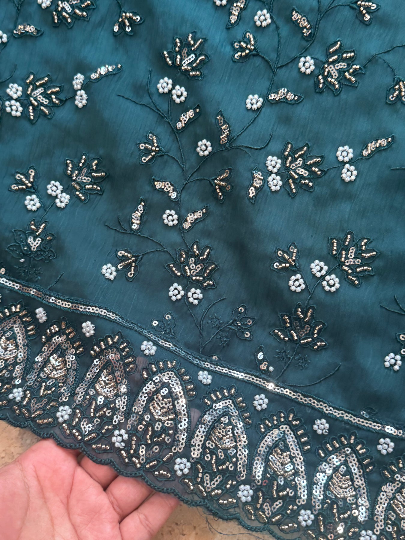 Top shimmar Organza material with heavy Handwork boarder on front.....Pearl and Sequence work...Length 44 inches....56 bust can be stitched