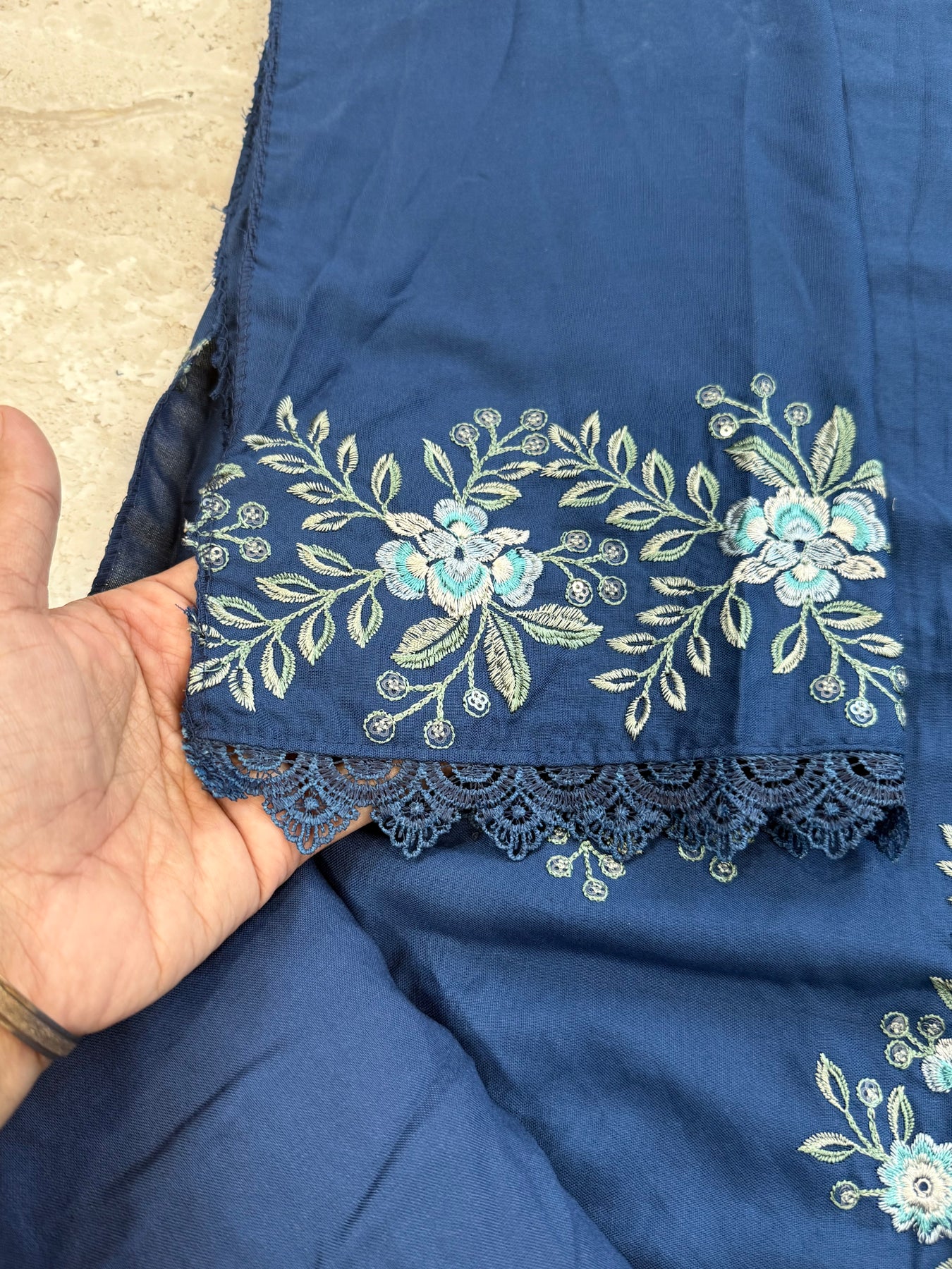 Top Rayon cotton designer un-stitched material with beautiful self embroidery on front with lace on Daman.....bust 54 Inches can be stitched..length 48inches...