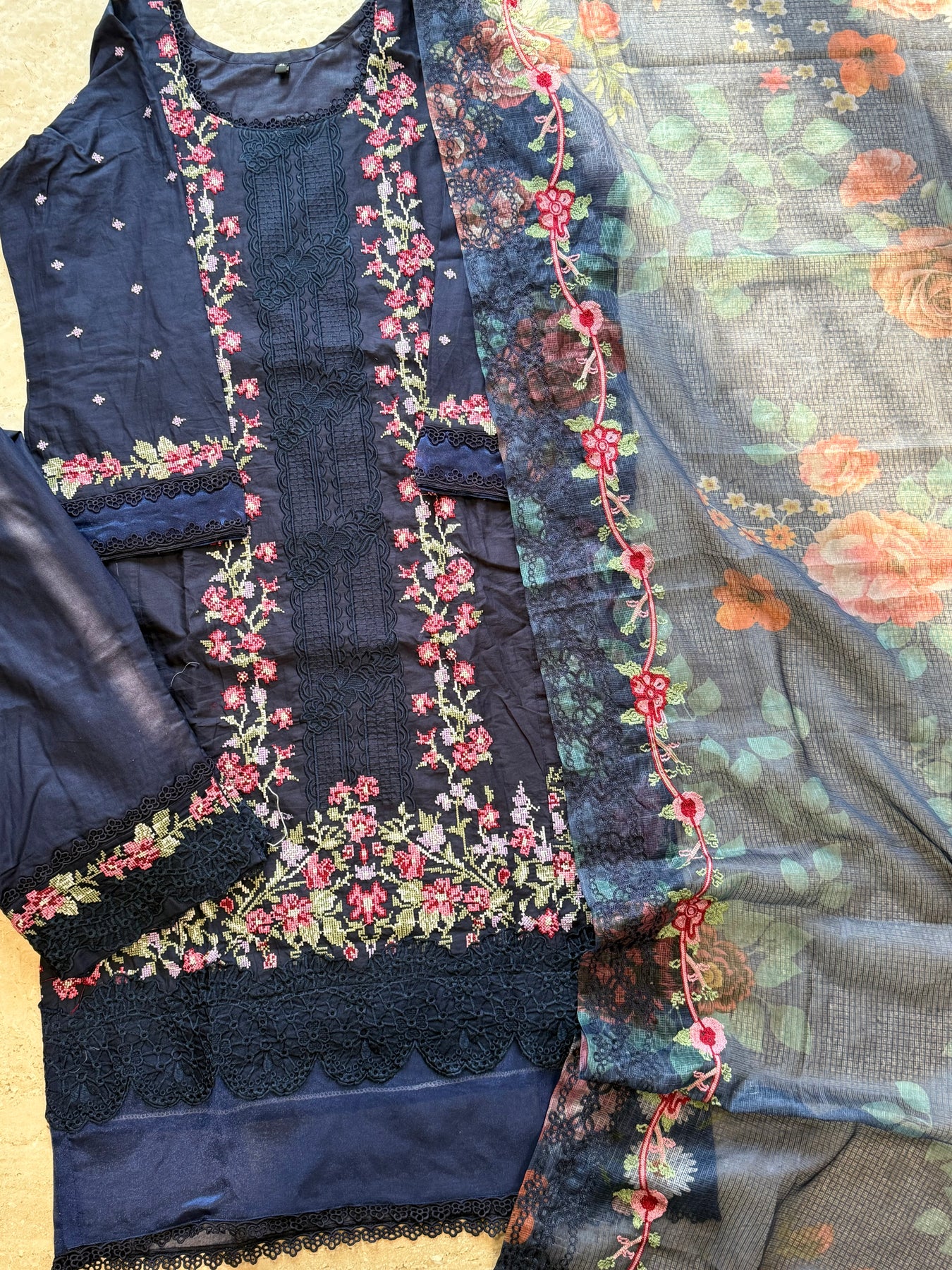 Top pure cotton designer stitched with lining.... beautiful self embroidery on front.... pakistani style neck with patch and laces ... Extra lace on front top.....length 44 inches...