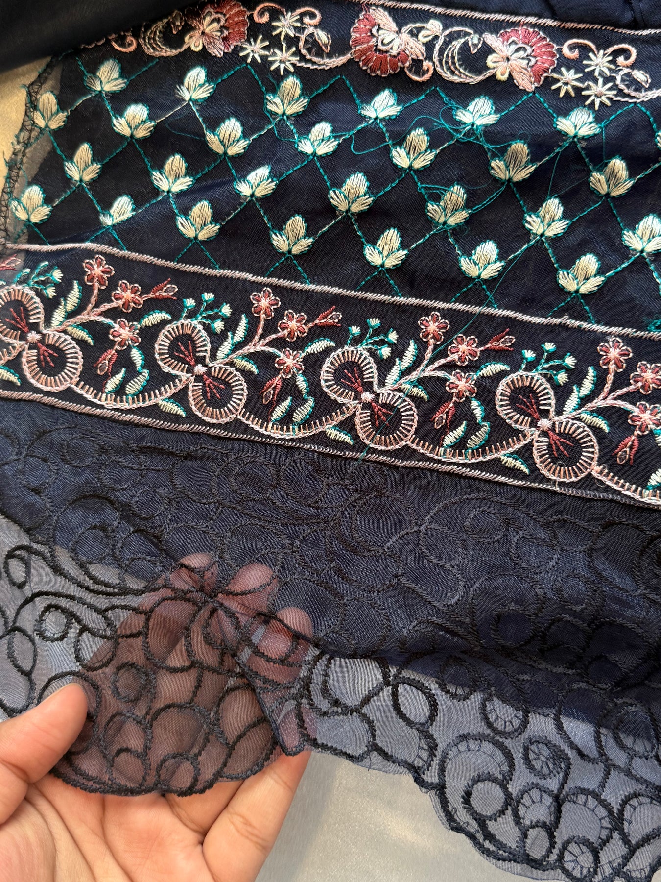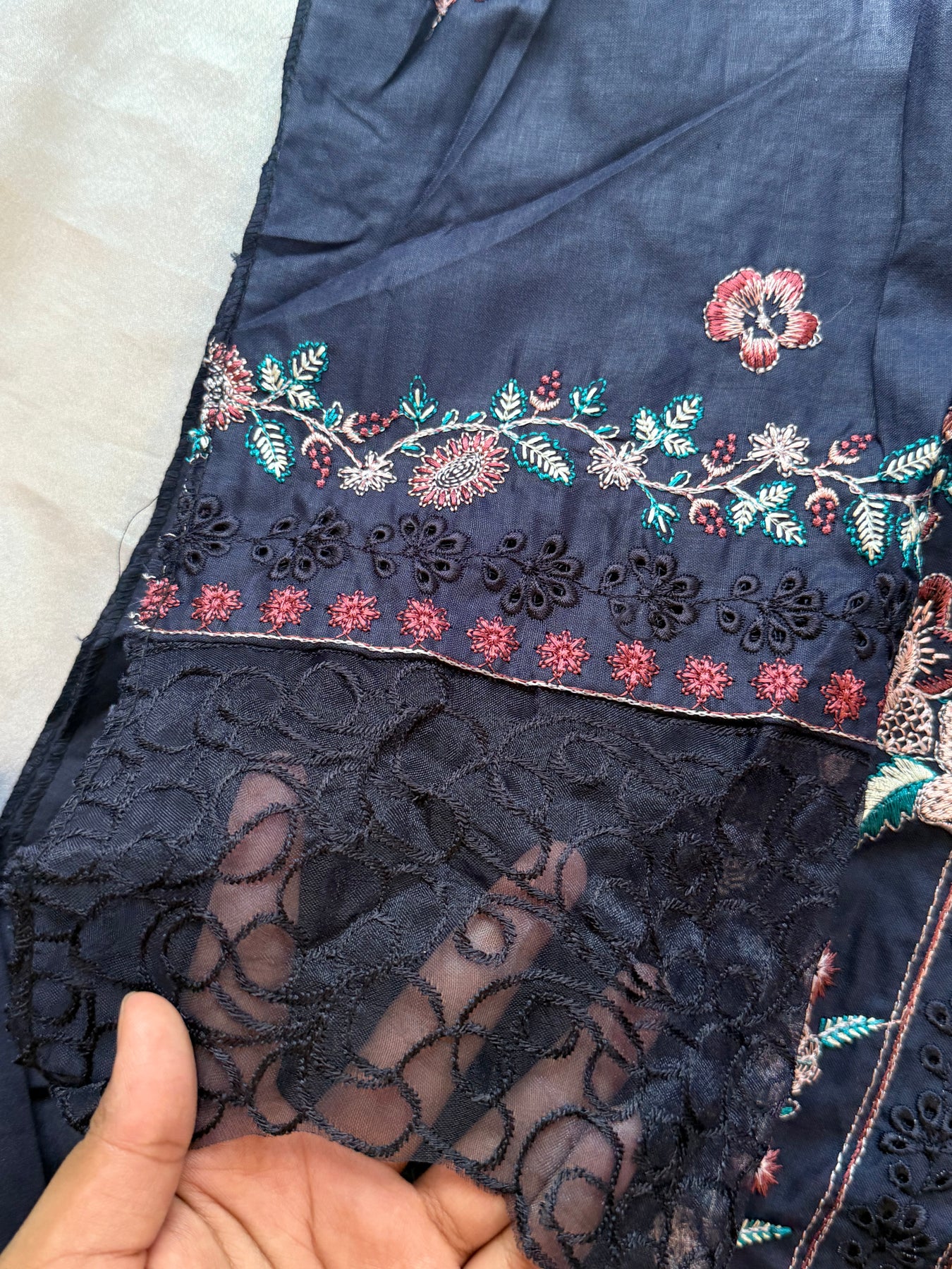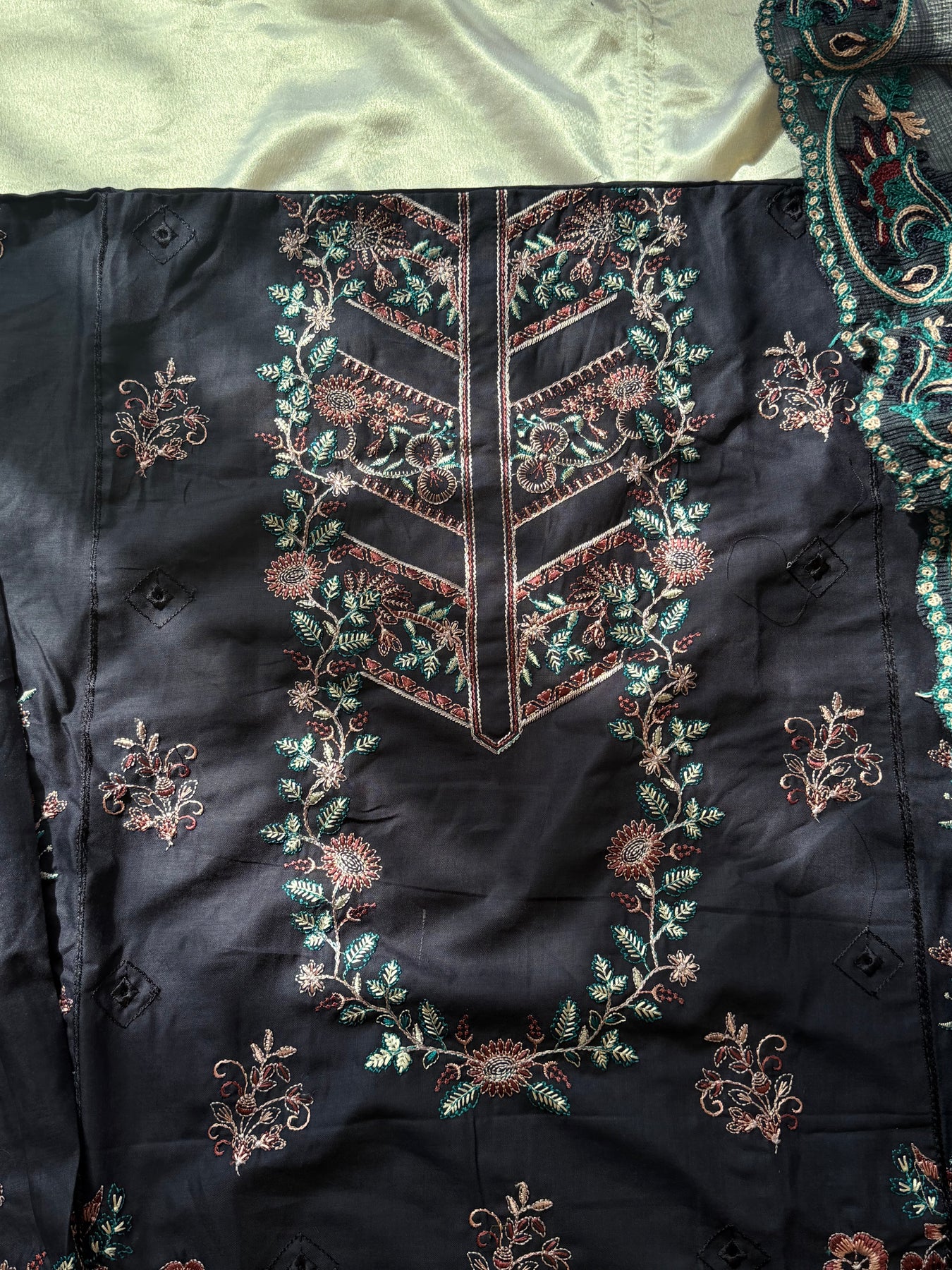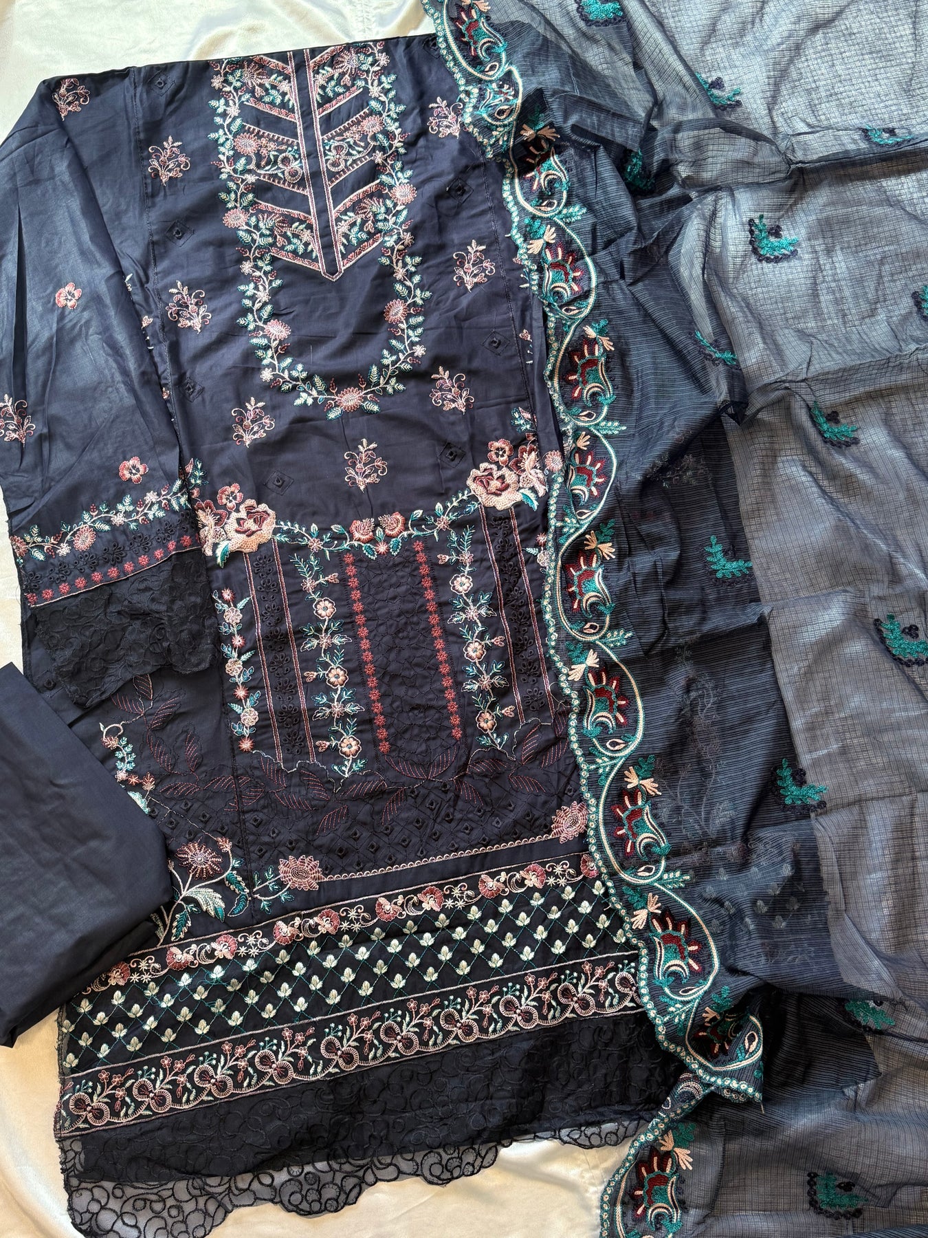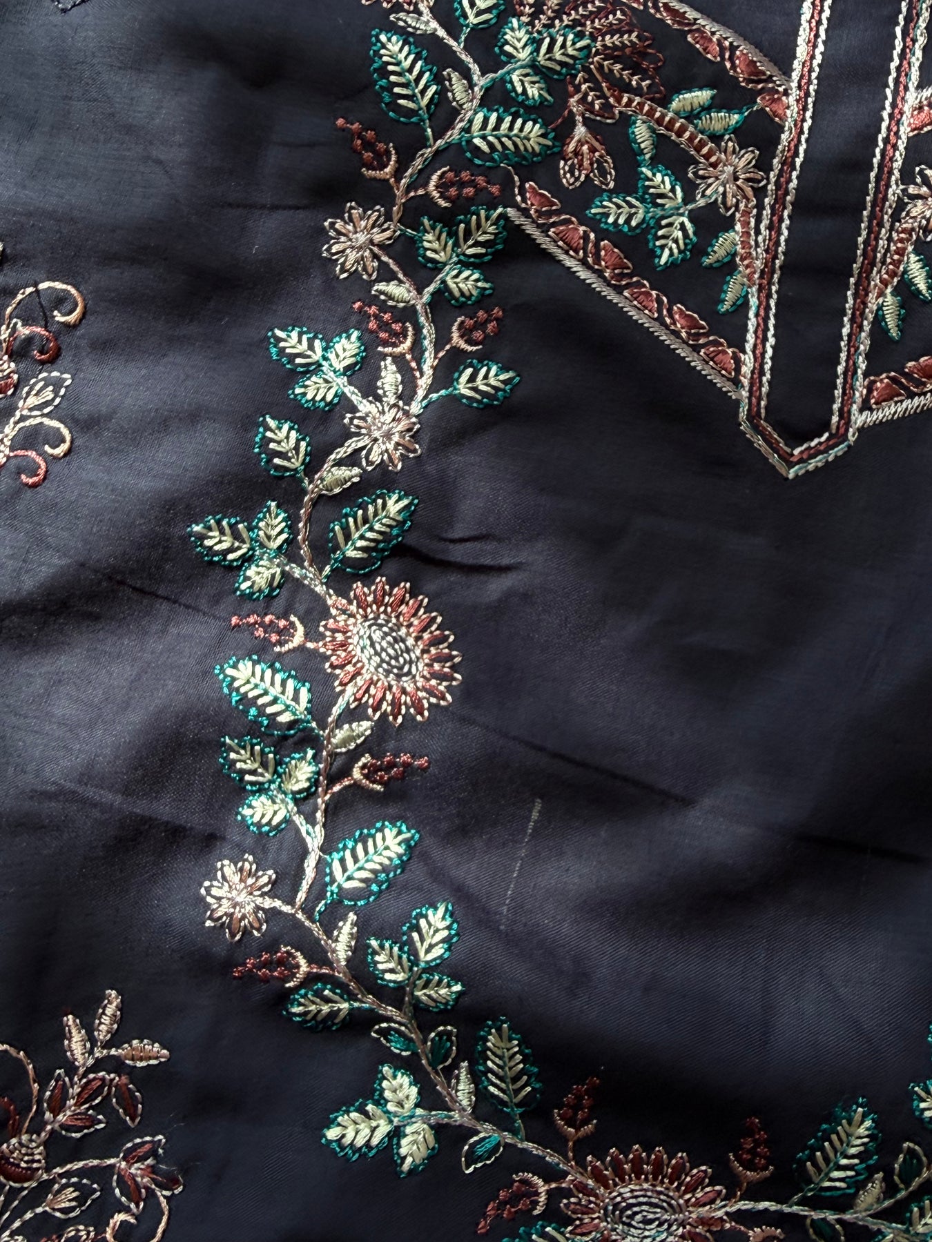 Top pure cotton designer un-stitched material with beautiful self embroidery and patch on front top......bust 54 Inches can be stitched..length 45 inches...