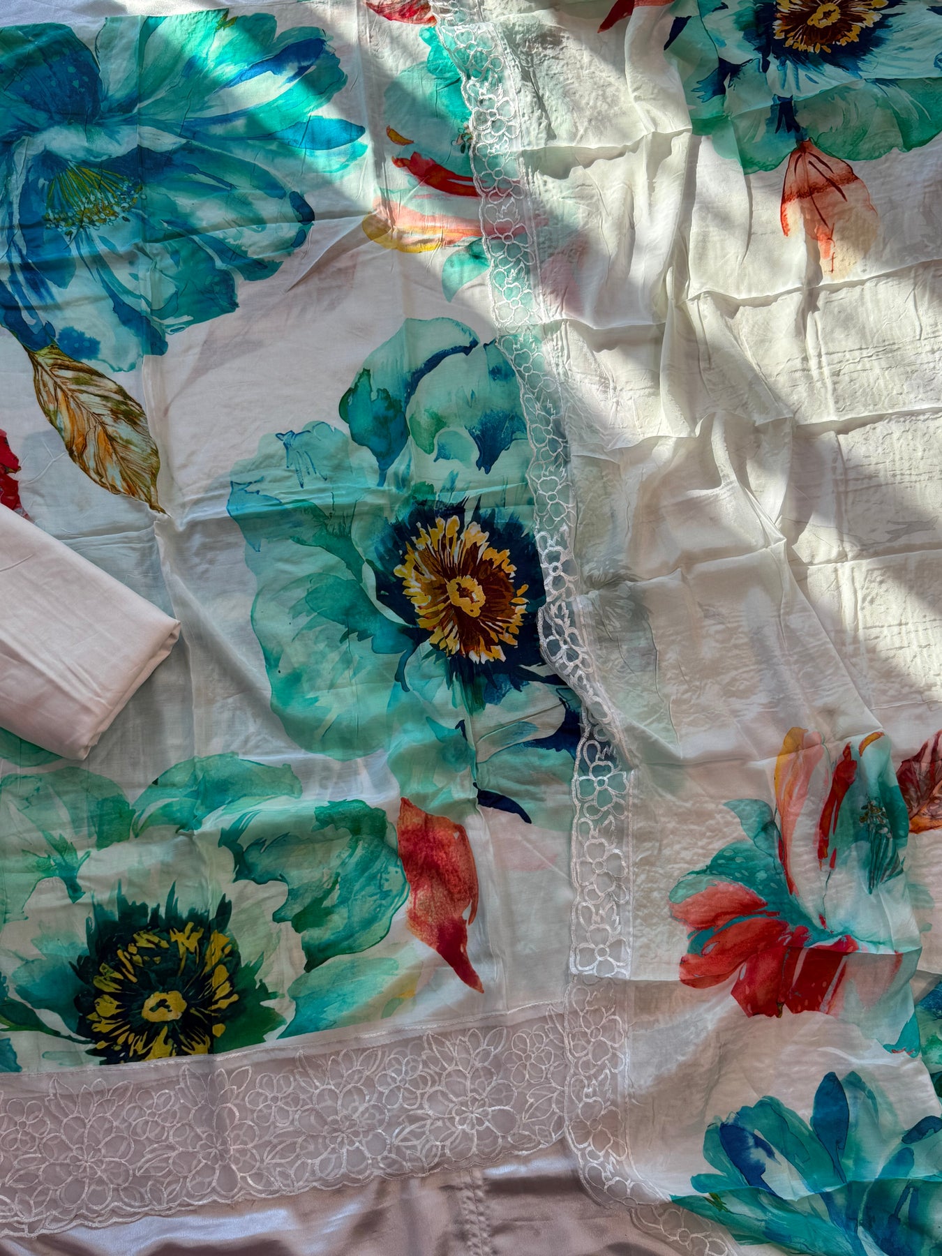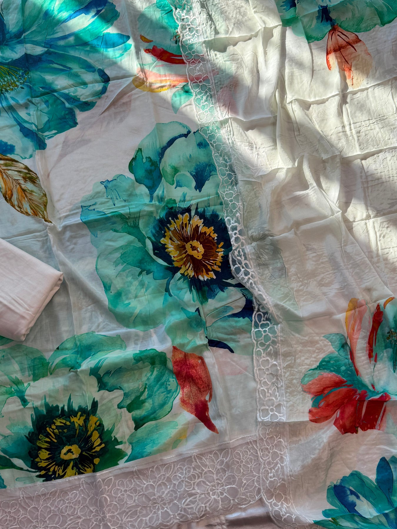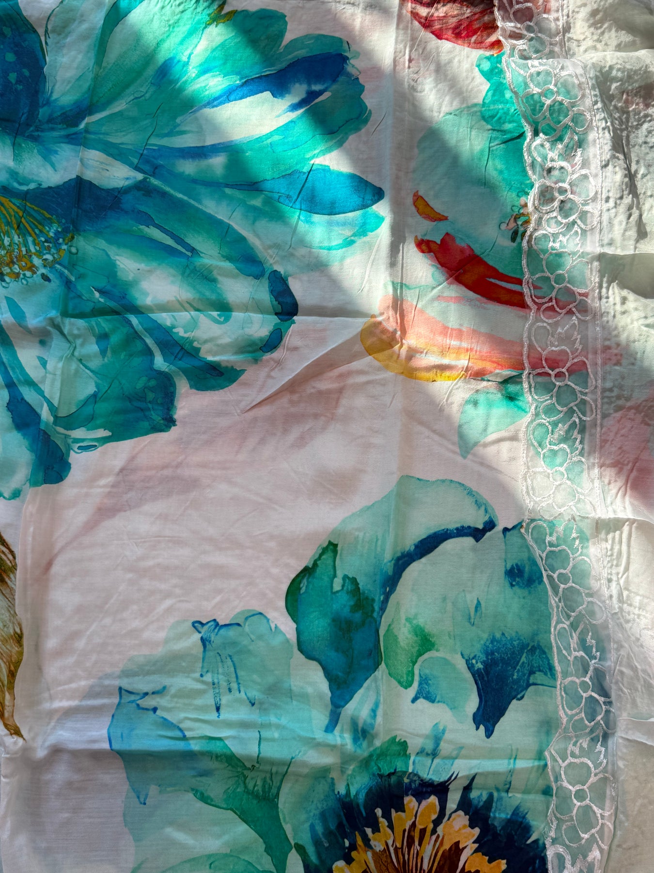 Top Pure Muslin digital printed with beautiful laces on Daman and sleeves ...length 47 Inches....Bust 56can be stitched....extra material for sleeves