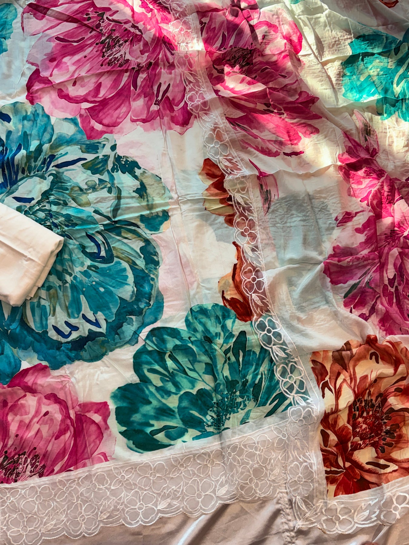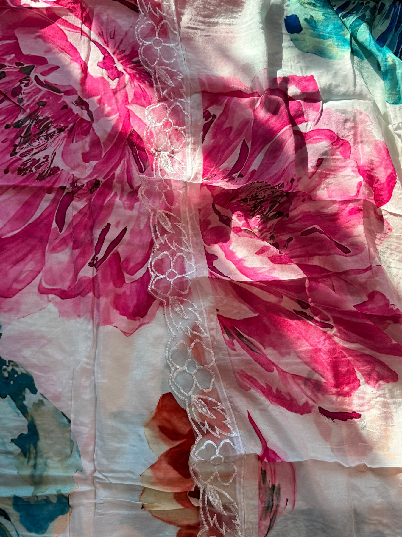 Top Pure Muslin digital printed with beautiful laces on Daman and sleeves ...length 47 Inches....Bust 56 can be stitched....extra material for sleeves