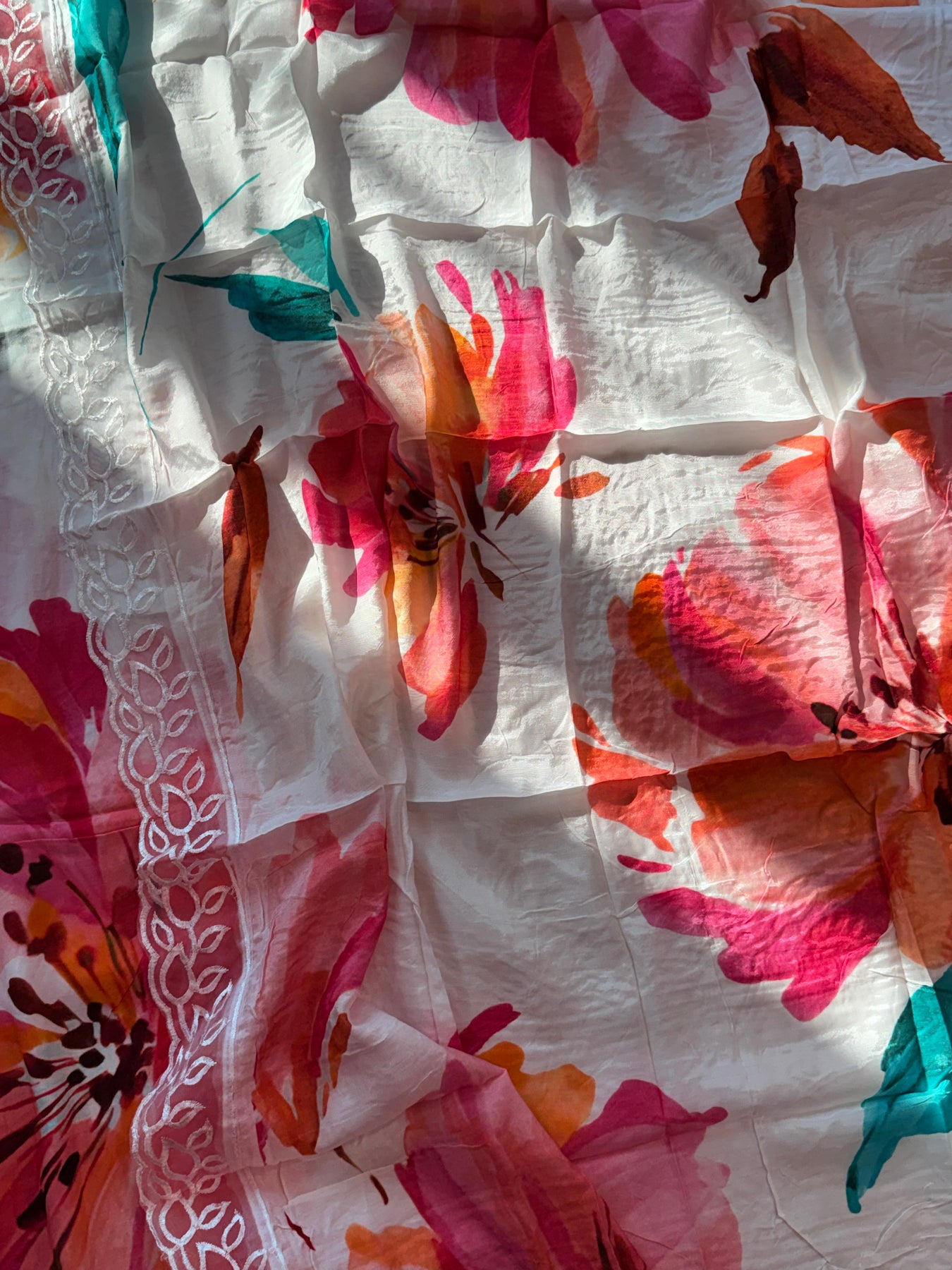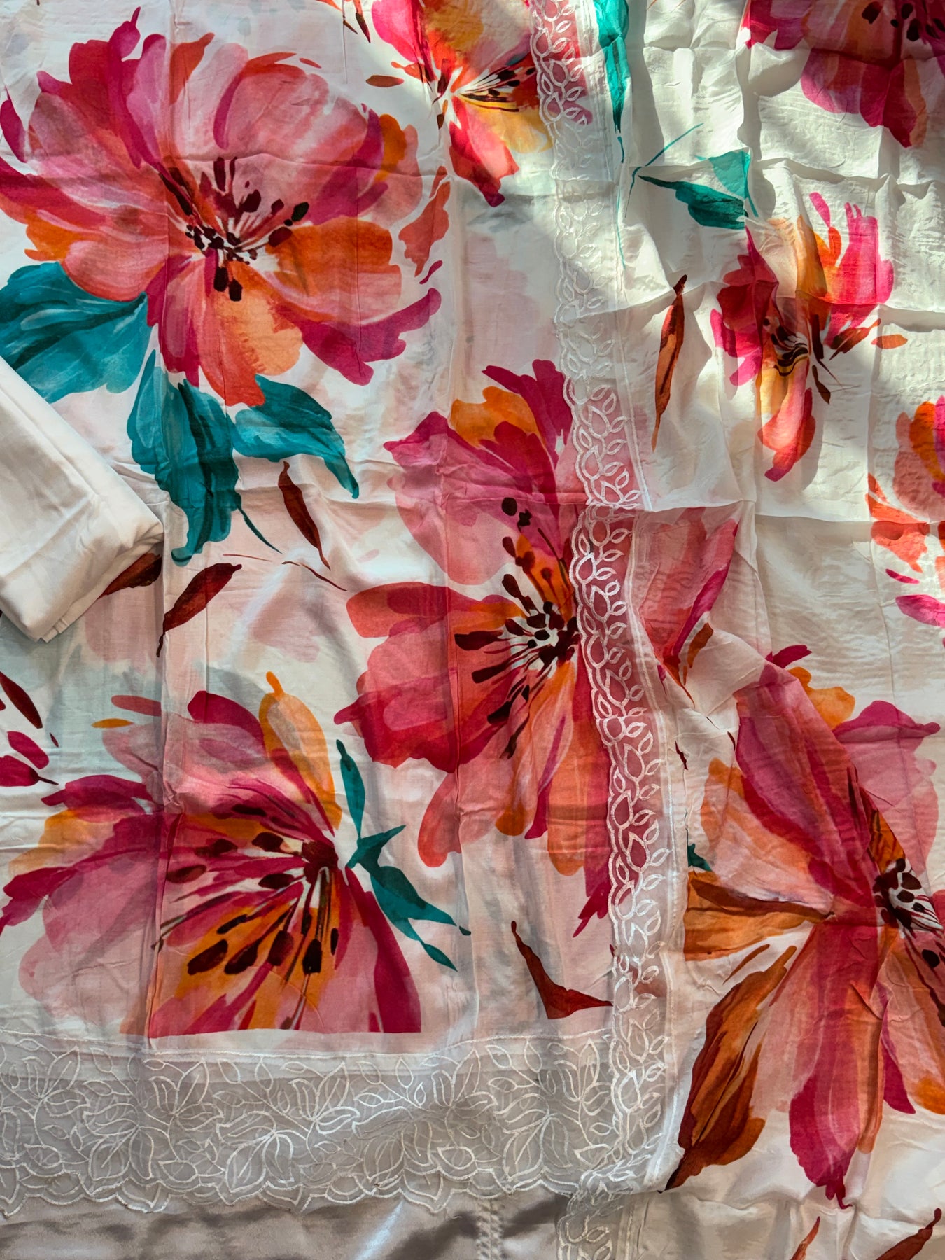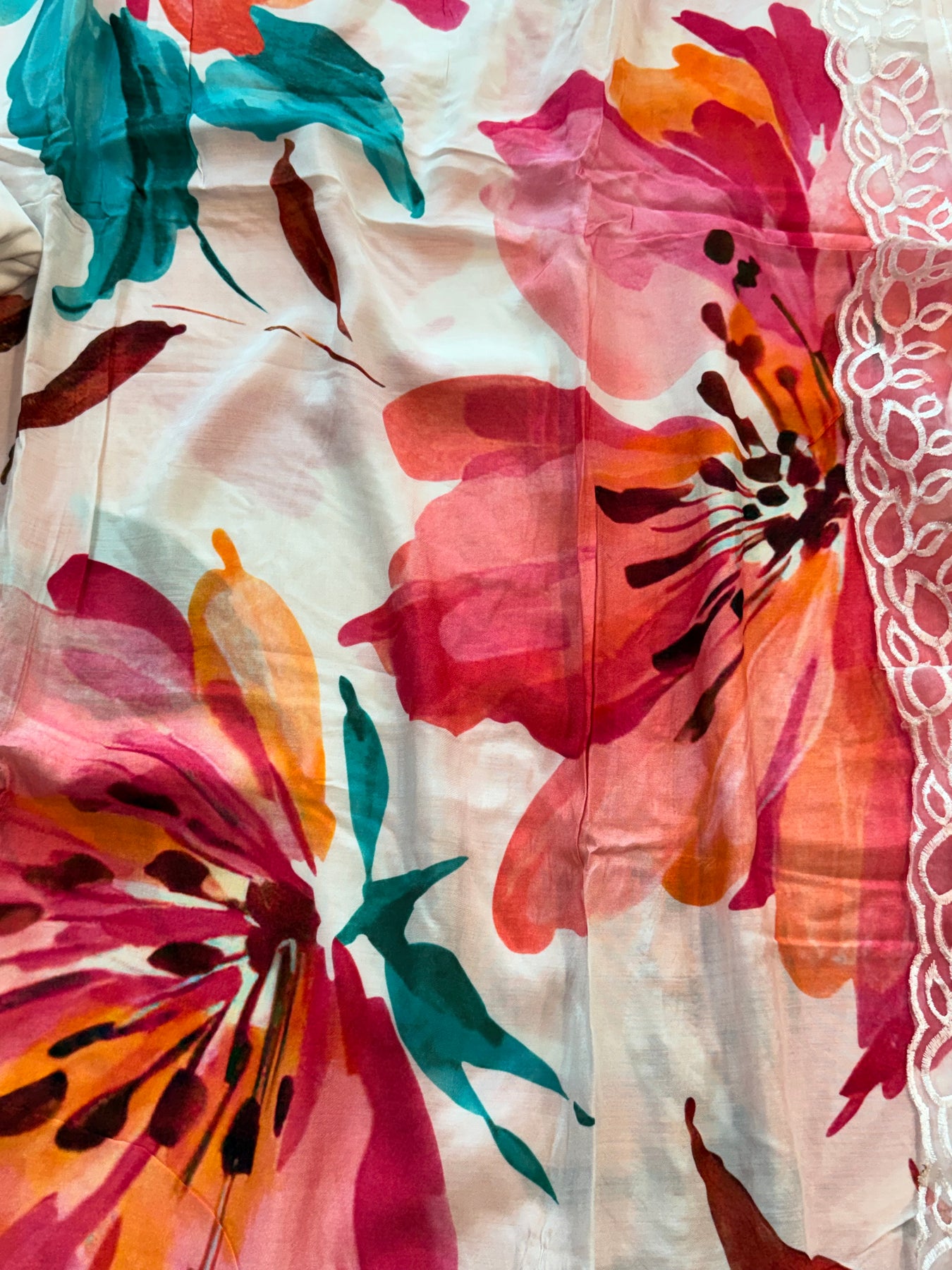 Top Pure Muslin digital printed with beautiful laces on Daman and sleeves ...length 48 Inches....Bust 60 can be stitched....extra material for sleeves