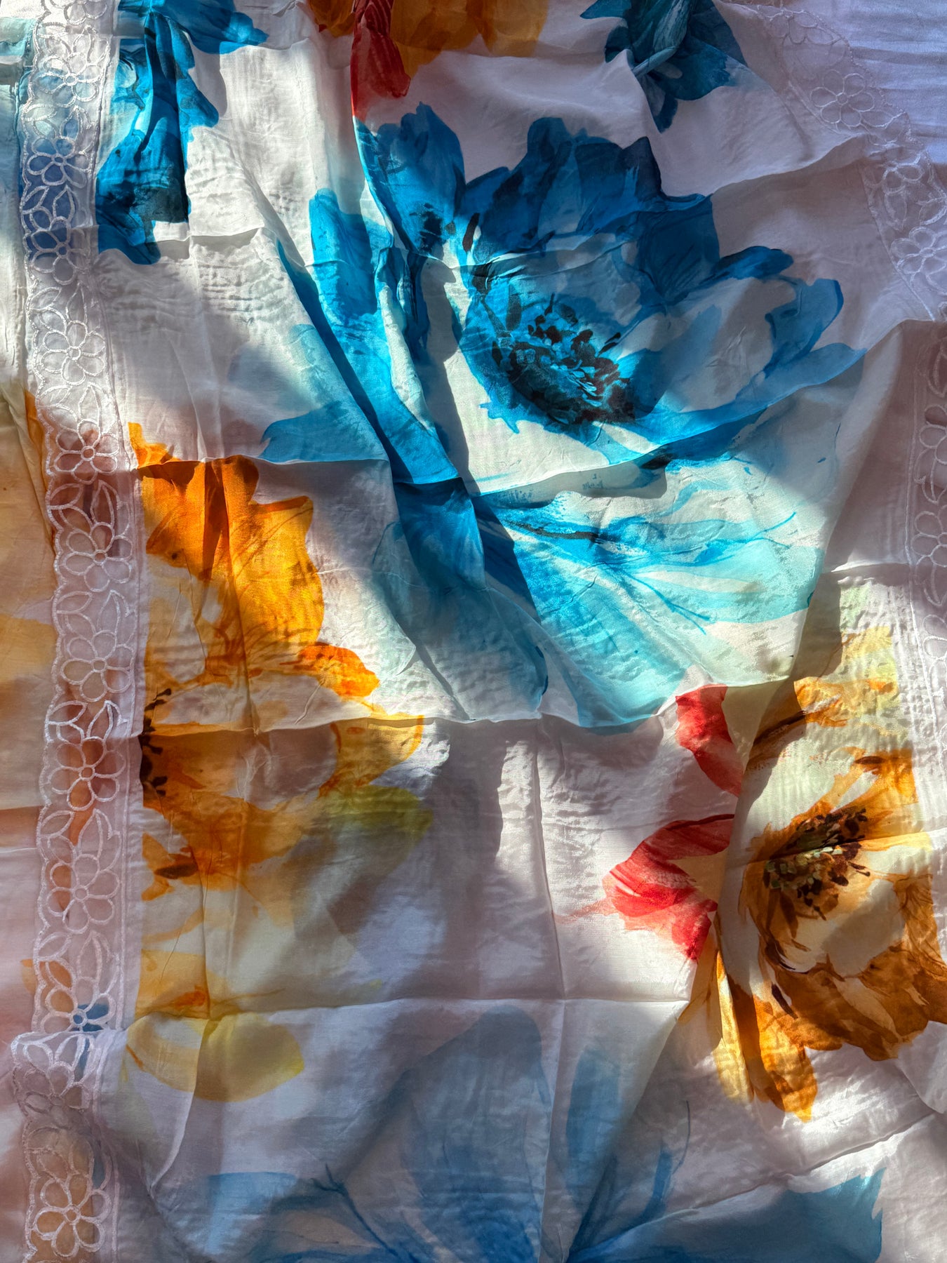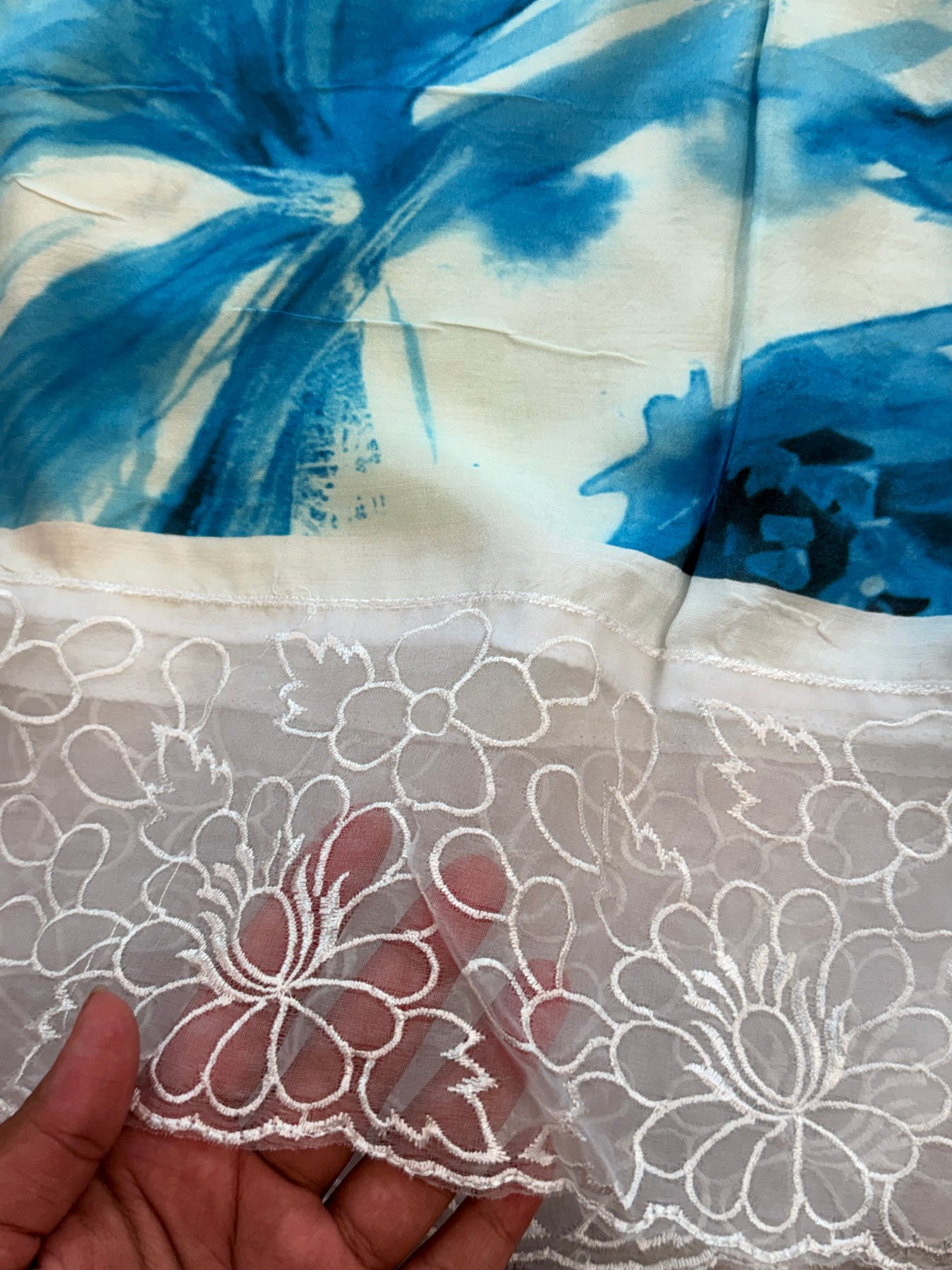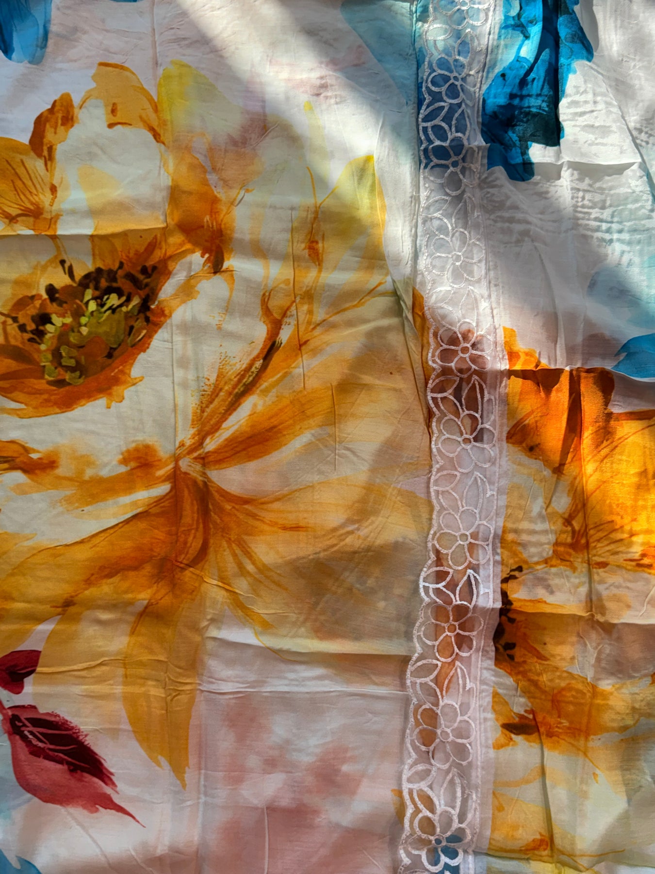 Top Pure Muslin digital printed with beautiful laces on Daman and sleeves ...length 48 Inches....Bust 60 can be stitched....extra material for sleeves