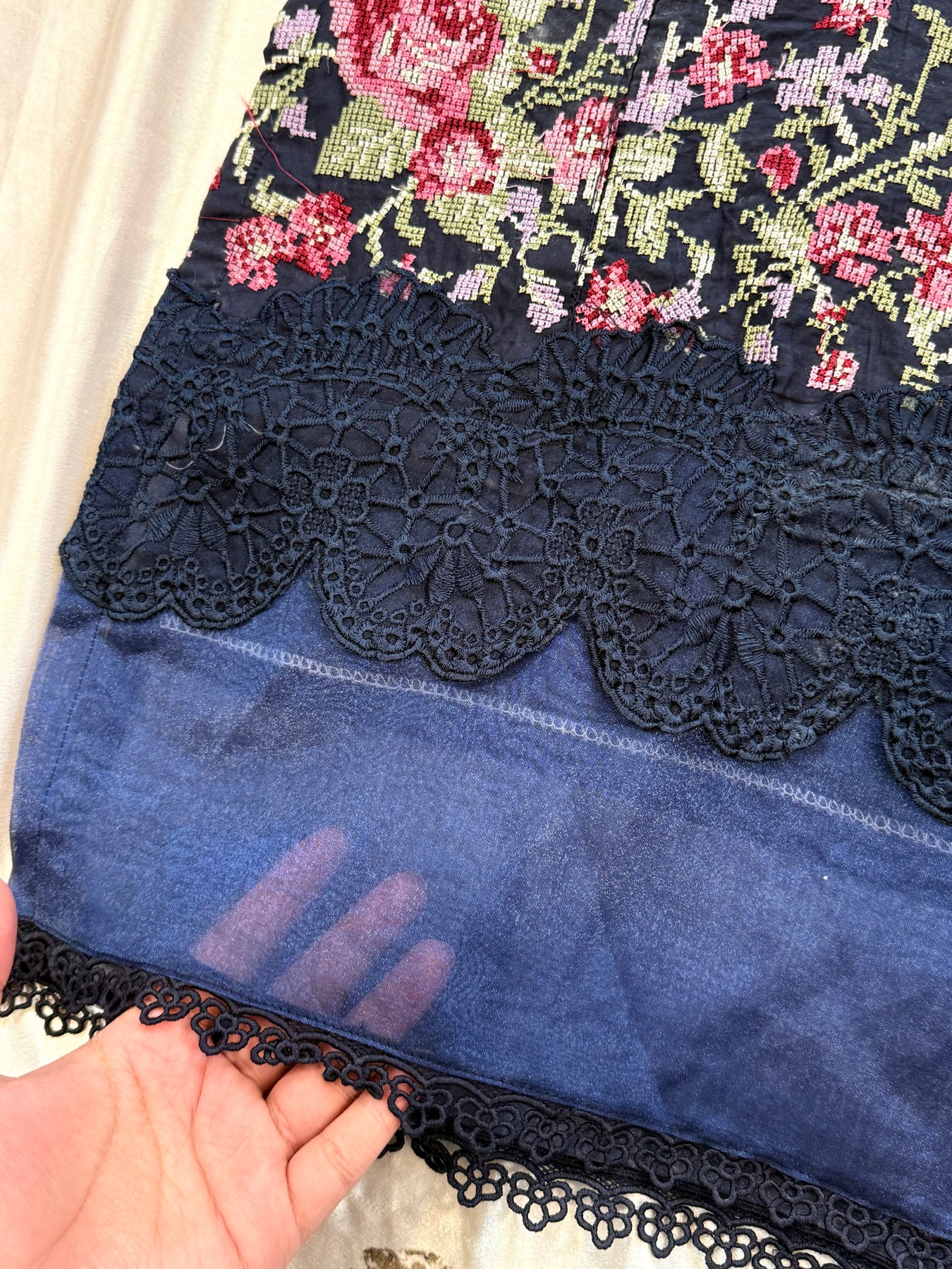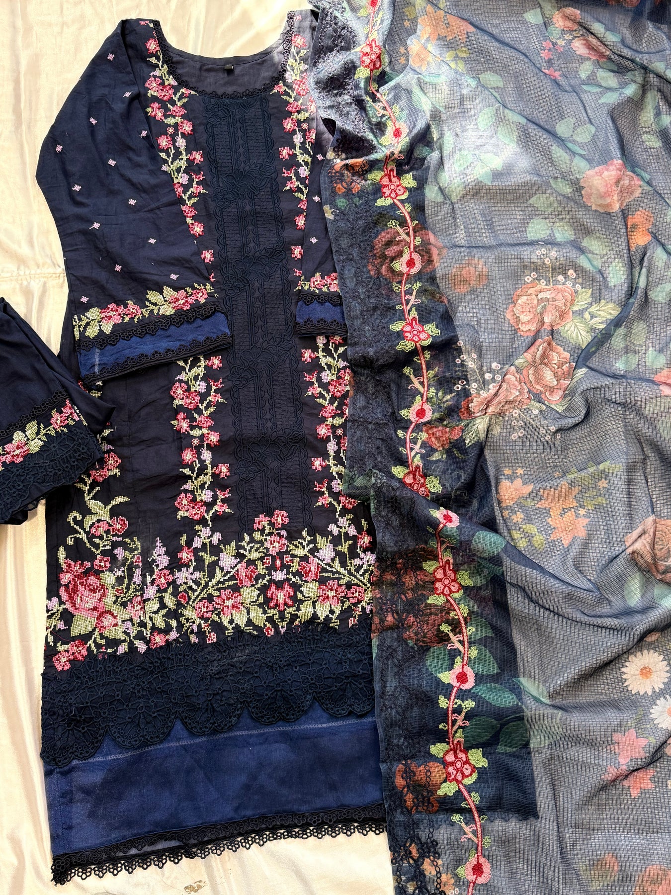 Top pure cotton designer stitched with lining.... beautiful self embroidery on front.... pakistani style neck with patch and laces ... Extra lace on front top.....length 44 inches...