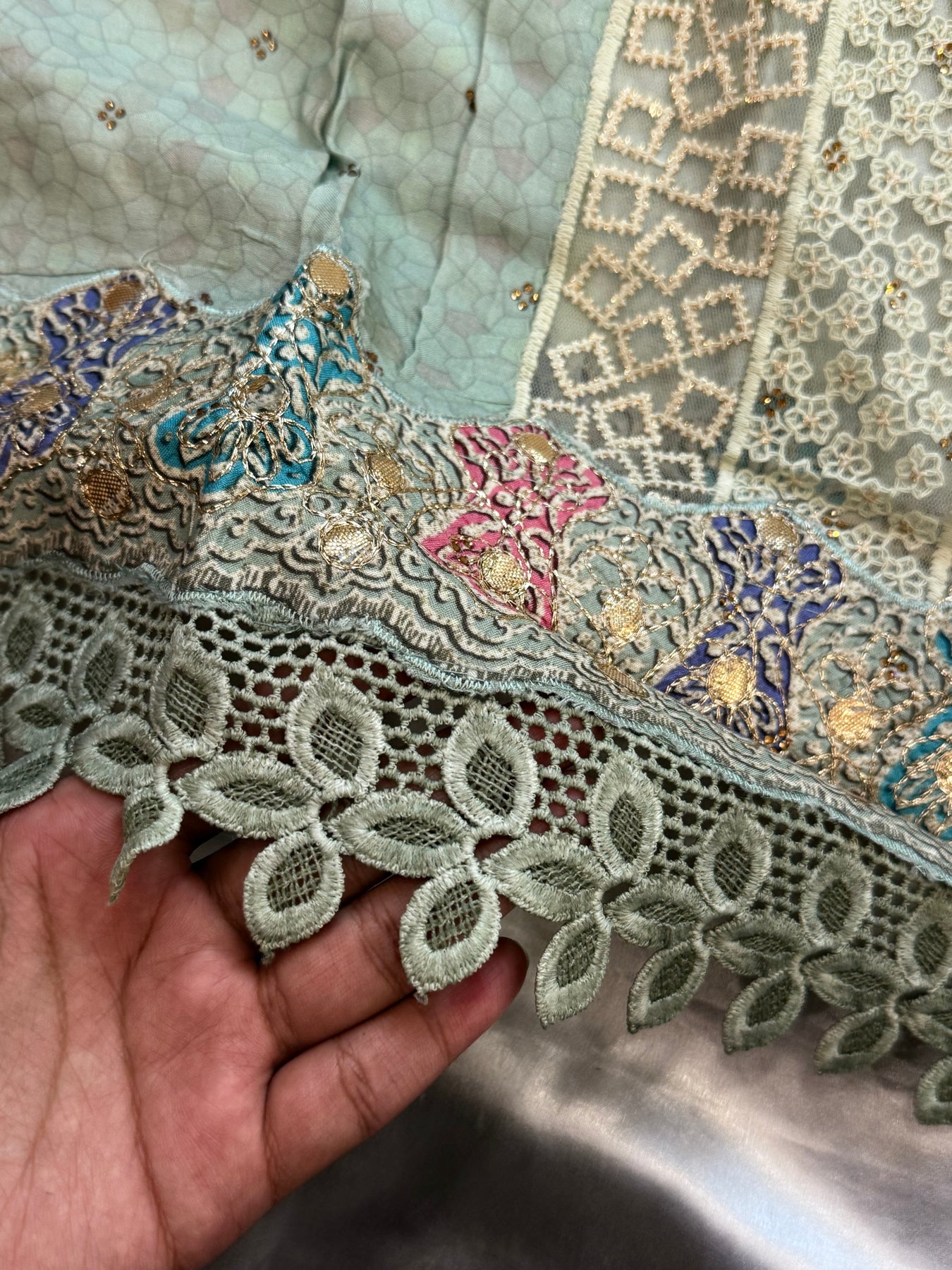 Top pure Crepe Digital printed.. Heavy embroidery panel and velvet patch with beautiful imported lace on front ...length 46 Inch..Bust 56 can be stitched....extra material for sleeves