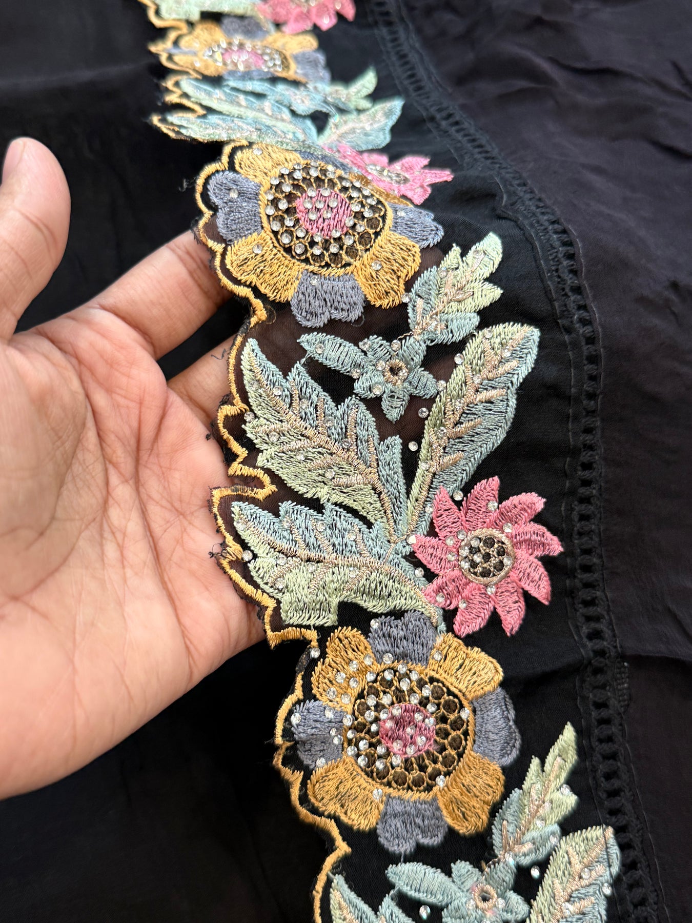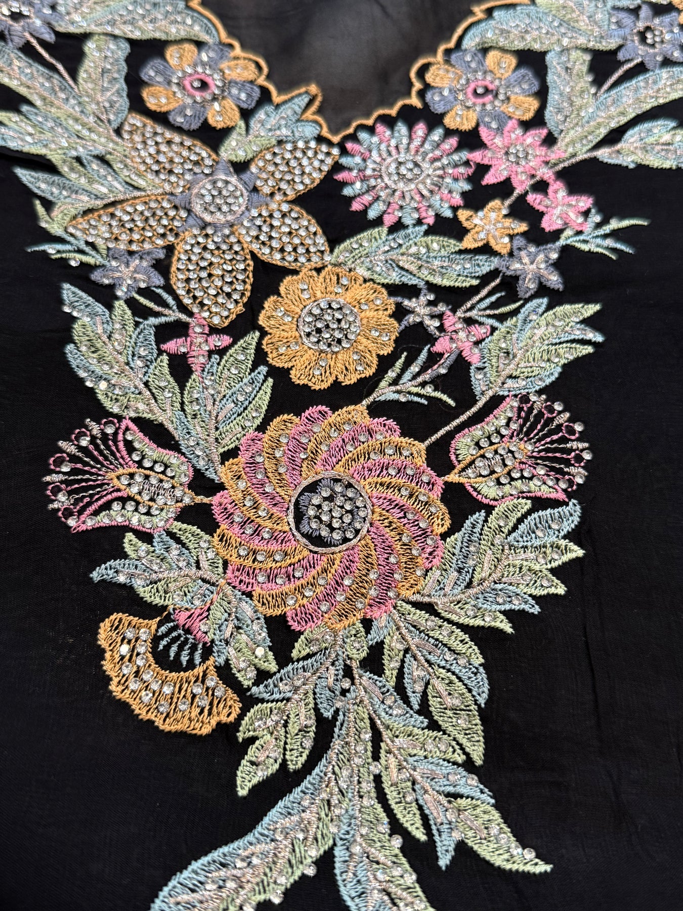 Top pure Organza material with heavy embroidery on neck and front....thread and stone heavy embroidery Length 45 inches....54 bust can be stitched…..embroidered sleeves