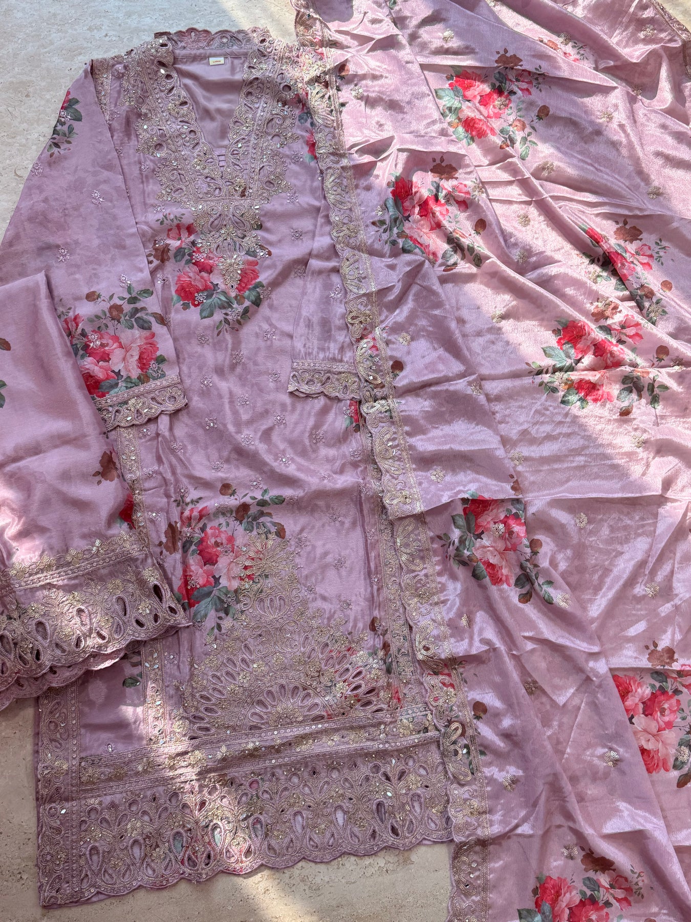 Cutwork embroidery on sleeves and Daman..