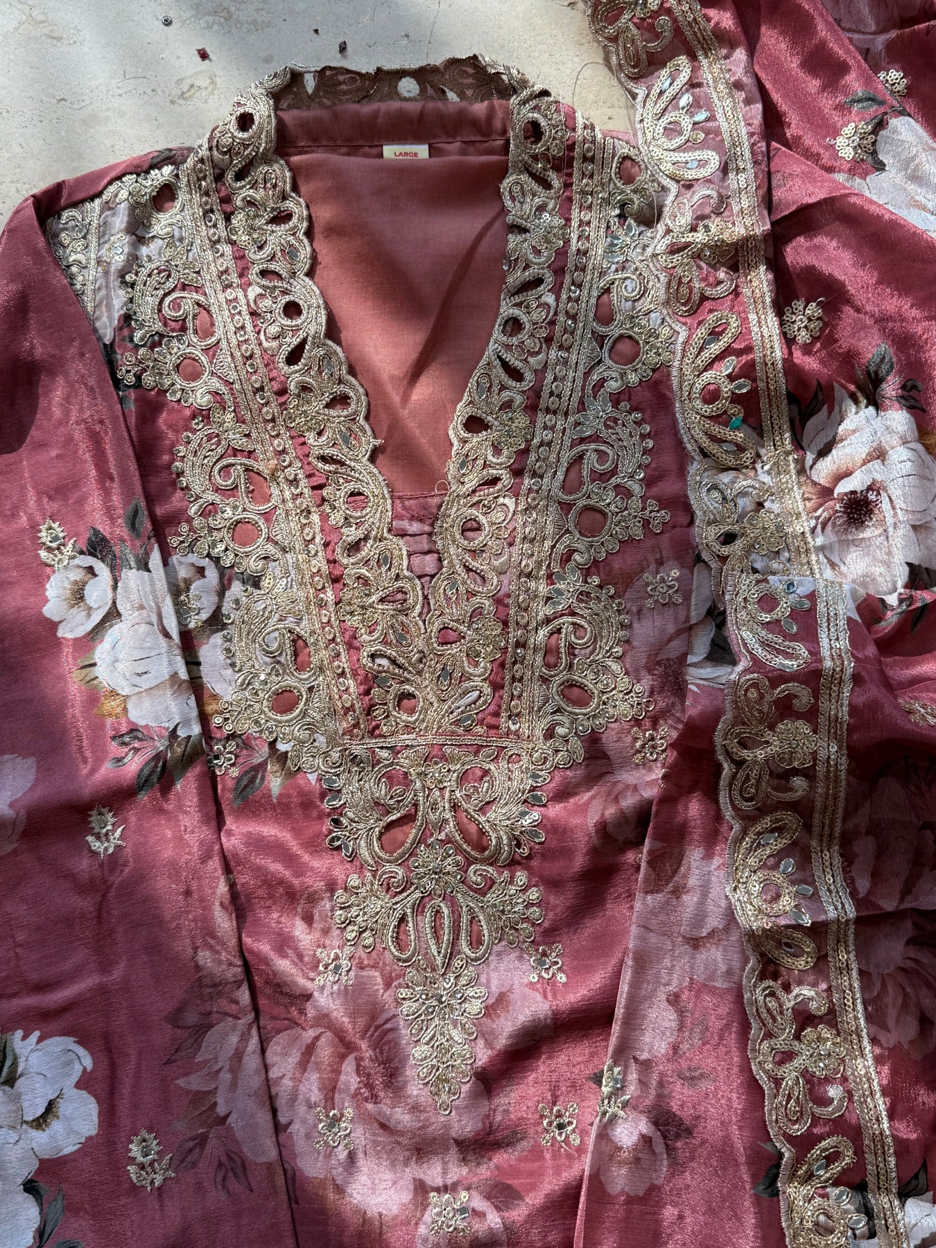 Top Chinnon silk designer stitched with beautiful cutwork and sequence embroidery...heavy sleeves work19 INCHES..lenght 46 with attached lining