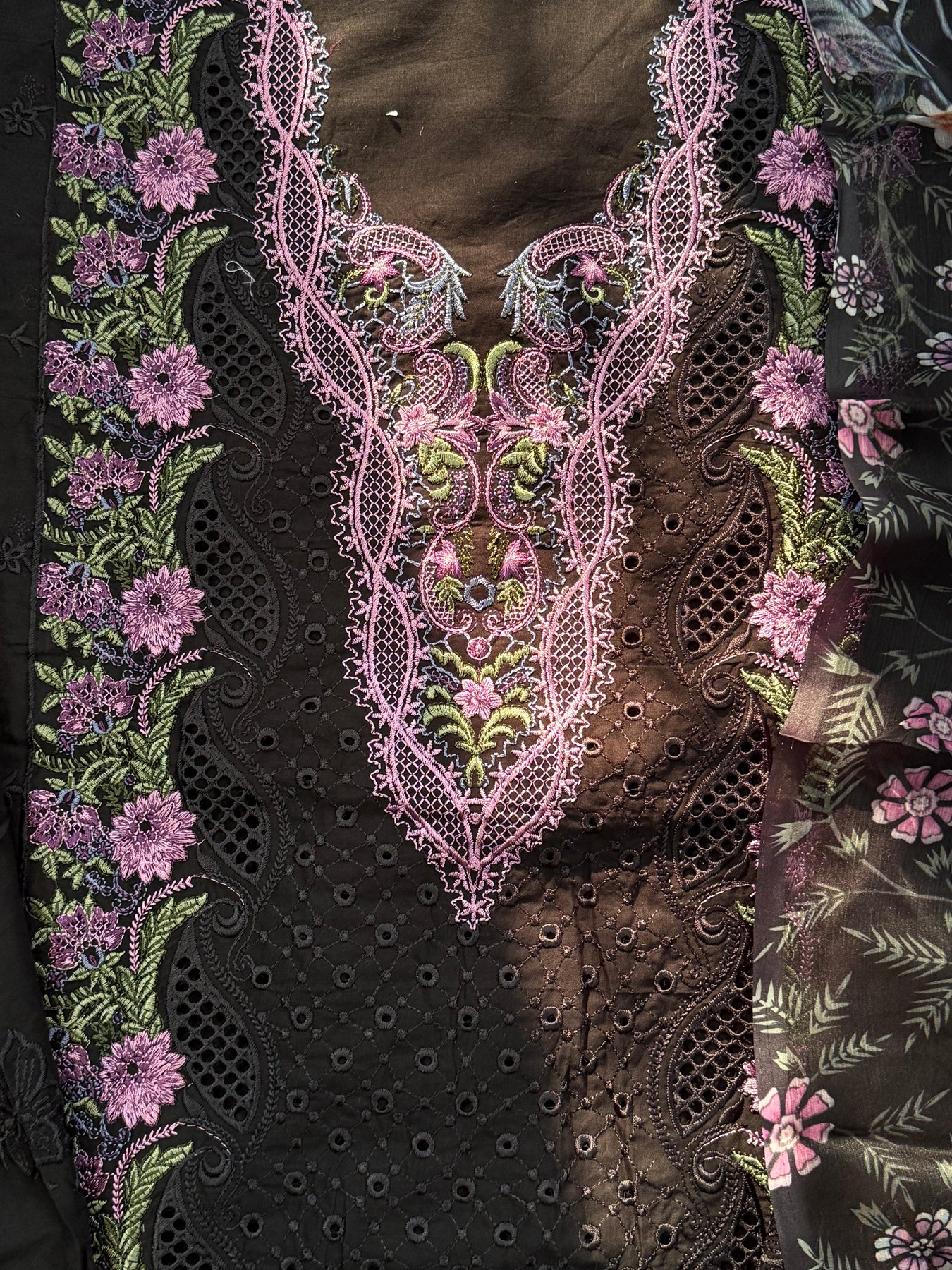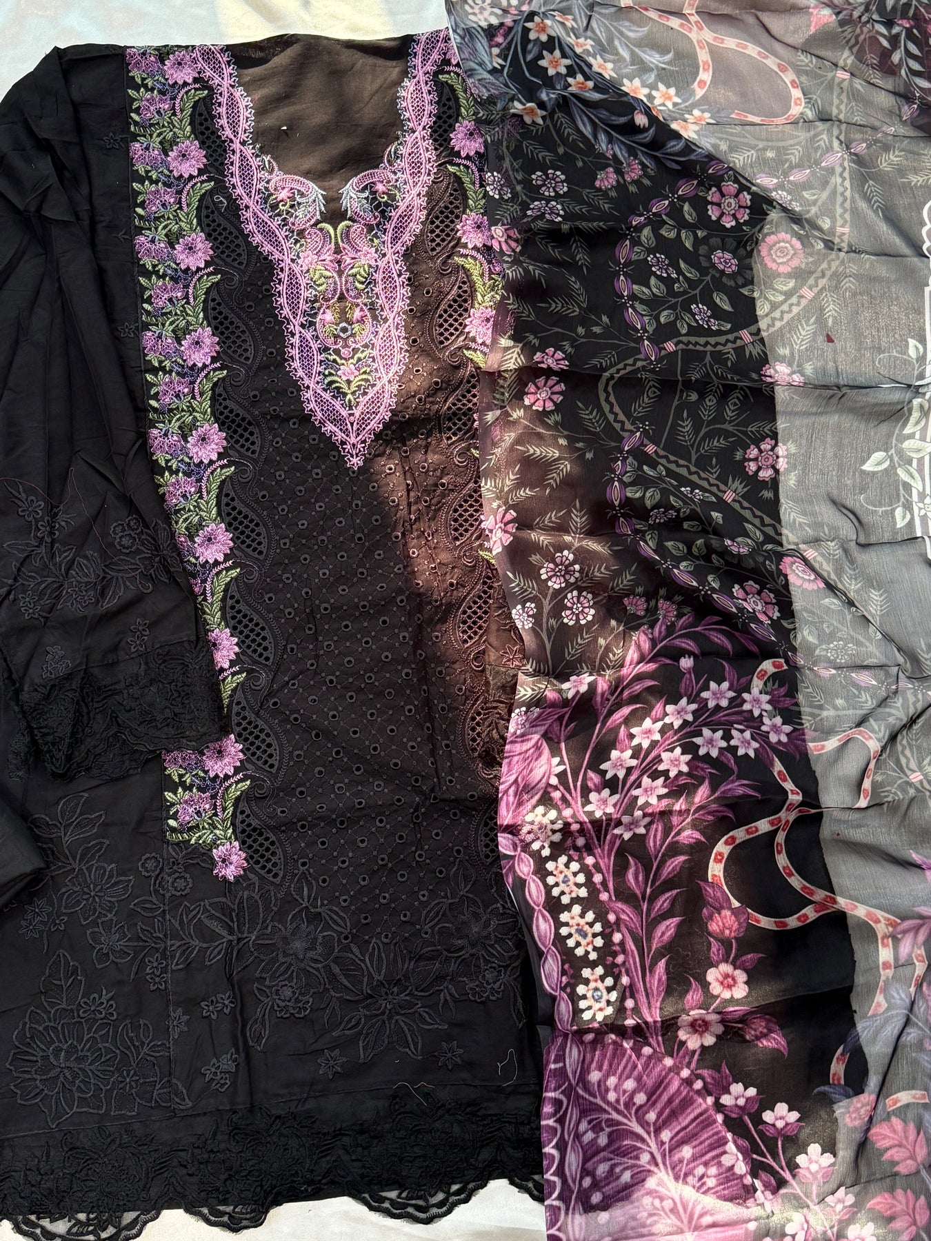 Top pure cotton designer un-stitched material with beautiful self embroidery on front.... patch for neck ... extra lace on front top......bust 54 Inches can be stitched..length 44 inches...