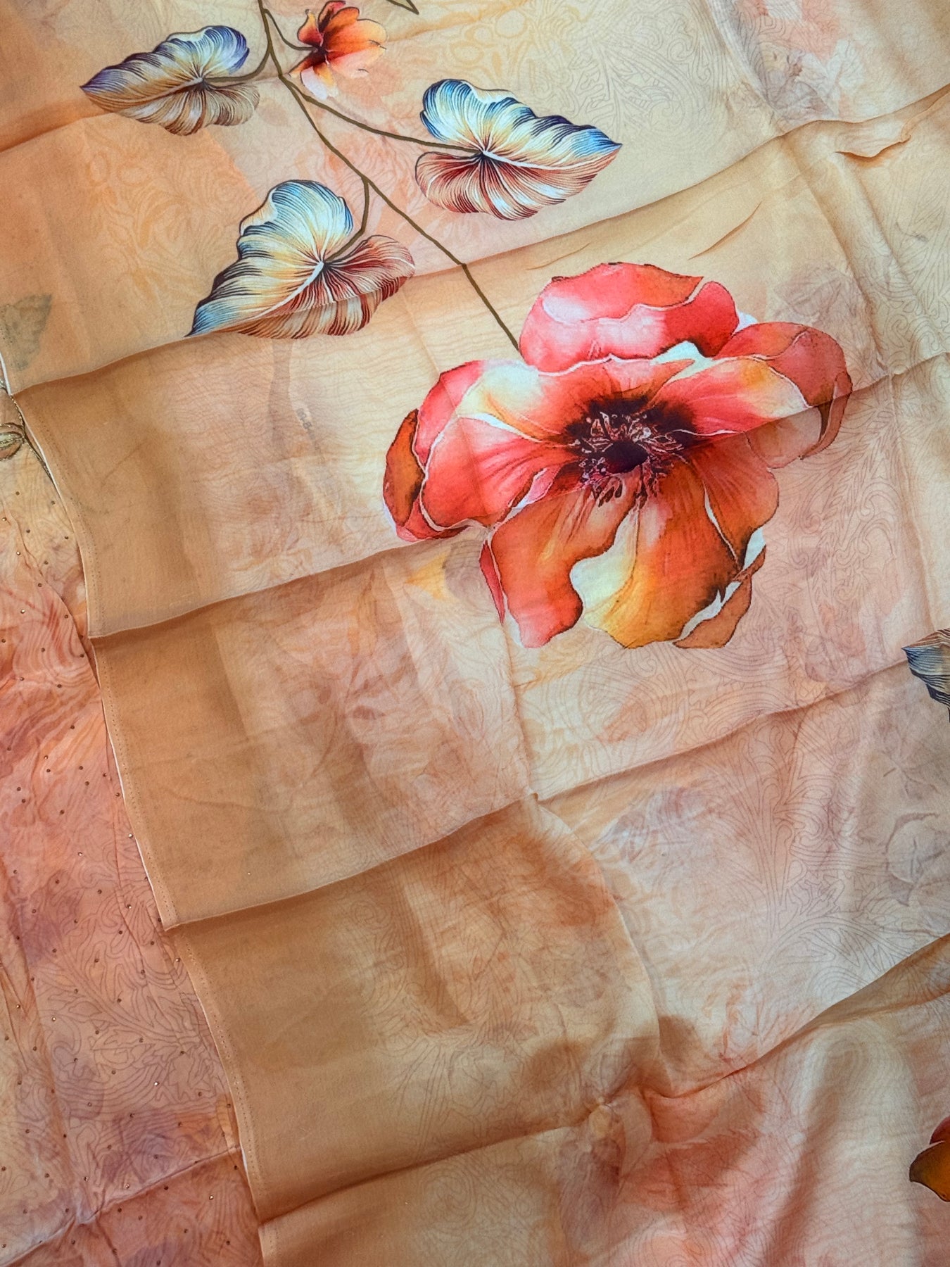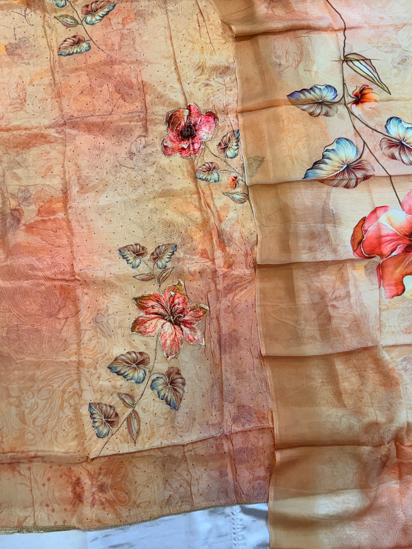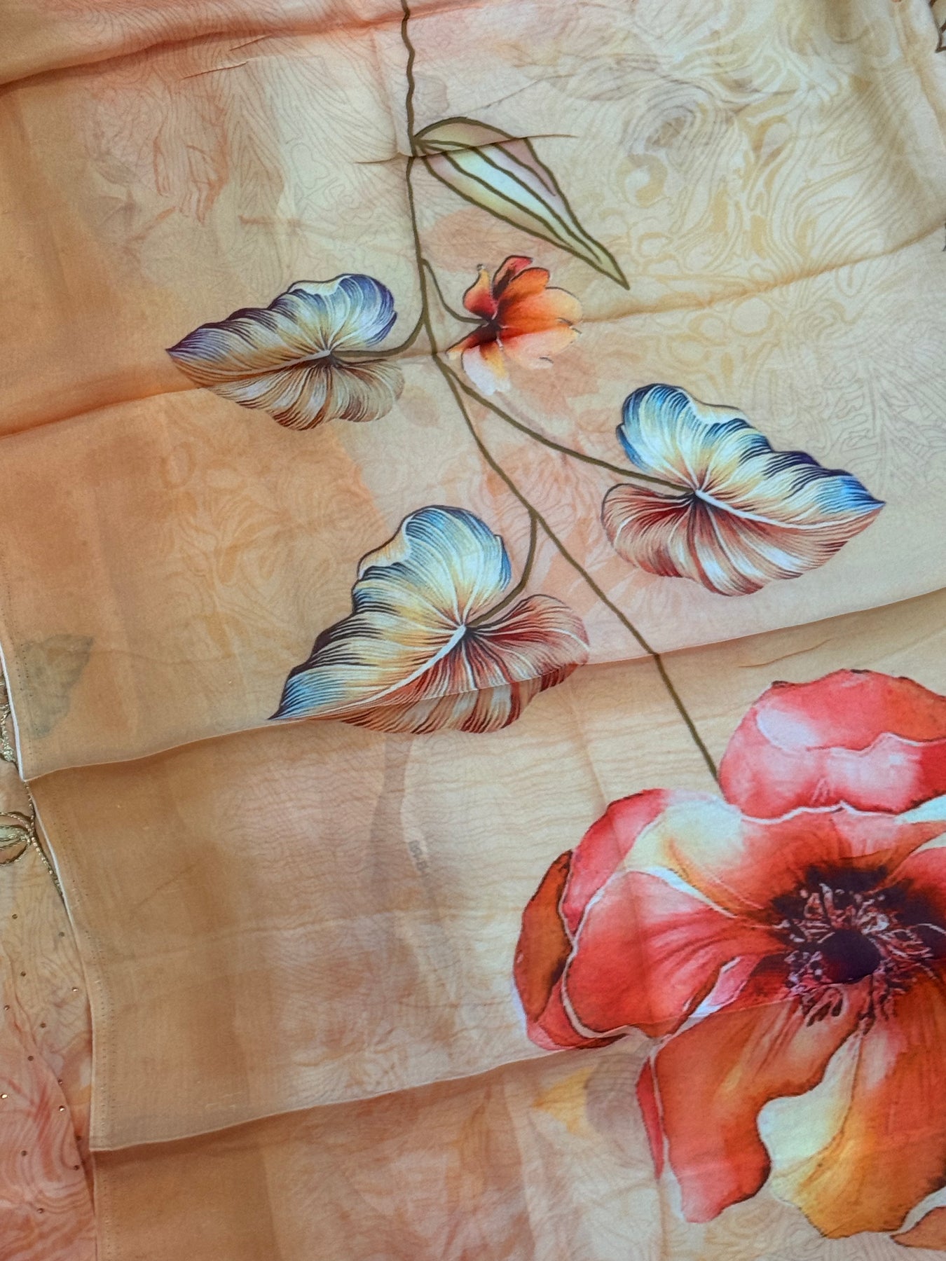 Top pure Crepe Digital printed.. beautiful velvet patch work on front ..top.lenght 48 Inch..Bust 64 can be stitched....extra material for sleeves