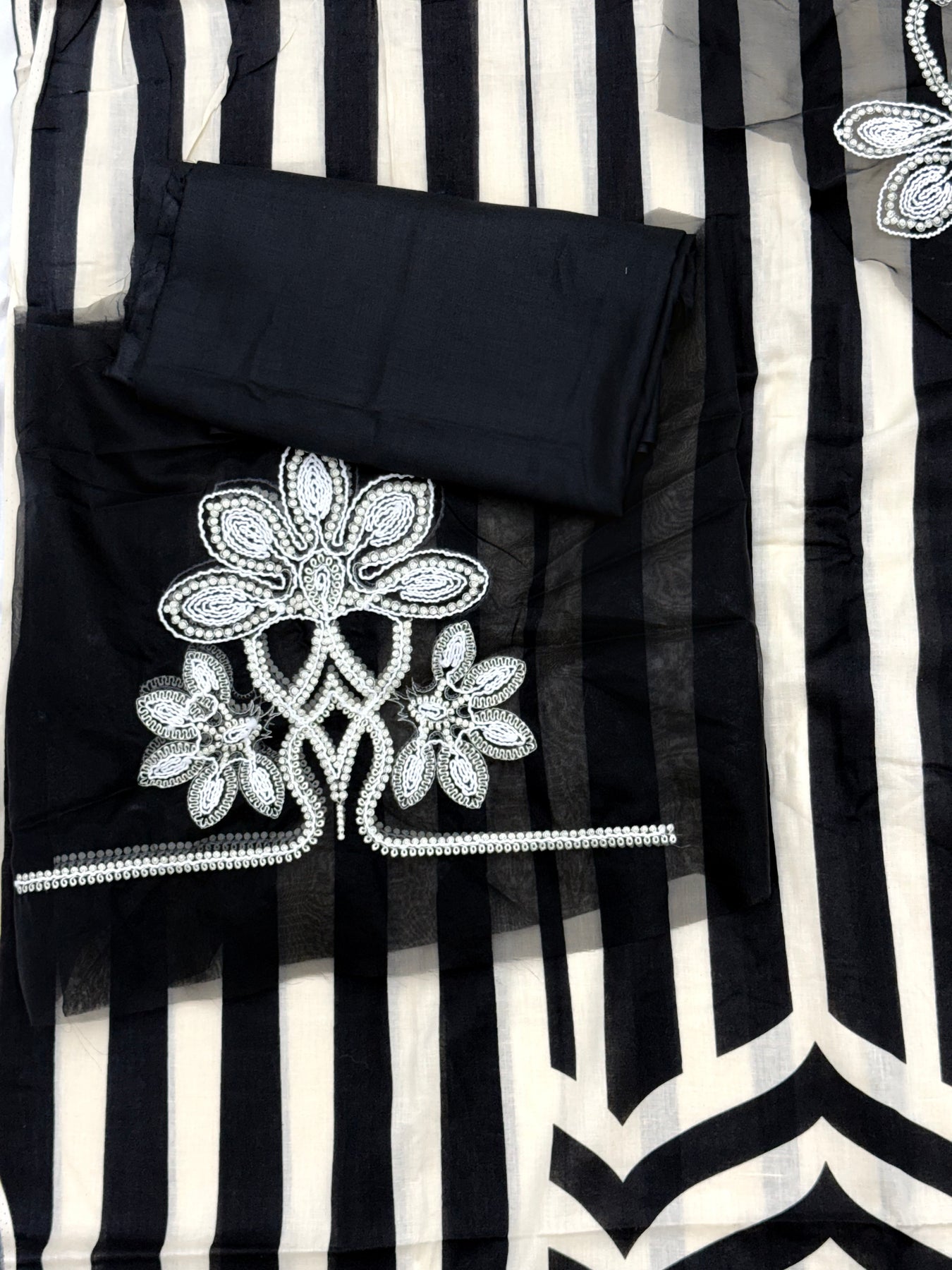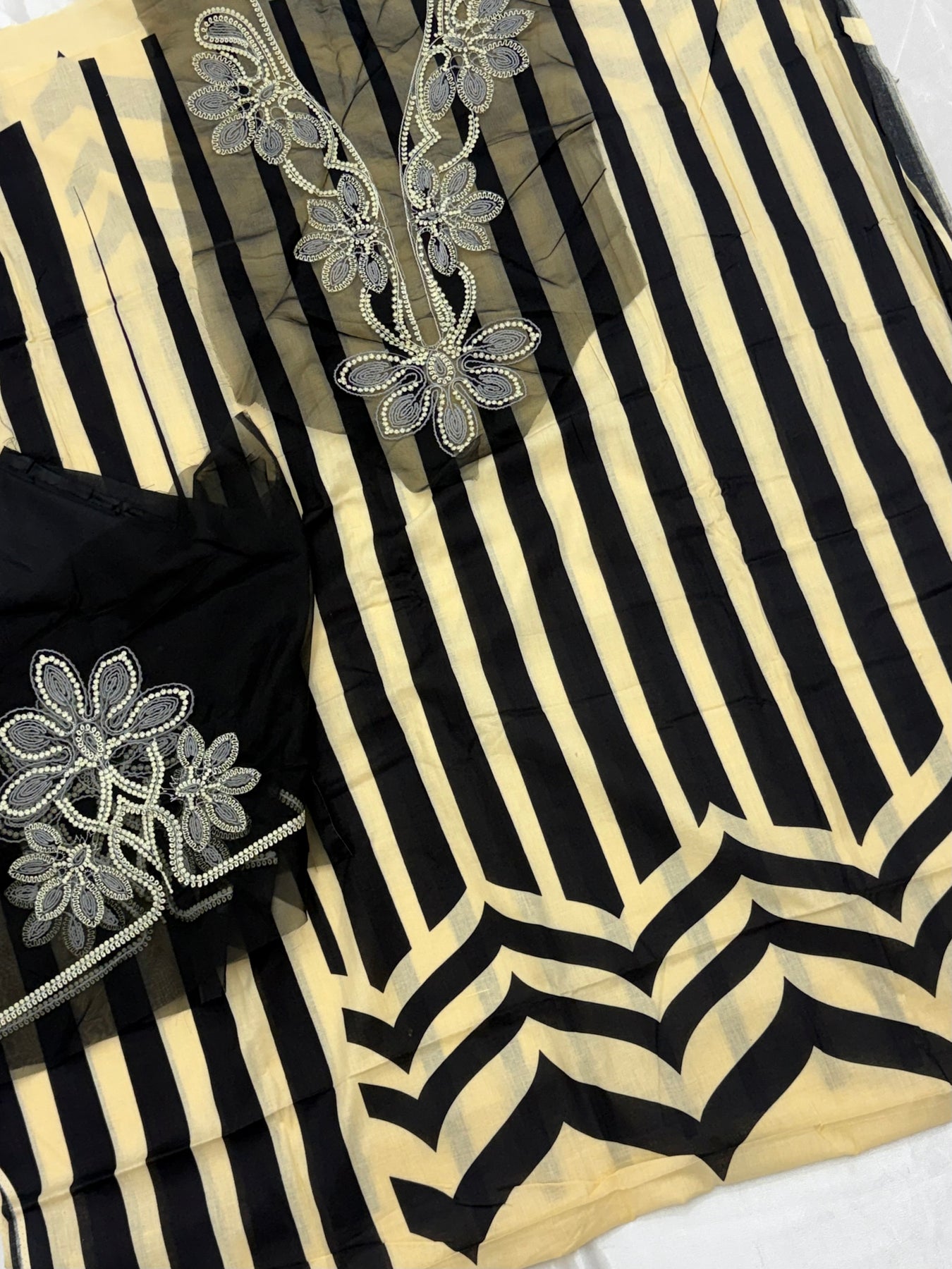 Top printed cotton designer un-stitched material with beautiful embroidery patches for neck and sleeves...