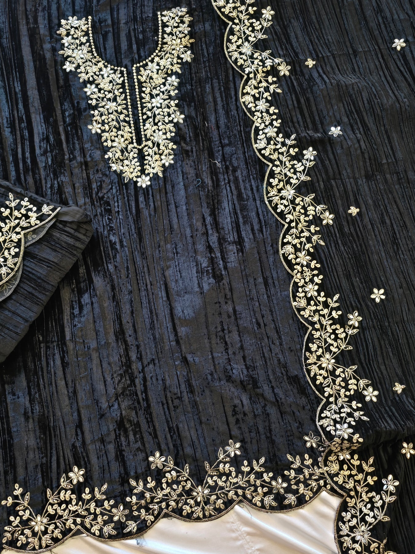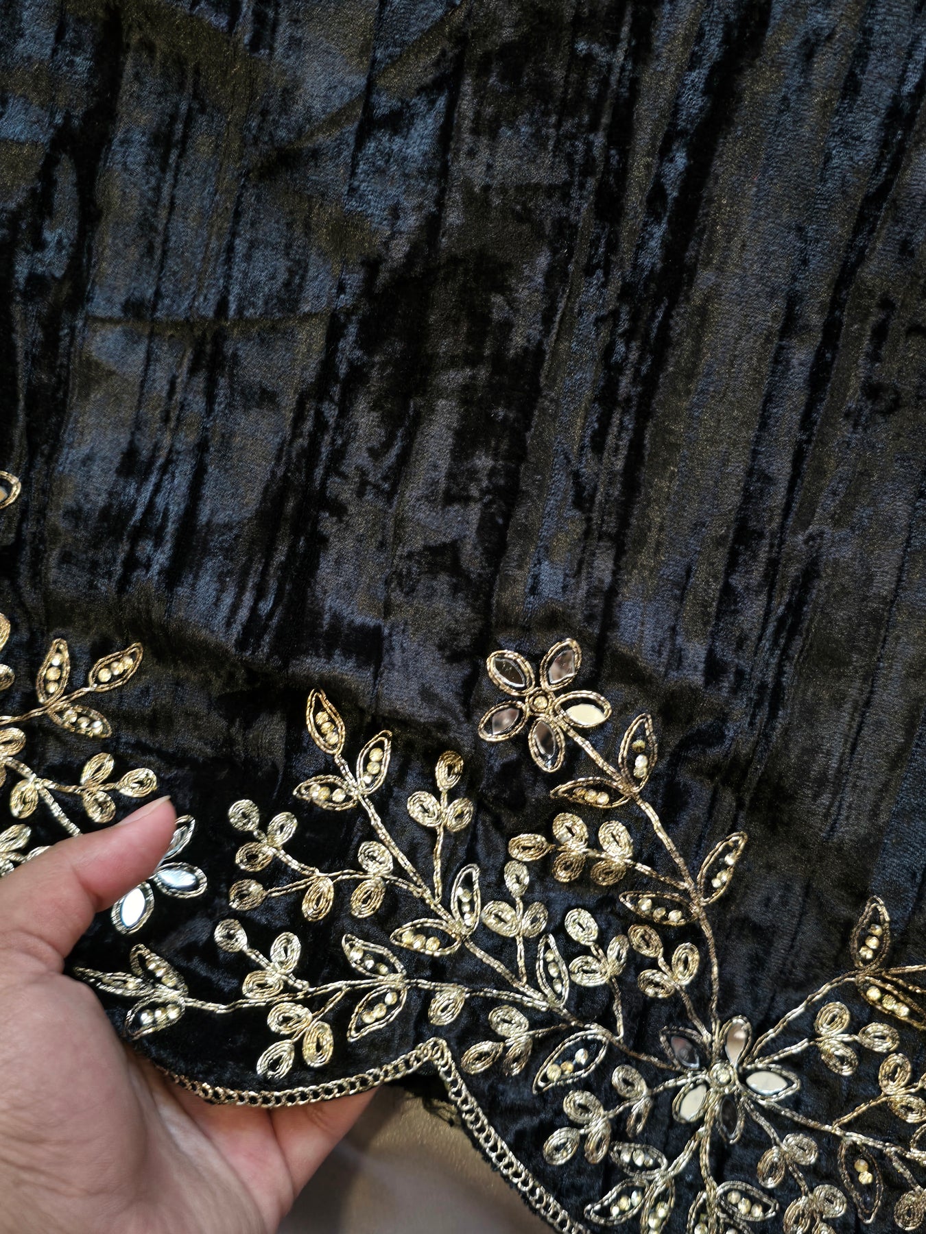 Top premium crush velvet with kundan and golden thread work on neck ,daman and sleeves...plain velvet back....top Length 46 inches 54 bust