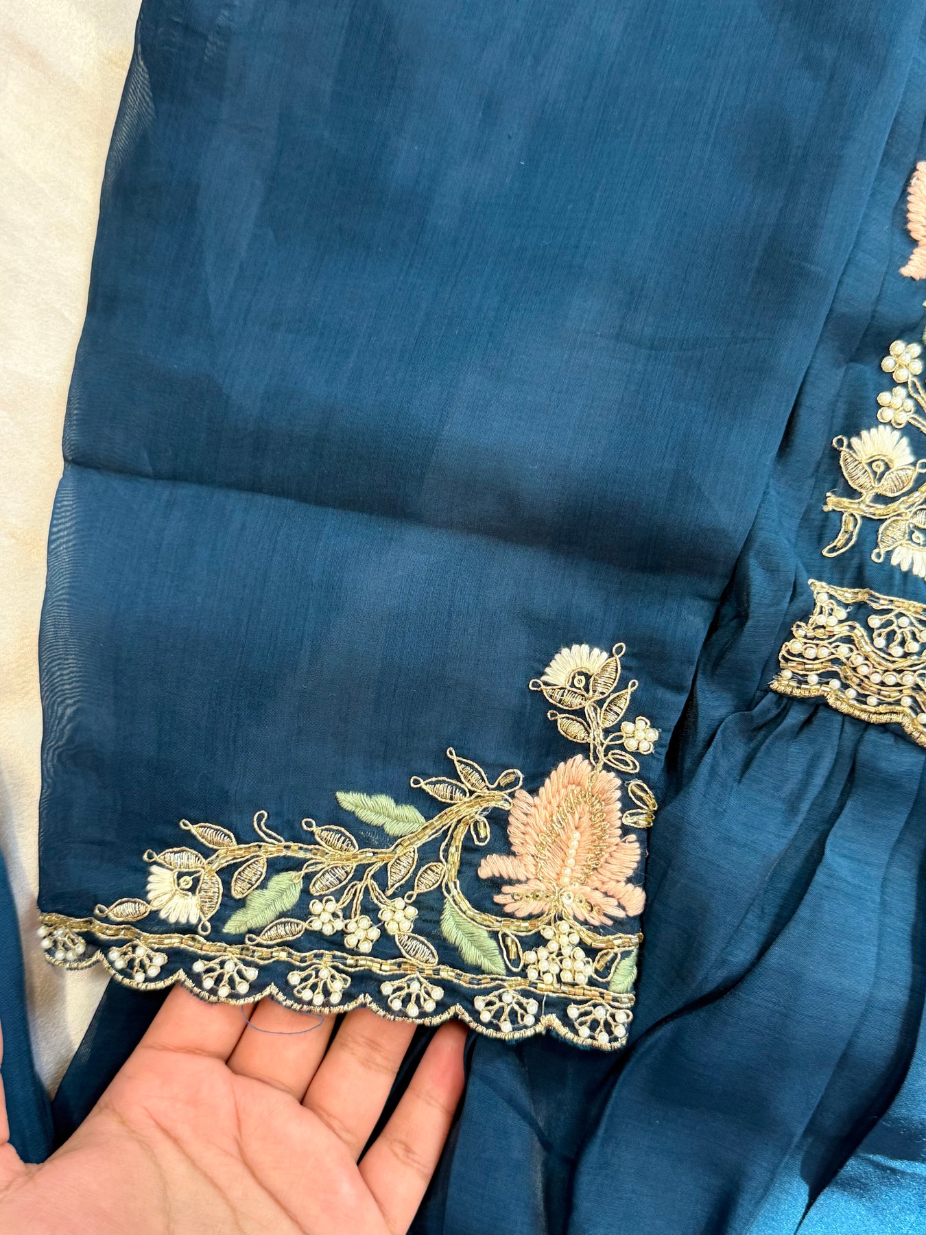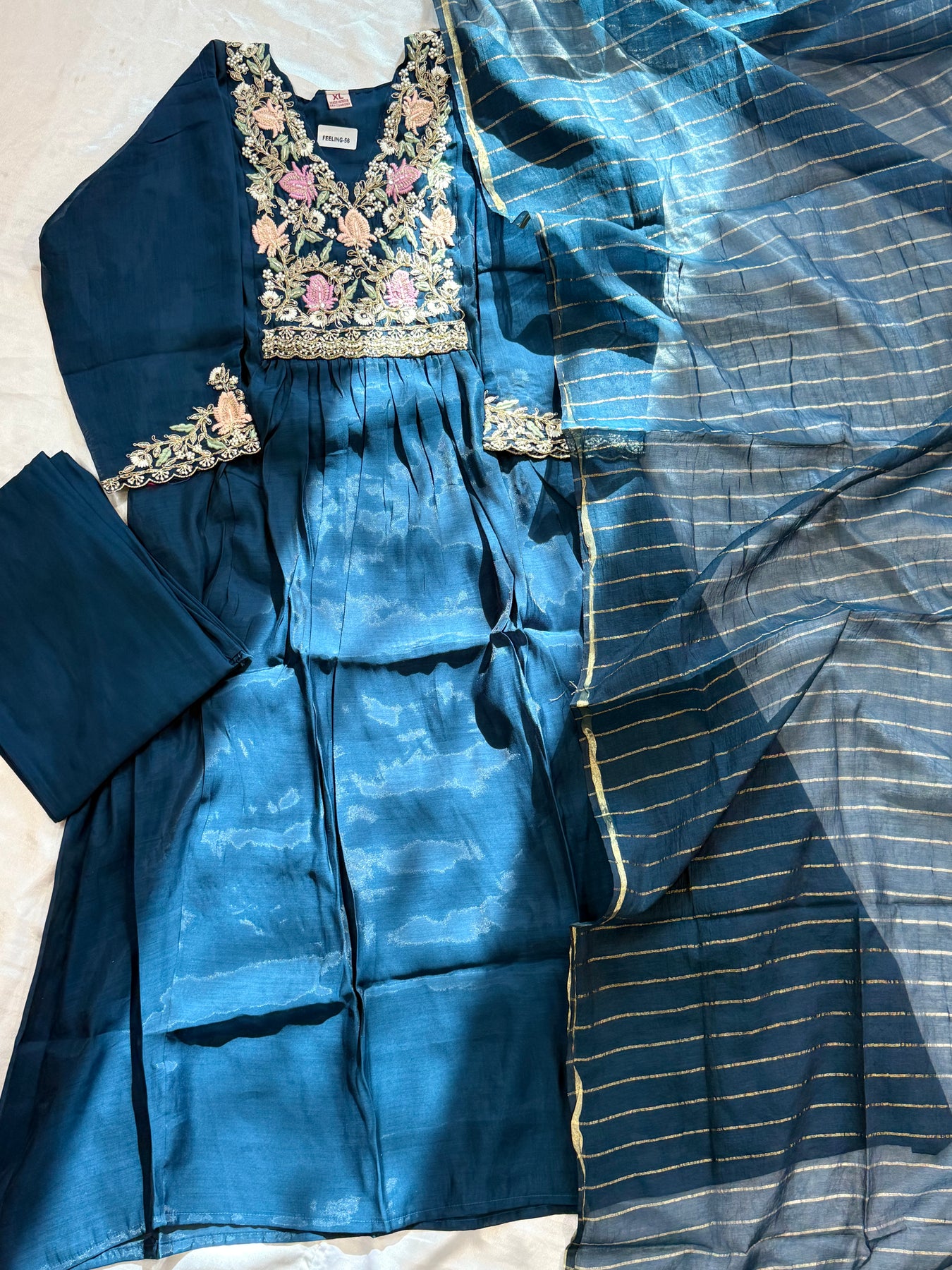 Top Mul chanderi Frock with yolk style embroidery ......stitched with lining.......Pakistani style neck with handwork on neck, yolk and sleeves.... length 49 inches