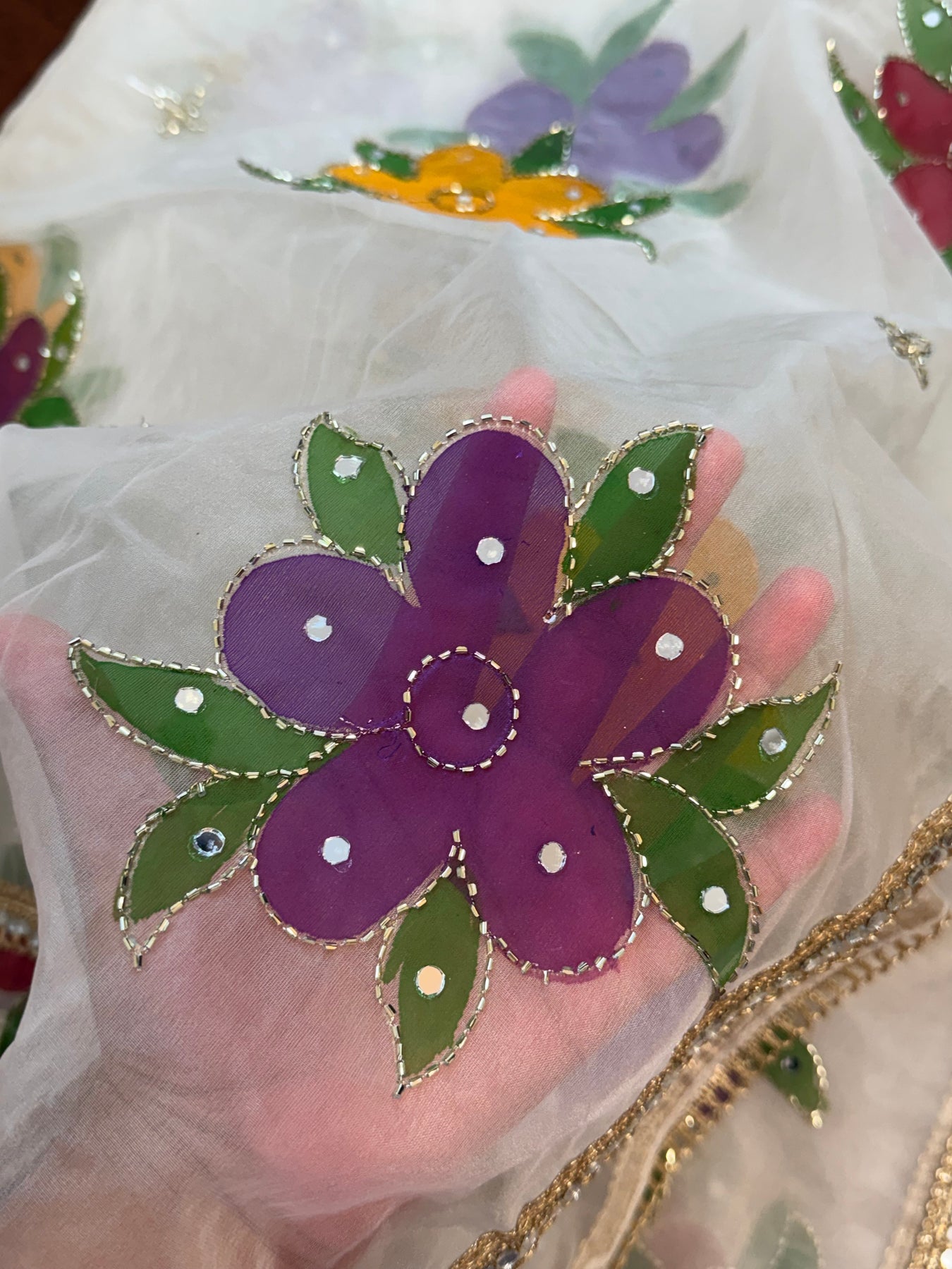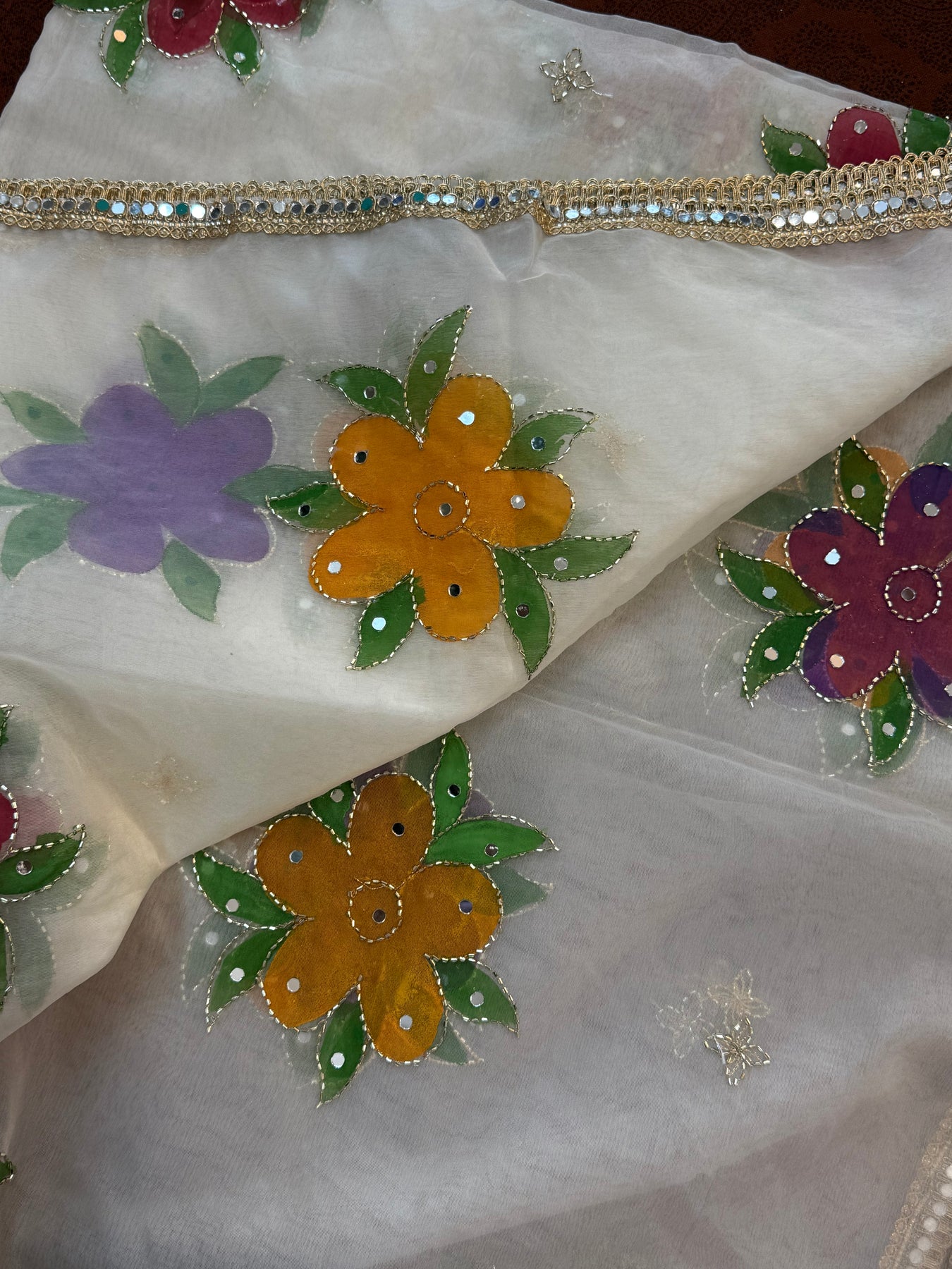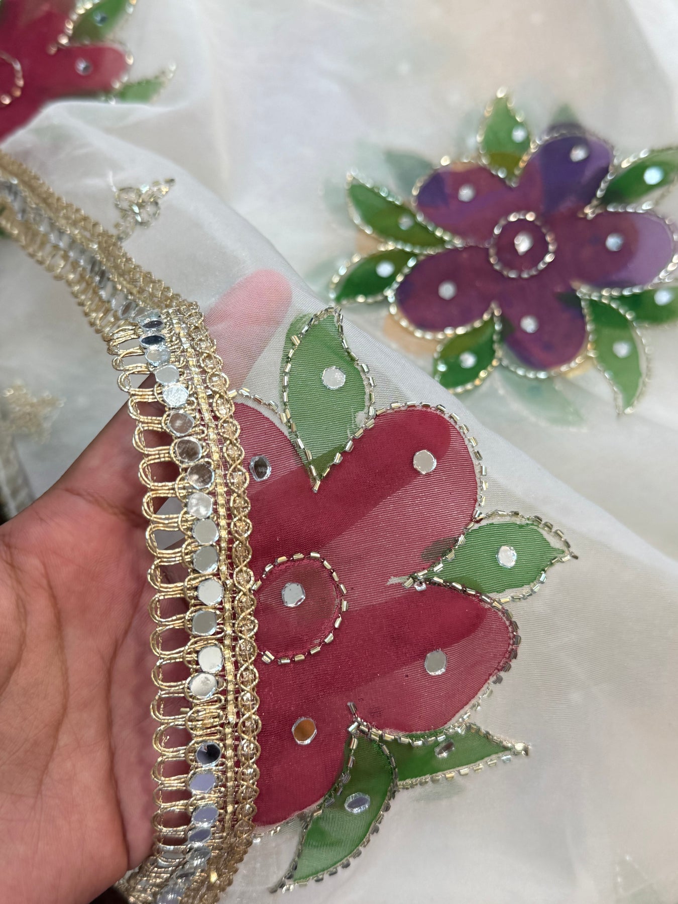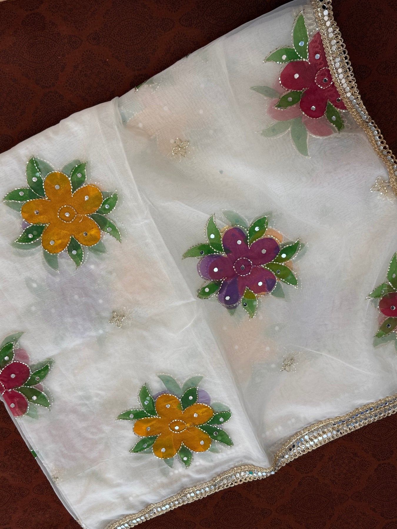 Introducing our hand-painted Pakistani organza dupatta, beautifully enhanced with delicate handwork and finished with an elegant golden mirror lace border. Light, luxurious, and timeless—perfect for adding effortless grace to any festive or formal look 2.4 meter with 39 inches