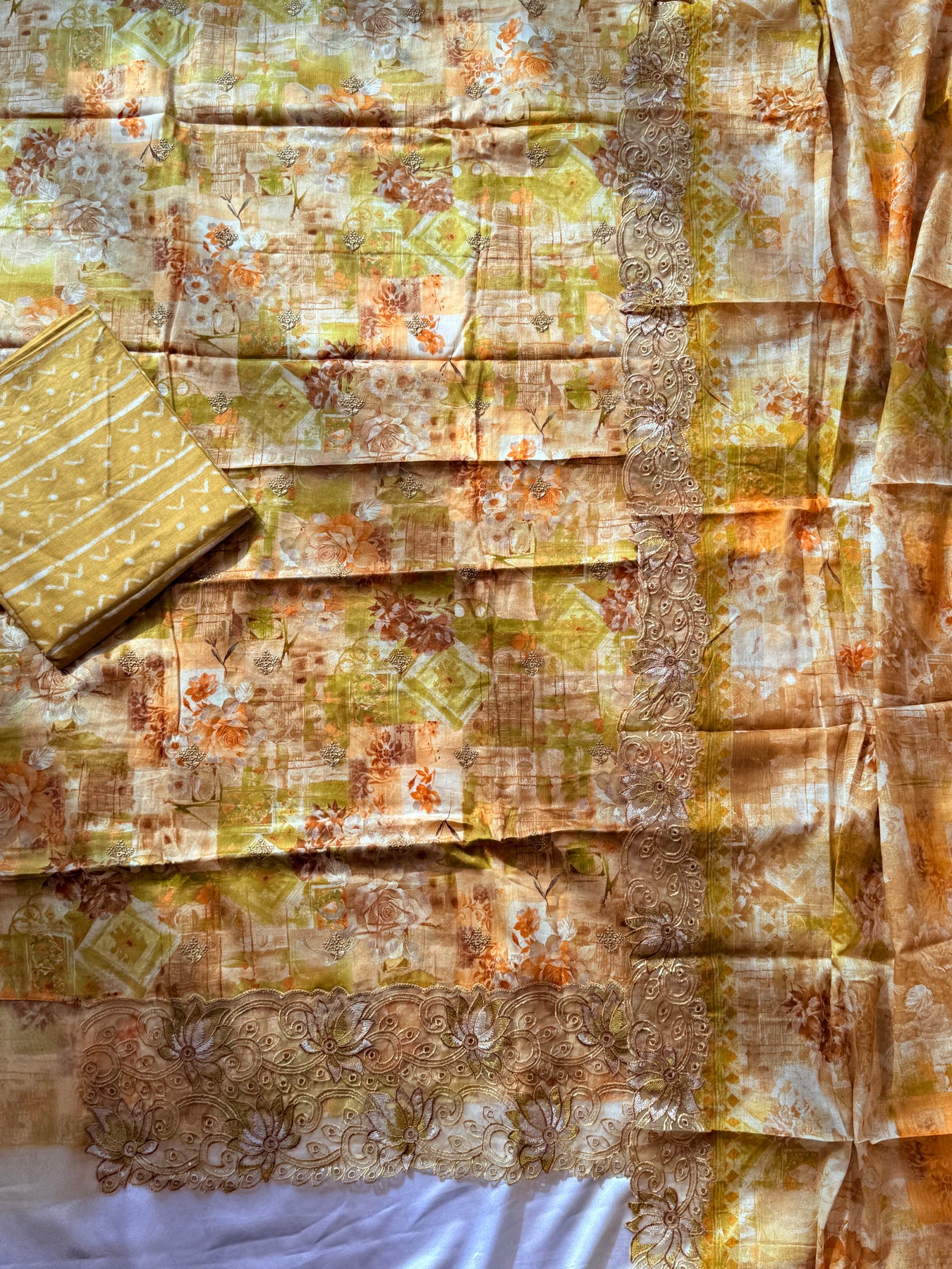 Top Lawn cotton .. beautiful Self embroidery on front...heavy embroidery boarder with cutwork ..length 48 Inch..Bust 58 can be stitched