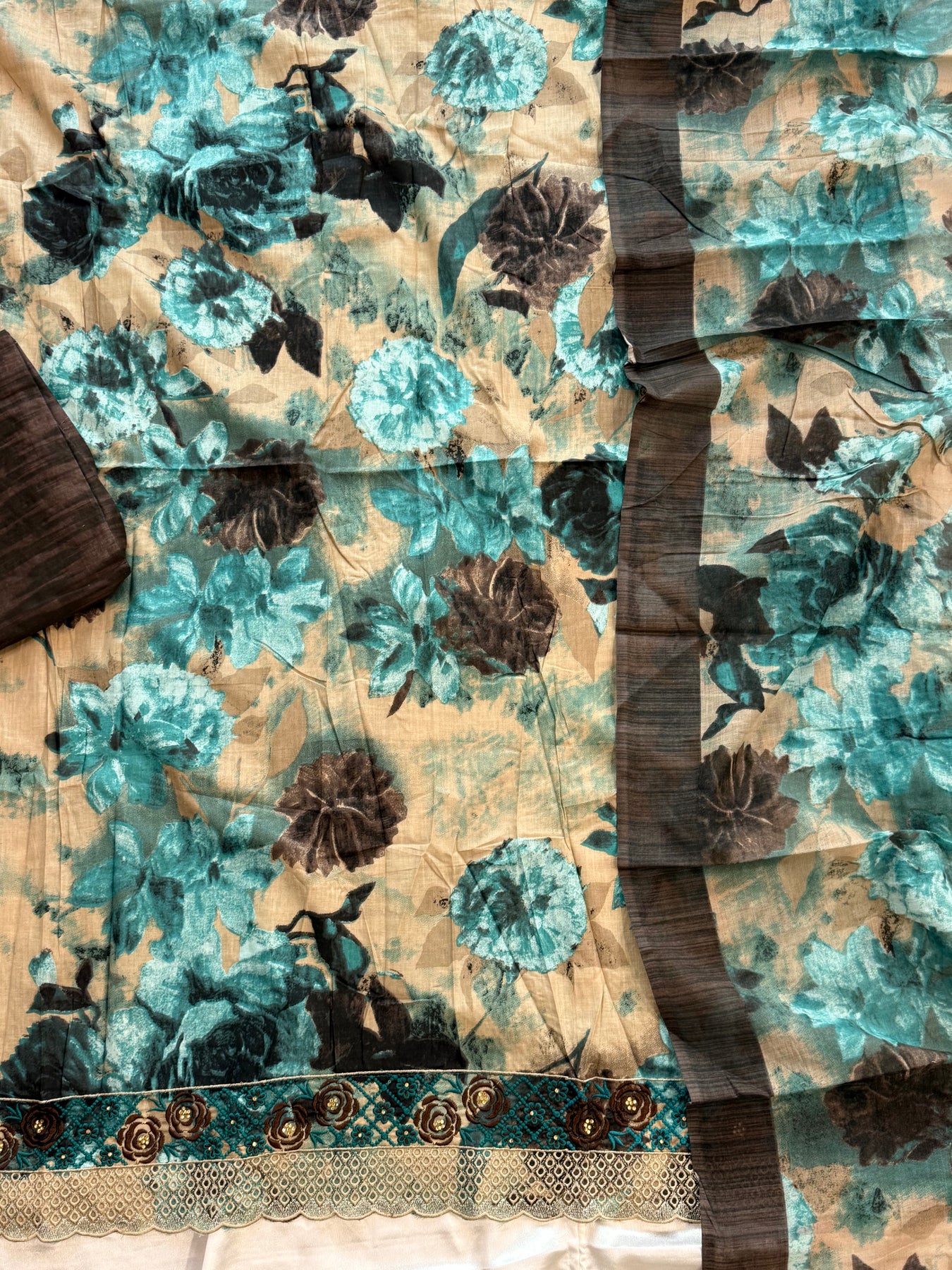 Top Lawn cotton .. beautiful Self embroidery on front...heavy embroidery boarder with cutwork ..length 48 Inch..Bust 58 can be stitched