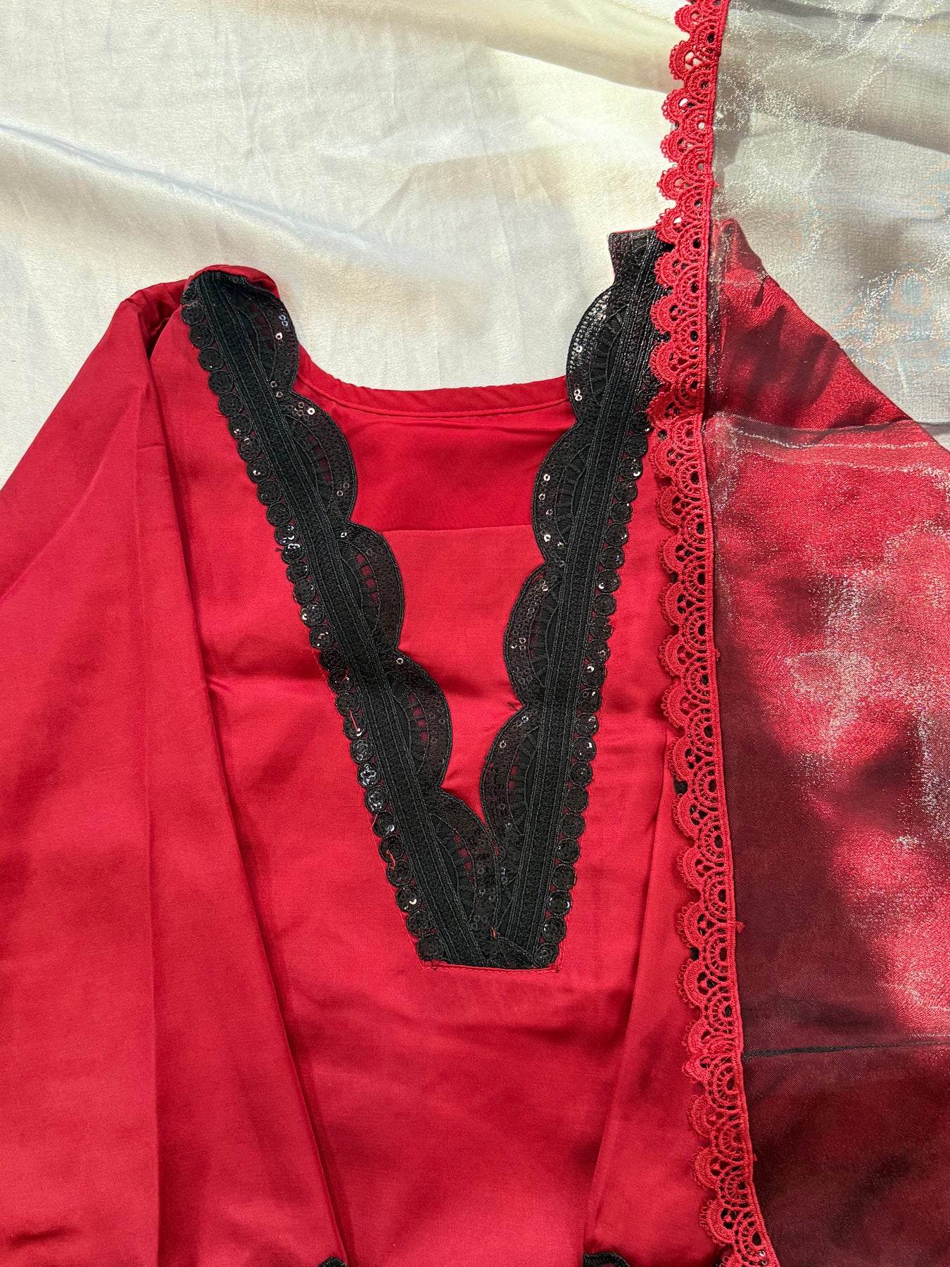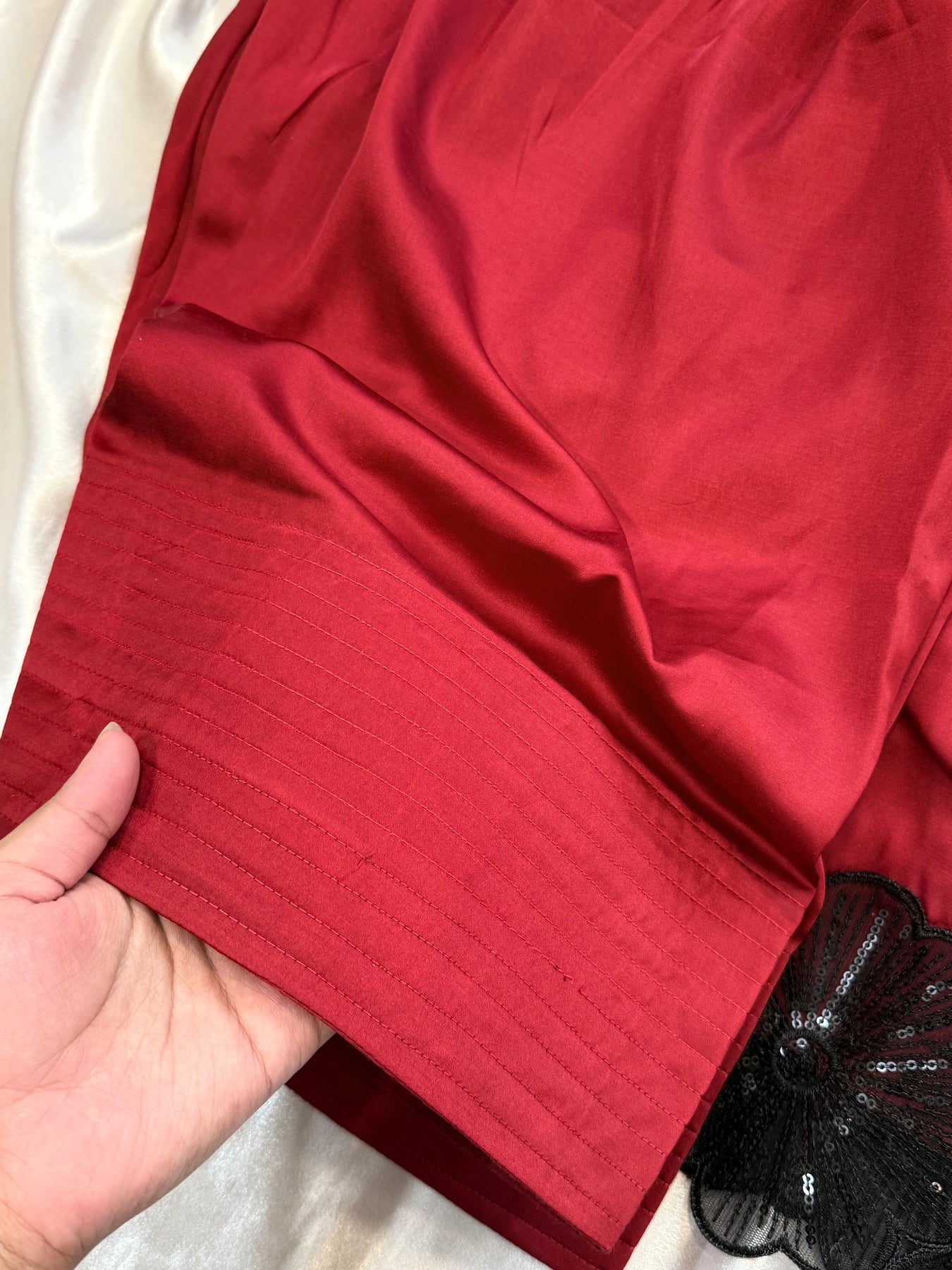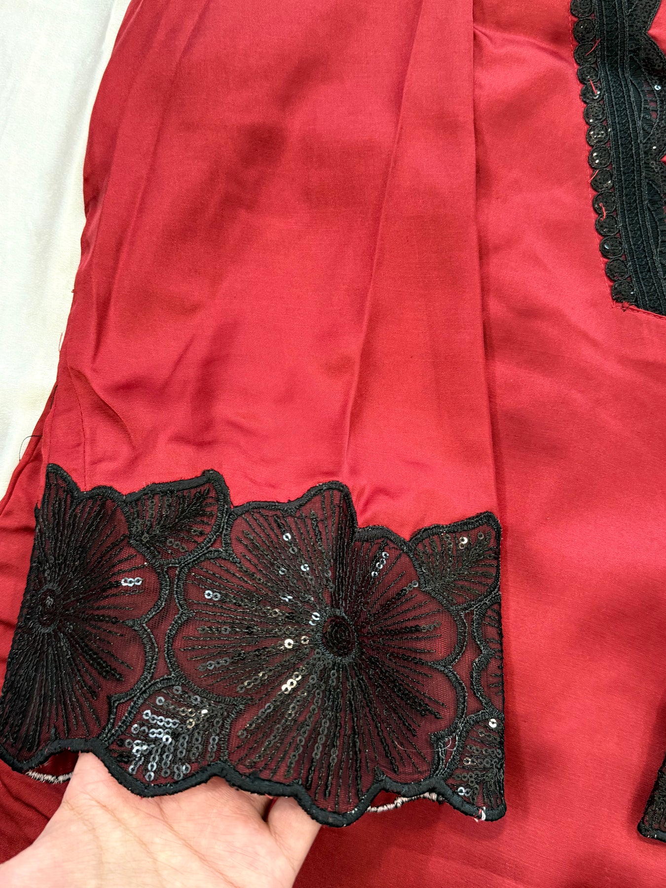 Top Satin material with beautiful embroidery on neck ....beautiful flower embroidery patch on sleeves and top...lining added .. Top length 36Inches