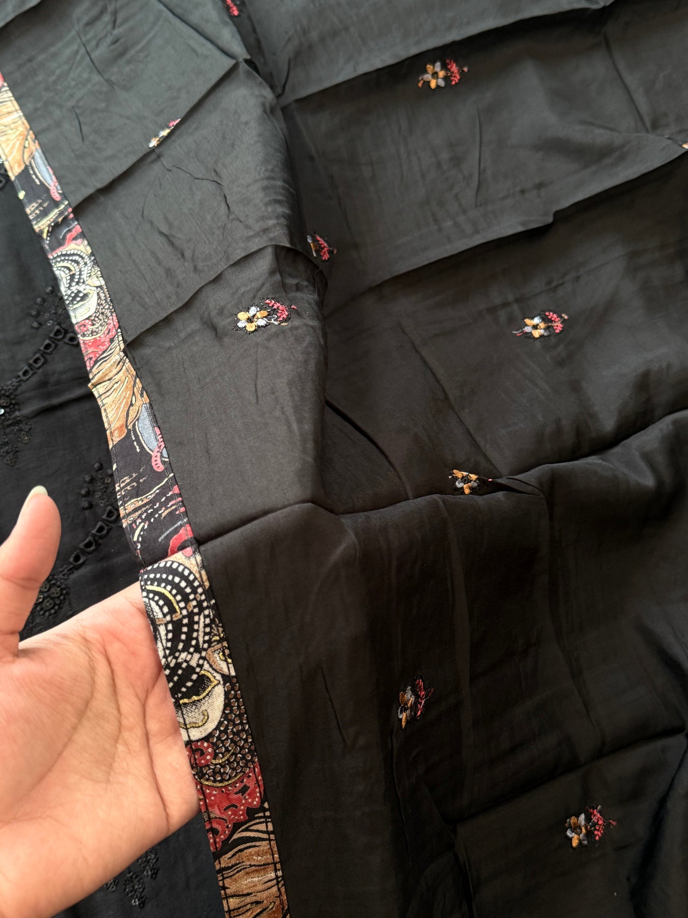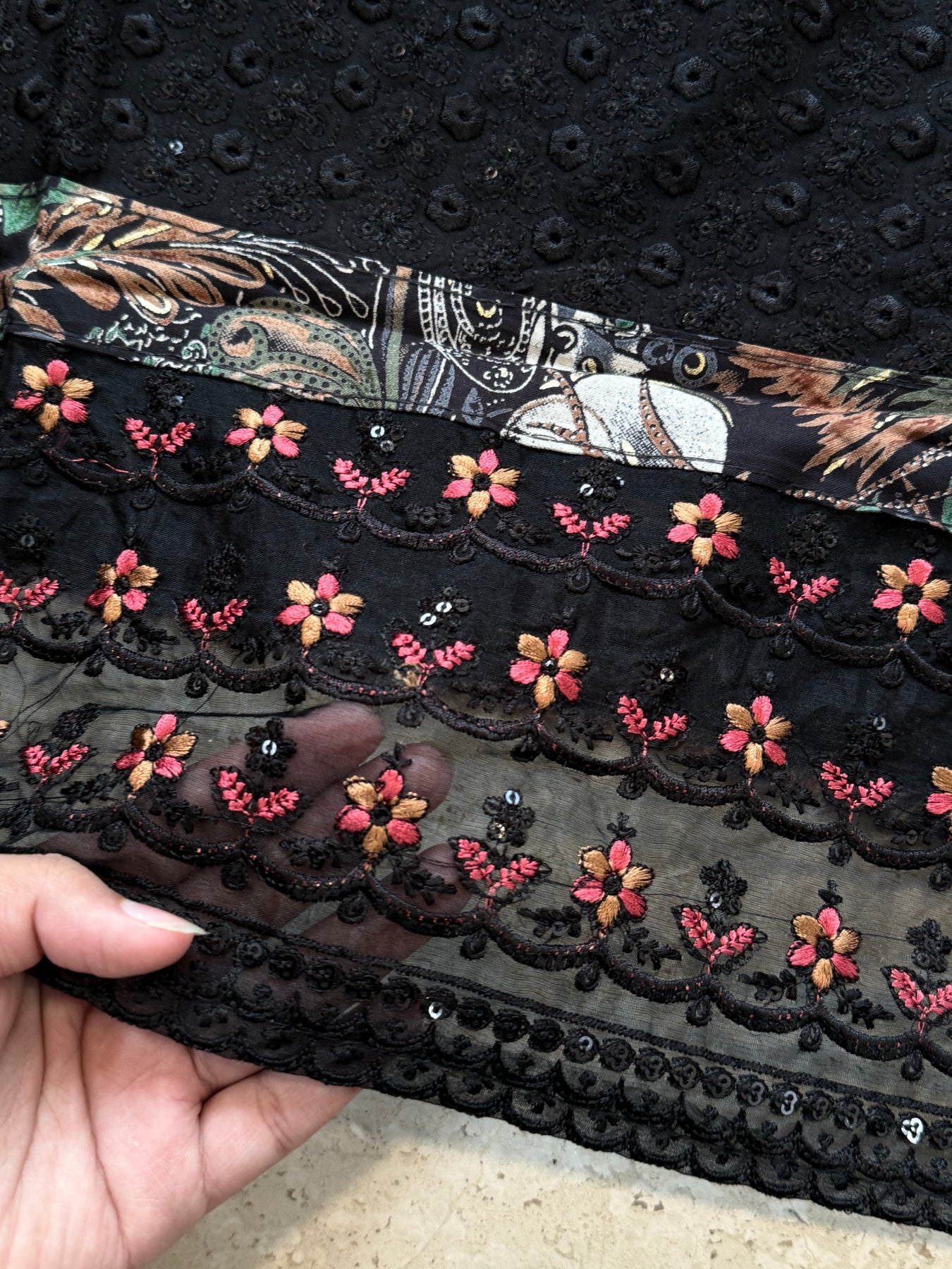 Top Rayon cotton designer un-stitched material with beautiful self embroidery with organza lace work on daman....printed back ....bust 58Inches can be stitched..length 43 inches...
