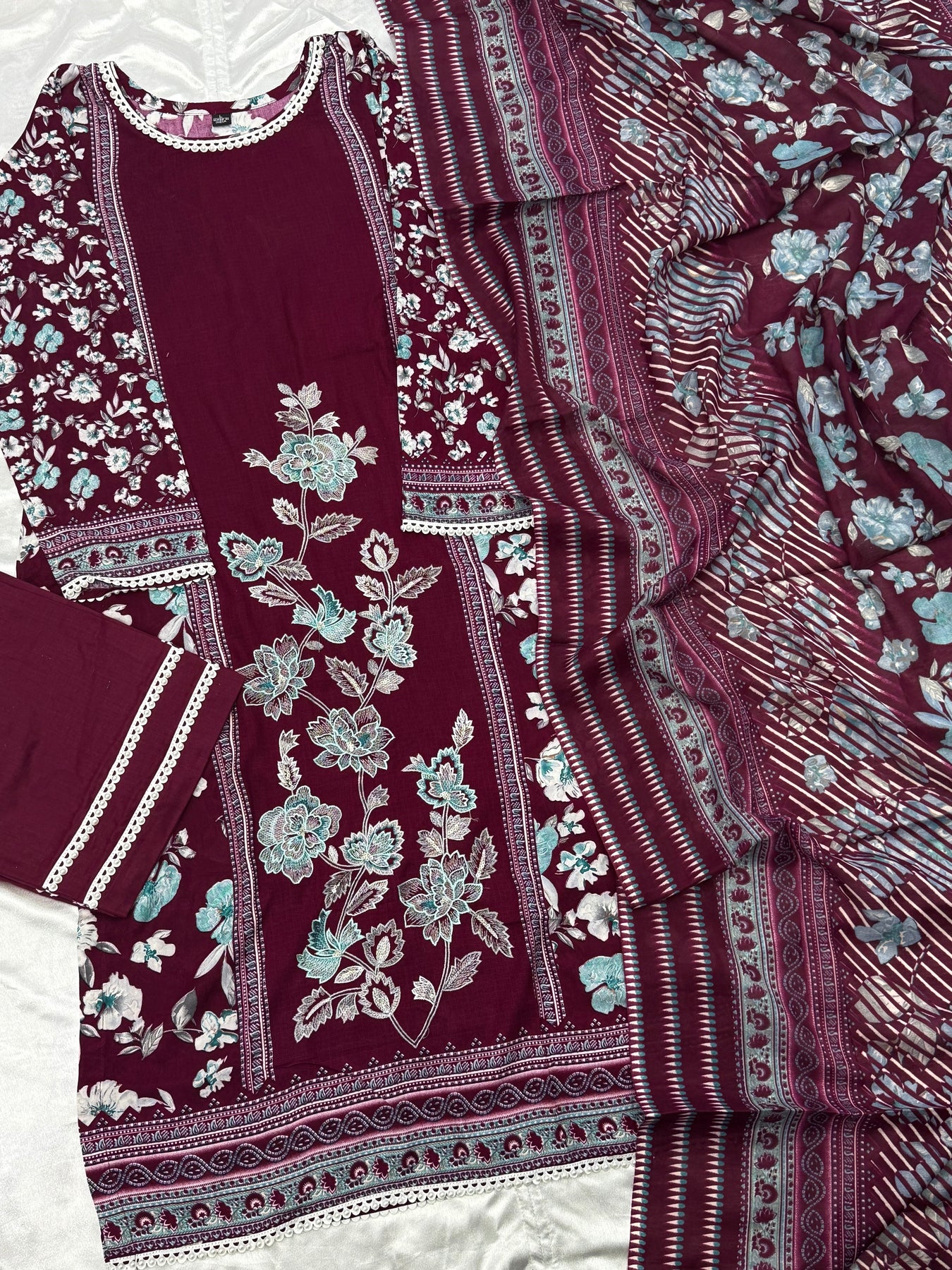 Top Lawn cotton Digital printed....kashmiri embroidery on Neck...... extra pearl lace on sleeves,neck and front...