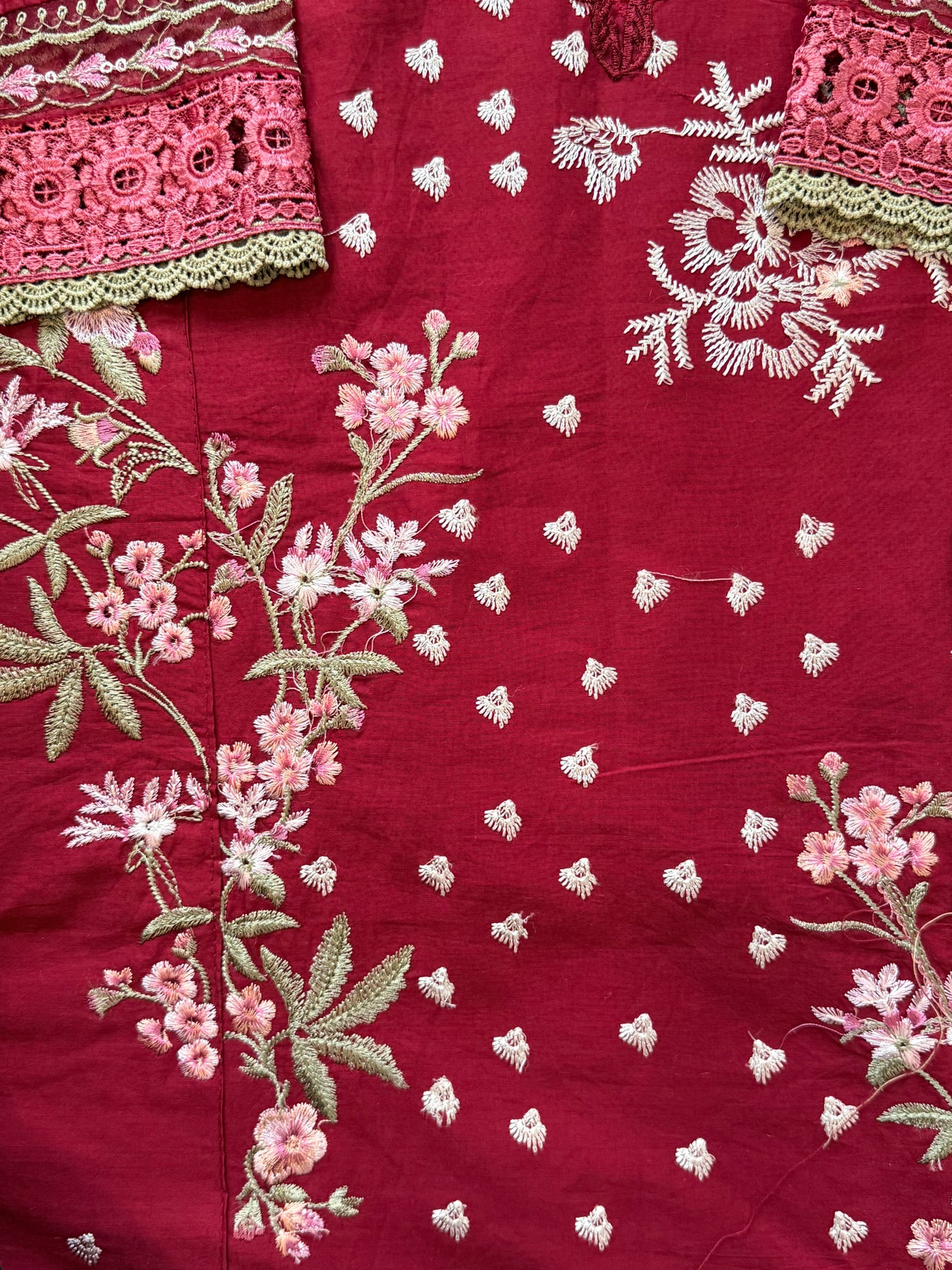 Top pure cotton designer stitched with lining.... beautiful self embroidery on front.... pakistani style neck with patch and laces ... Extra lace on front top.....length 44 inches...