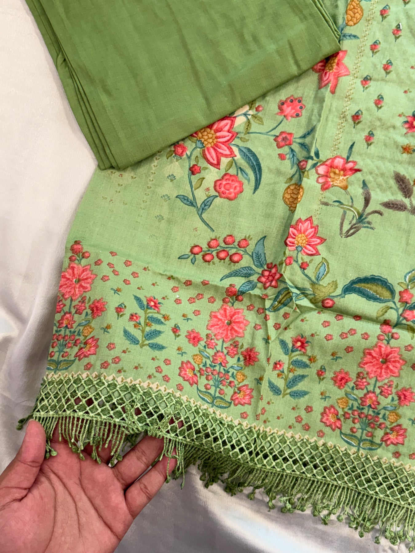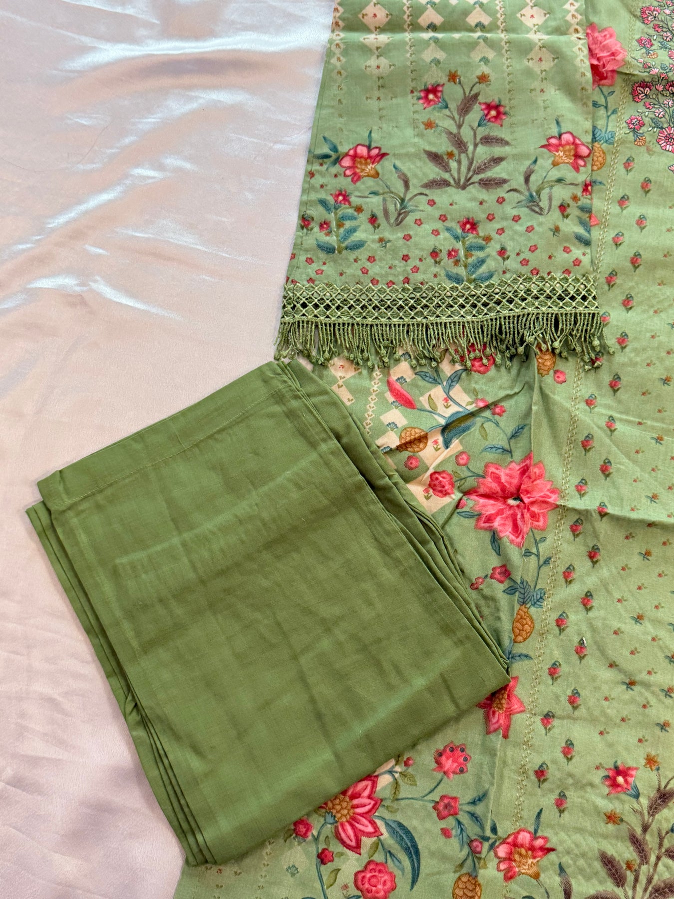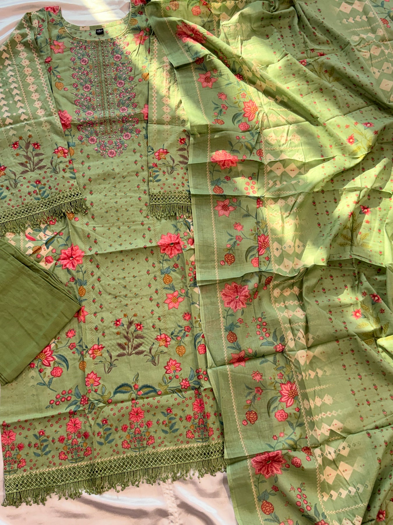 Top Lawn cotton Digital printed....Embroidery on Neck...... extra lace detailing sleeves and daman....