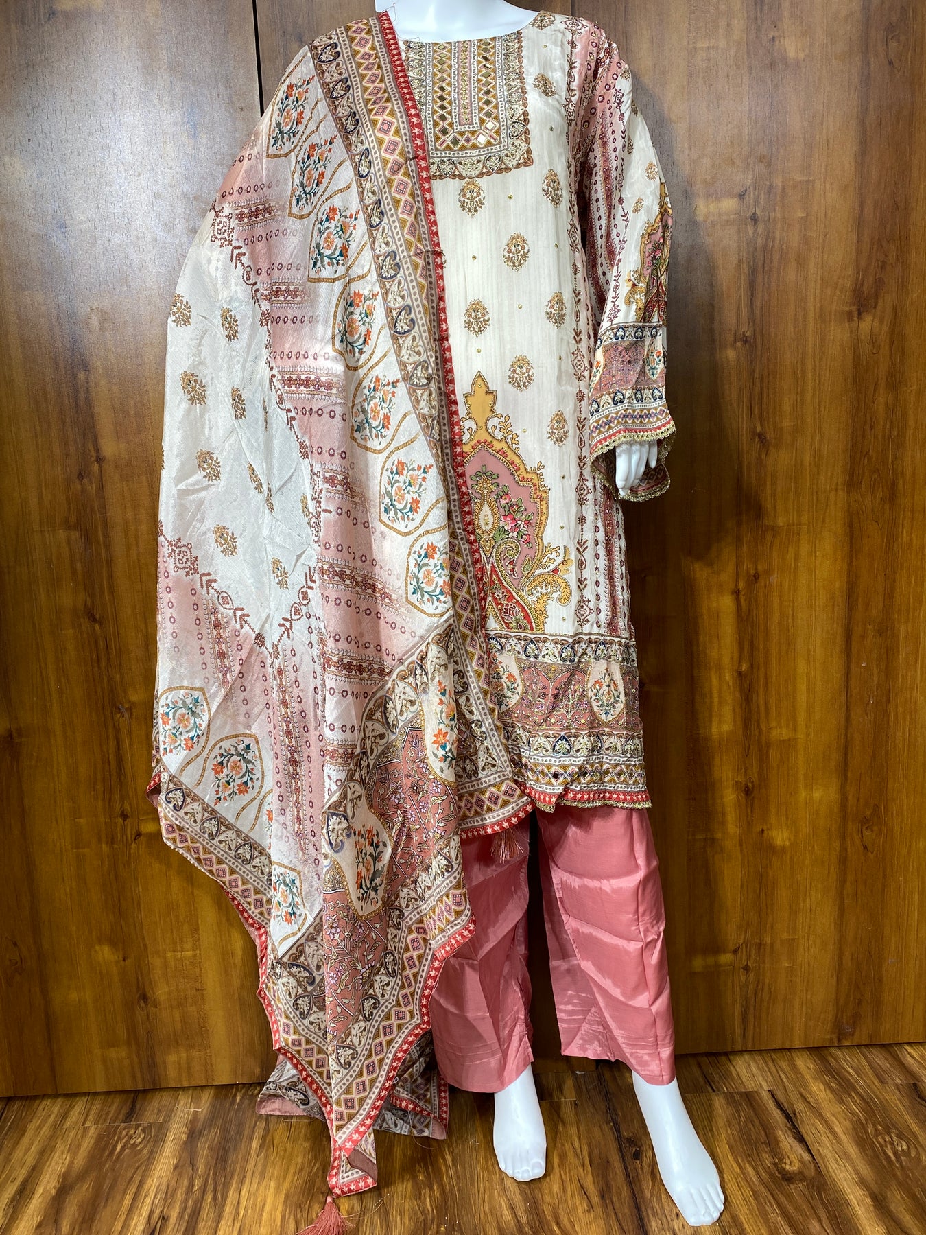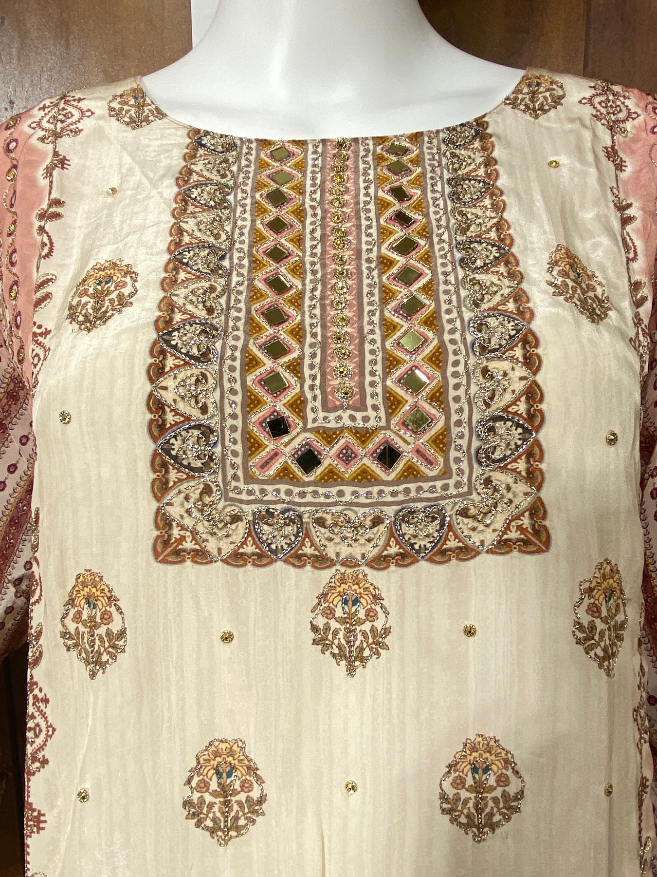 Top Muslin printed with beautiful embroidery detailing on neck. lace on sleeves and daman....length 45 inches