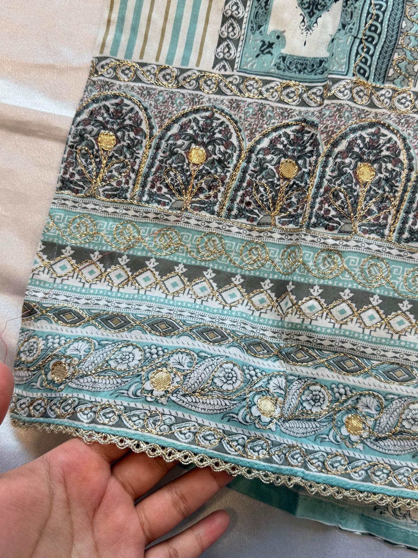 Top Lawn printed with golden thread work on neck and front.......length  43 inches