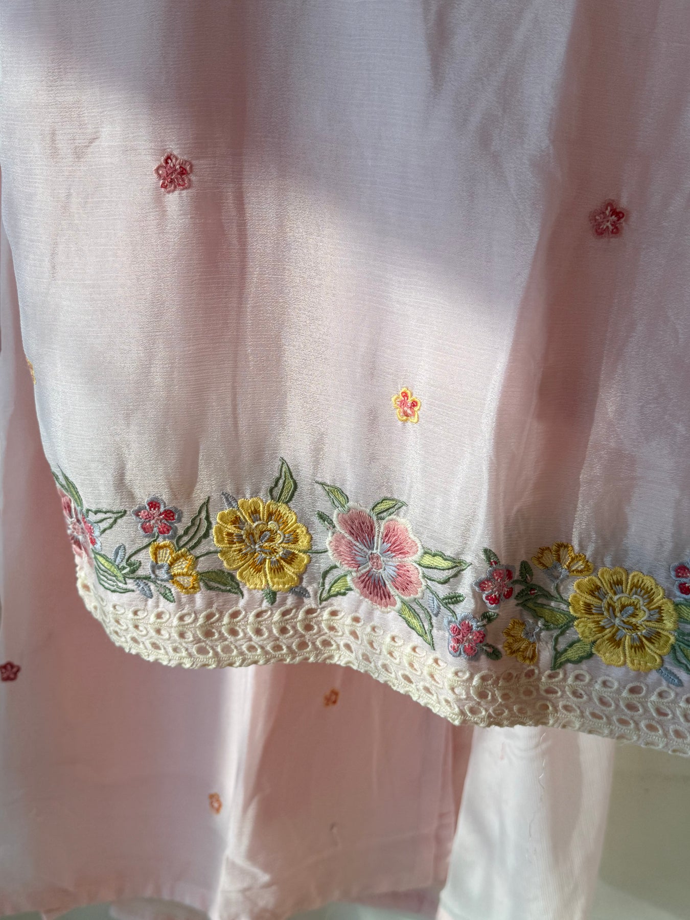 Top Shiffon stitched with lining with beautiful cutwork embroidery and handwork on neck ,....... ,heavy work on sleeves 20 inches