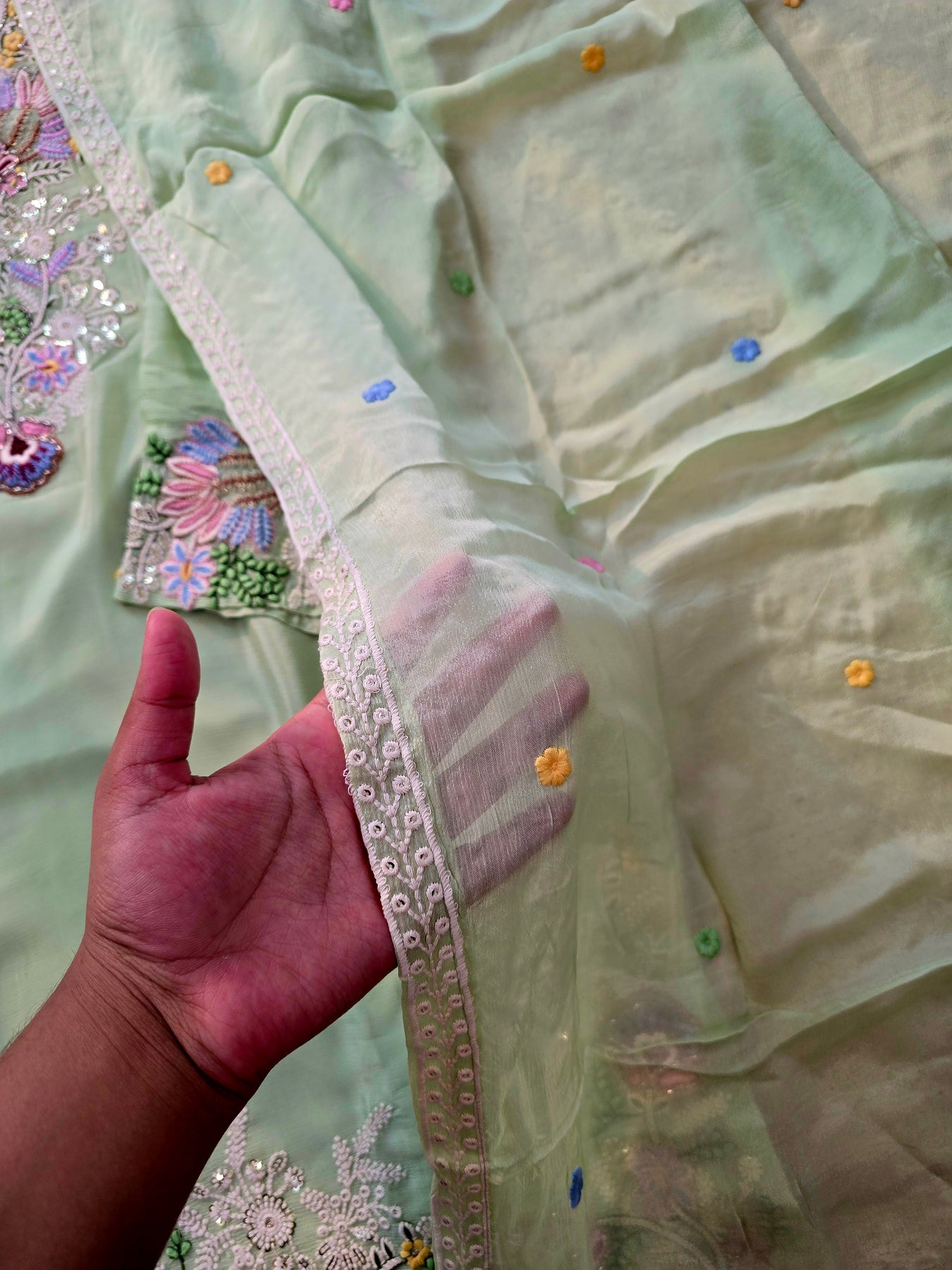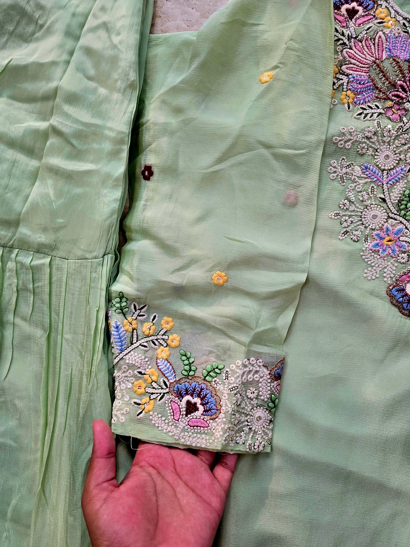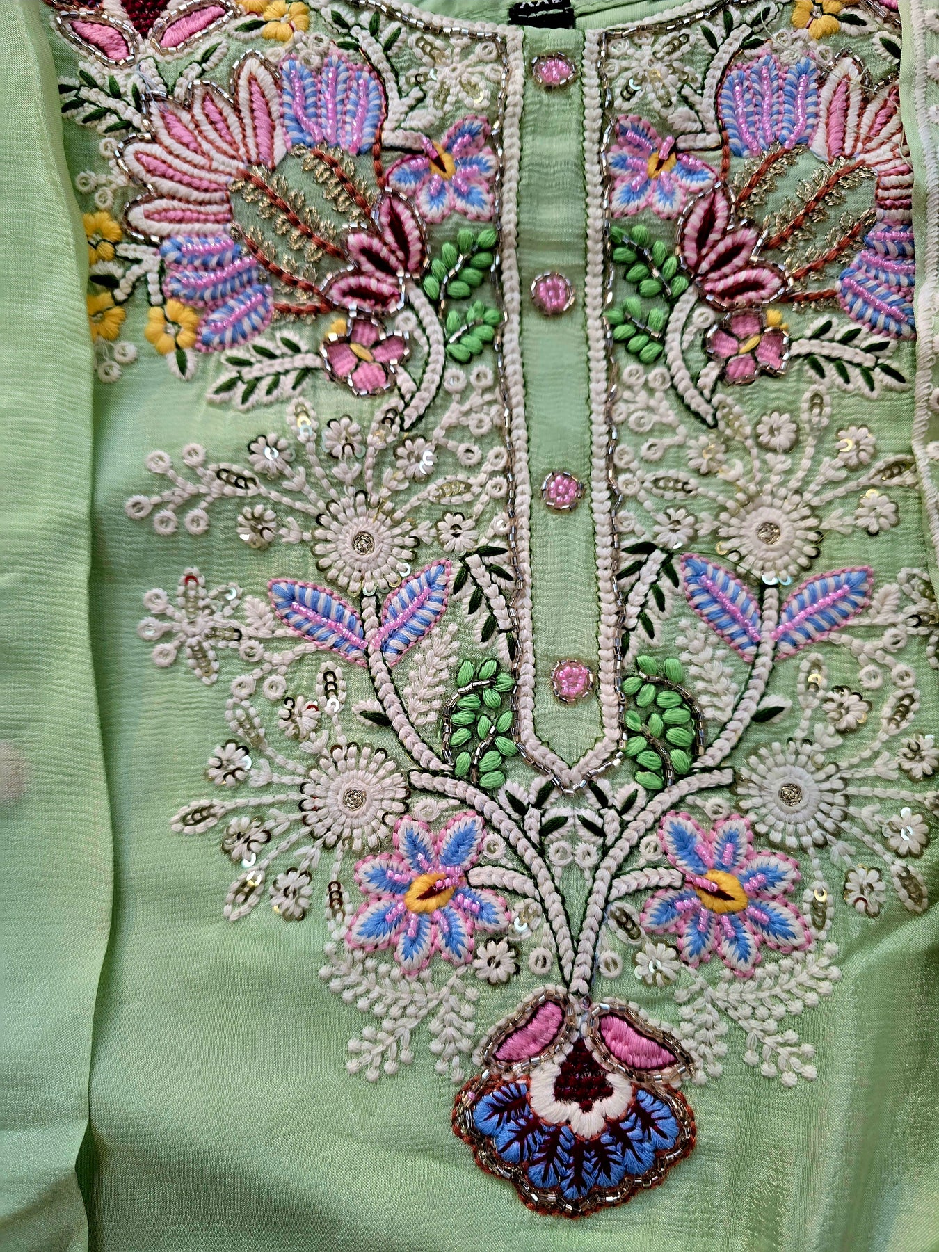 Top Shiffon material stitched with lining with beautiful beads handwork on front ,....... ,heavy boarder work on neck ,daman and sleeves 21 inches i......attached lining......top length 34 Inches