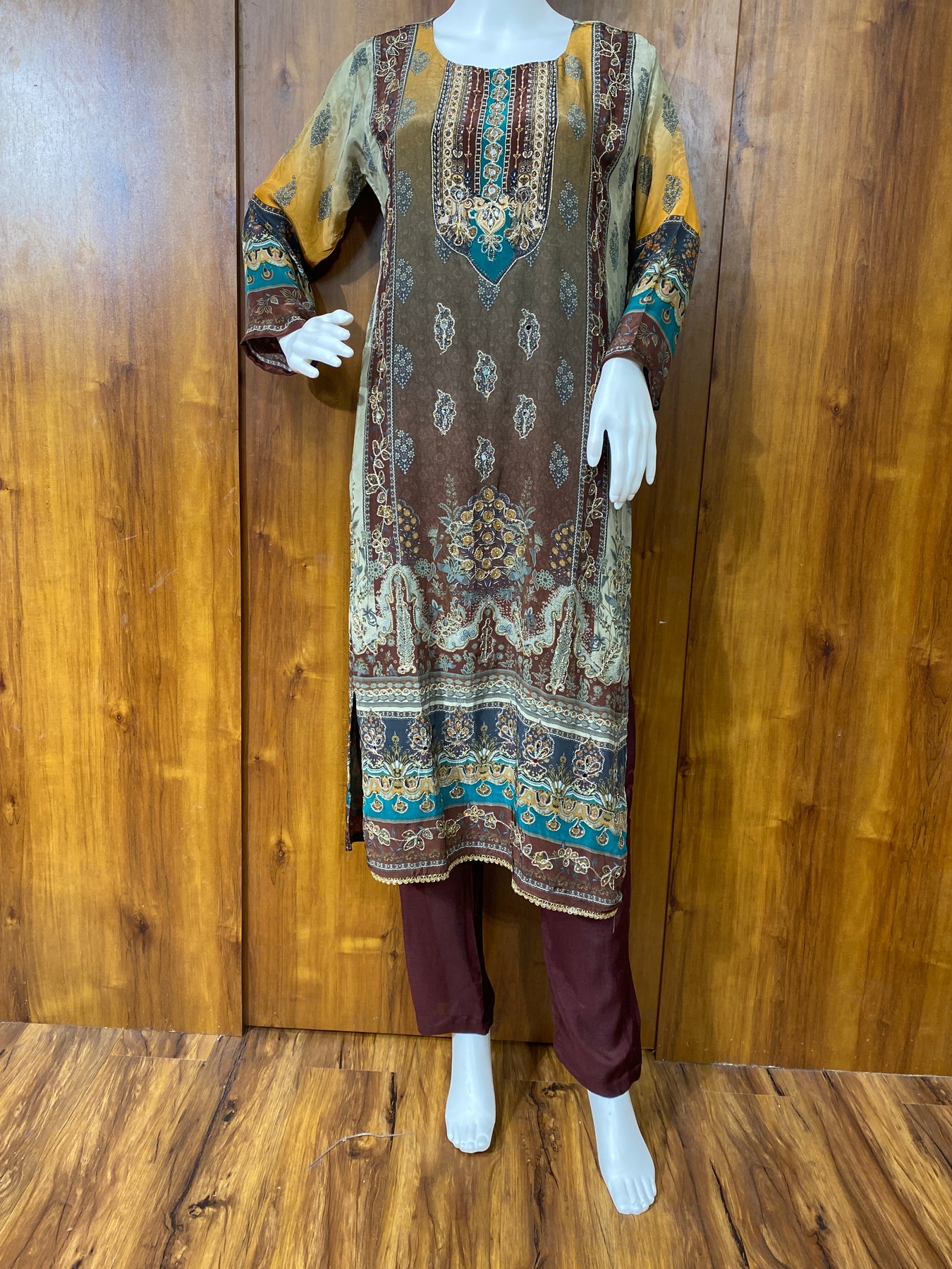 Top Muslin printed with beautiful handwork on neck and front..... Lace on sleeves and daman....Lining attached .....lenght 44 inches