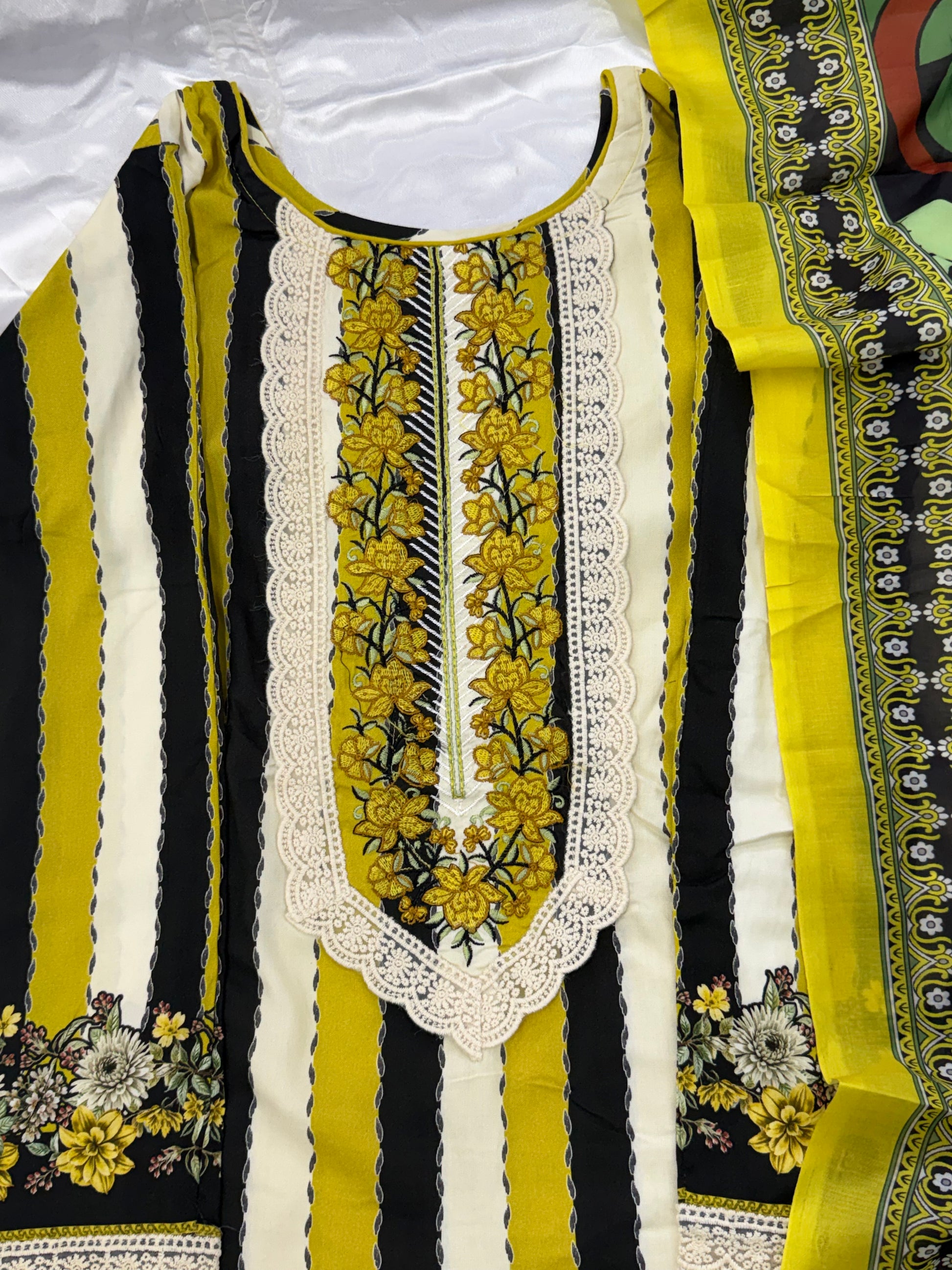 Top Lawn cotton Digital printed....embroidery on Neck...... extra lace detailing on sleeves,neck and front...