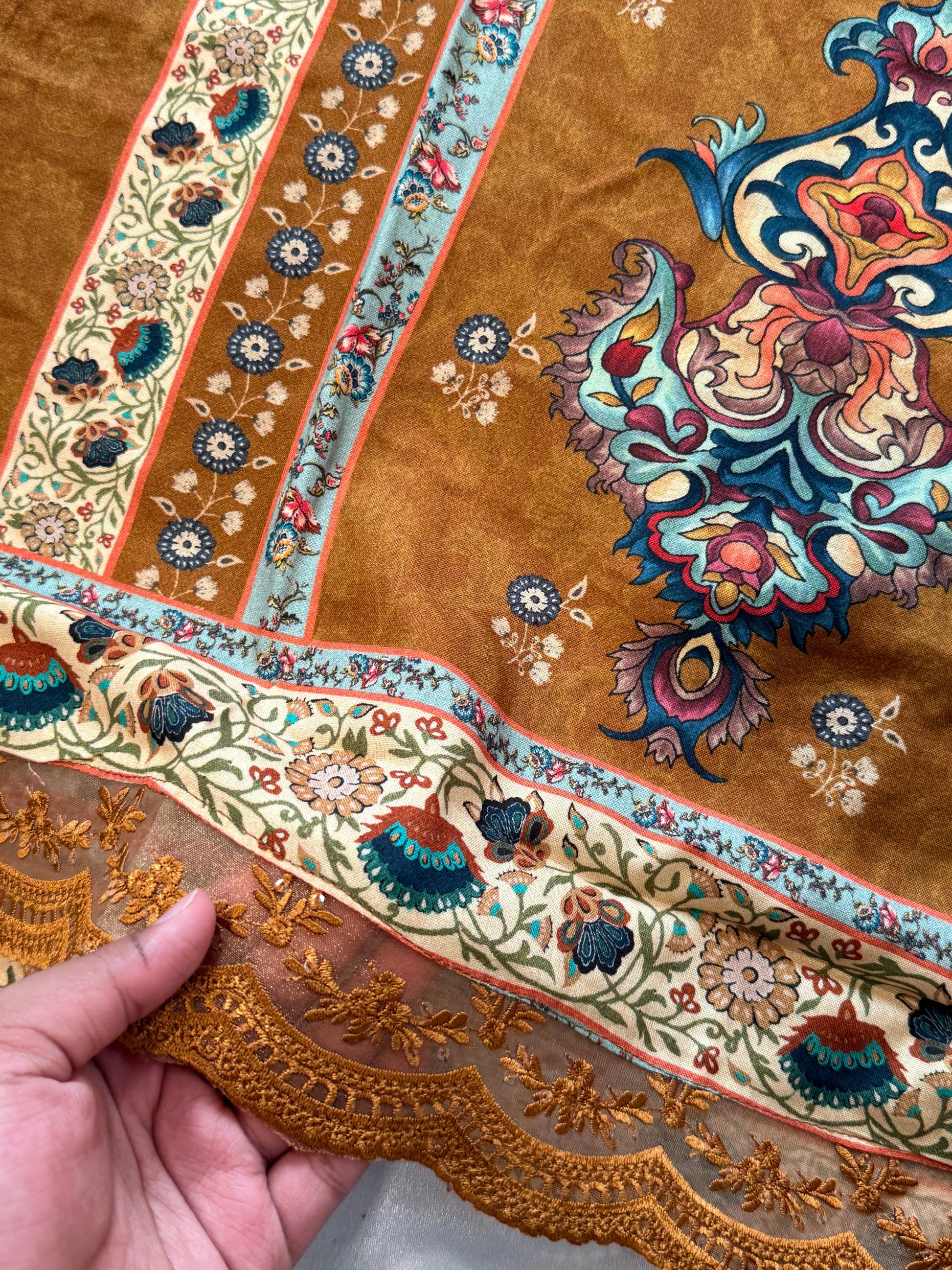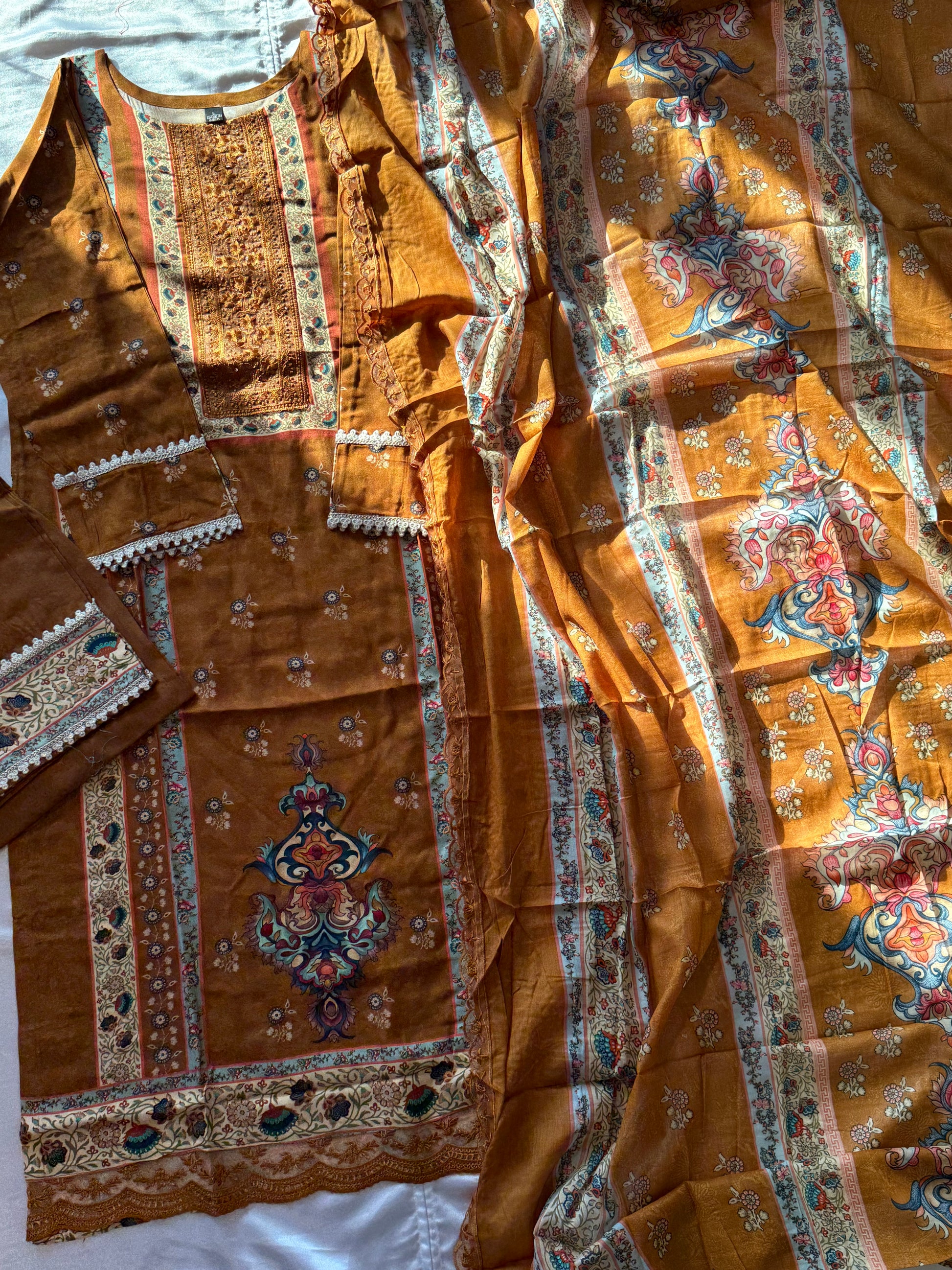 Top cotton Digital printed....Embroidery patch on Neck...... beautiful embroidery lace on front...