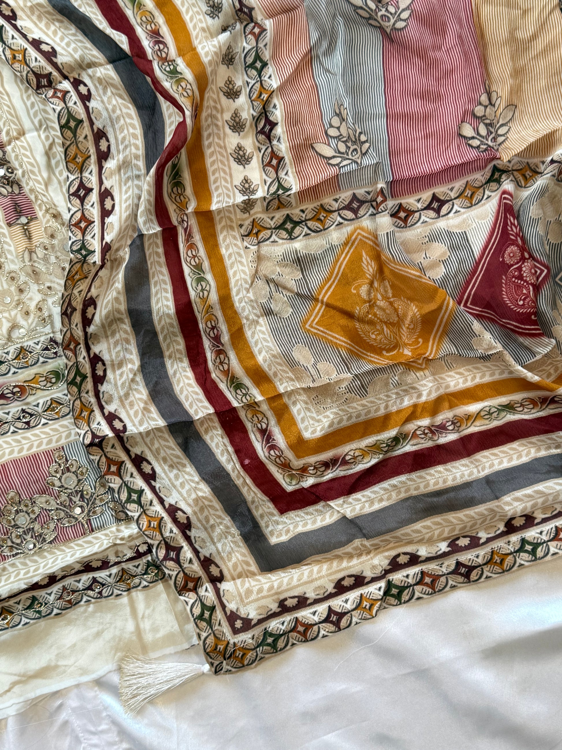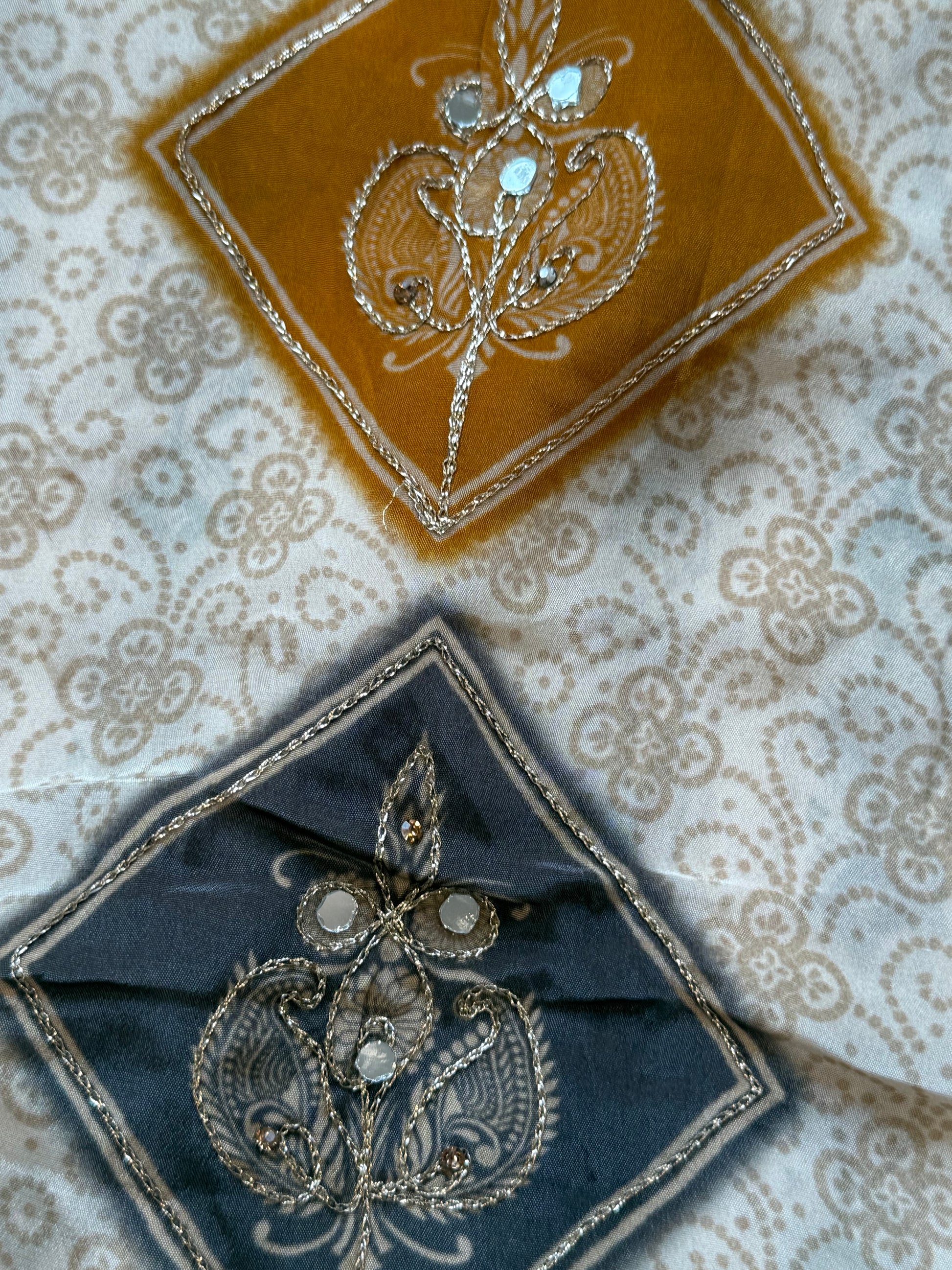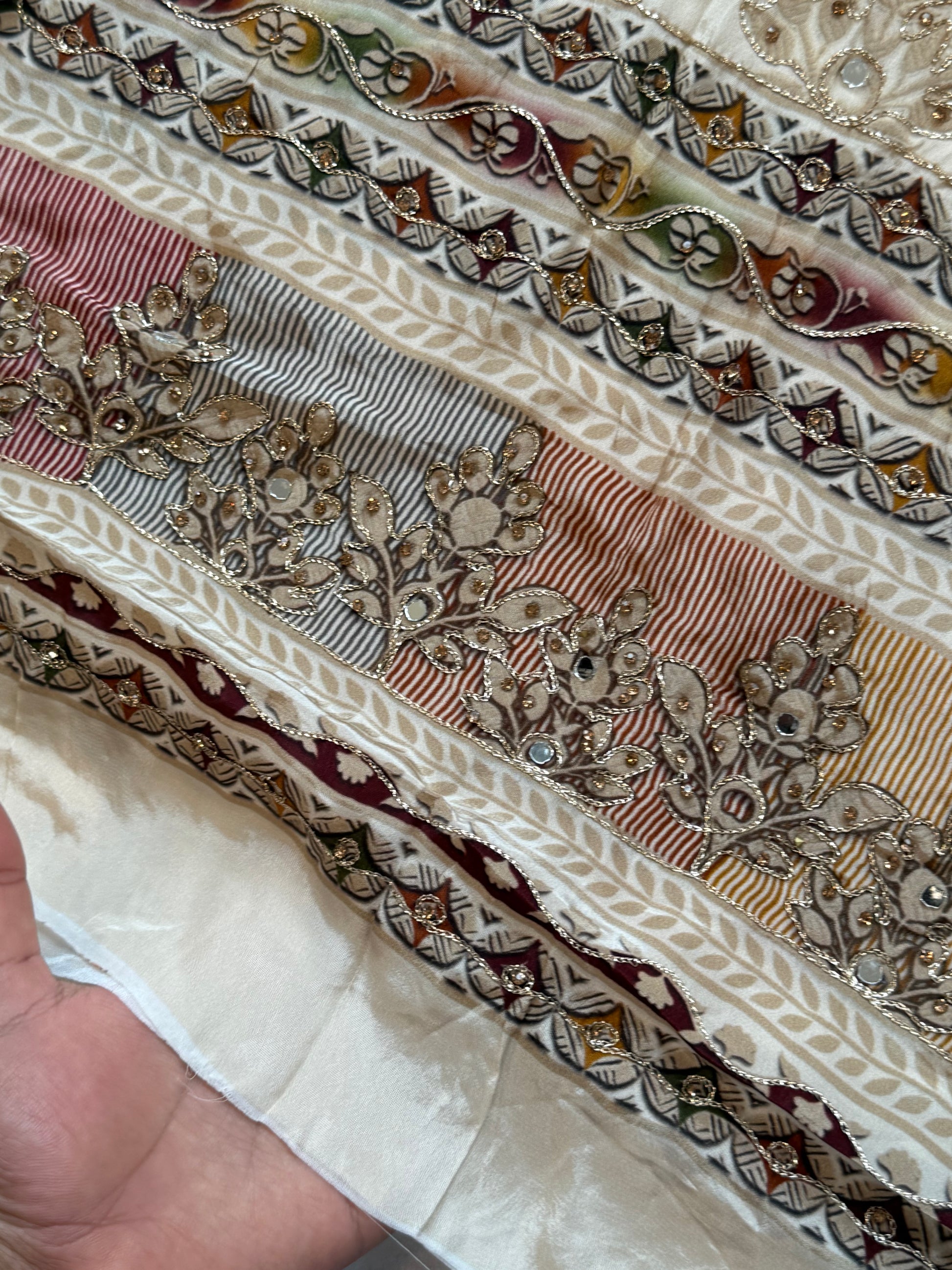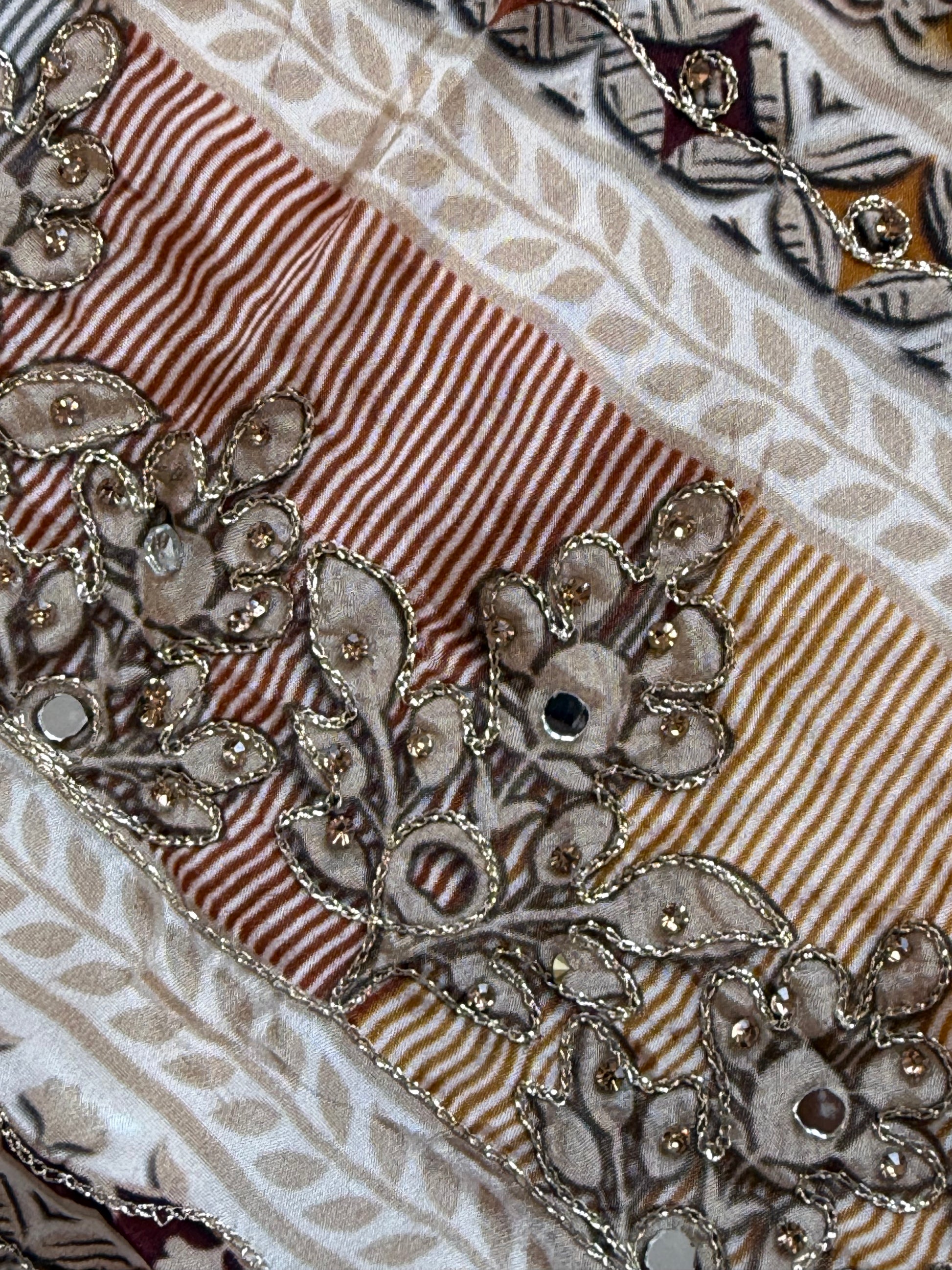 Top pure Crepe Digital printed.. beautiful Aari and Mirror hand work on front ...lenght 46 Inch..Bust 56 can be stitched....extra material for sleeves