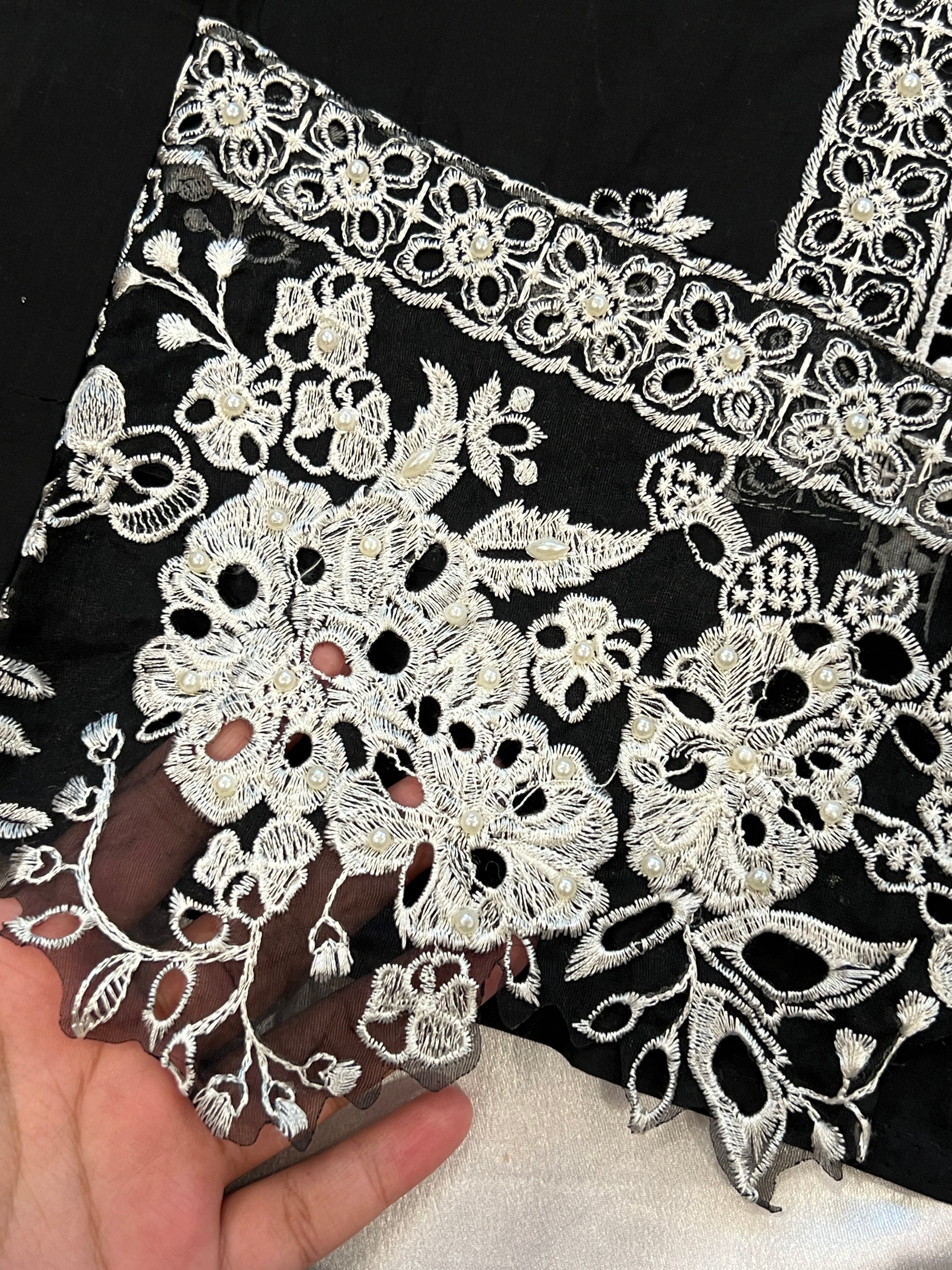 Top Pure cotton un-stitched material with self embroidery and pearl work..beautiful patch for daman ...bust 48 inches can be stitched...lenght 45 extra material given for selves
