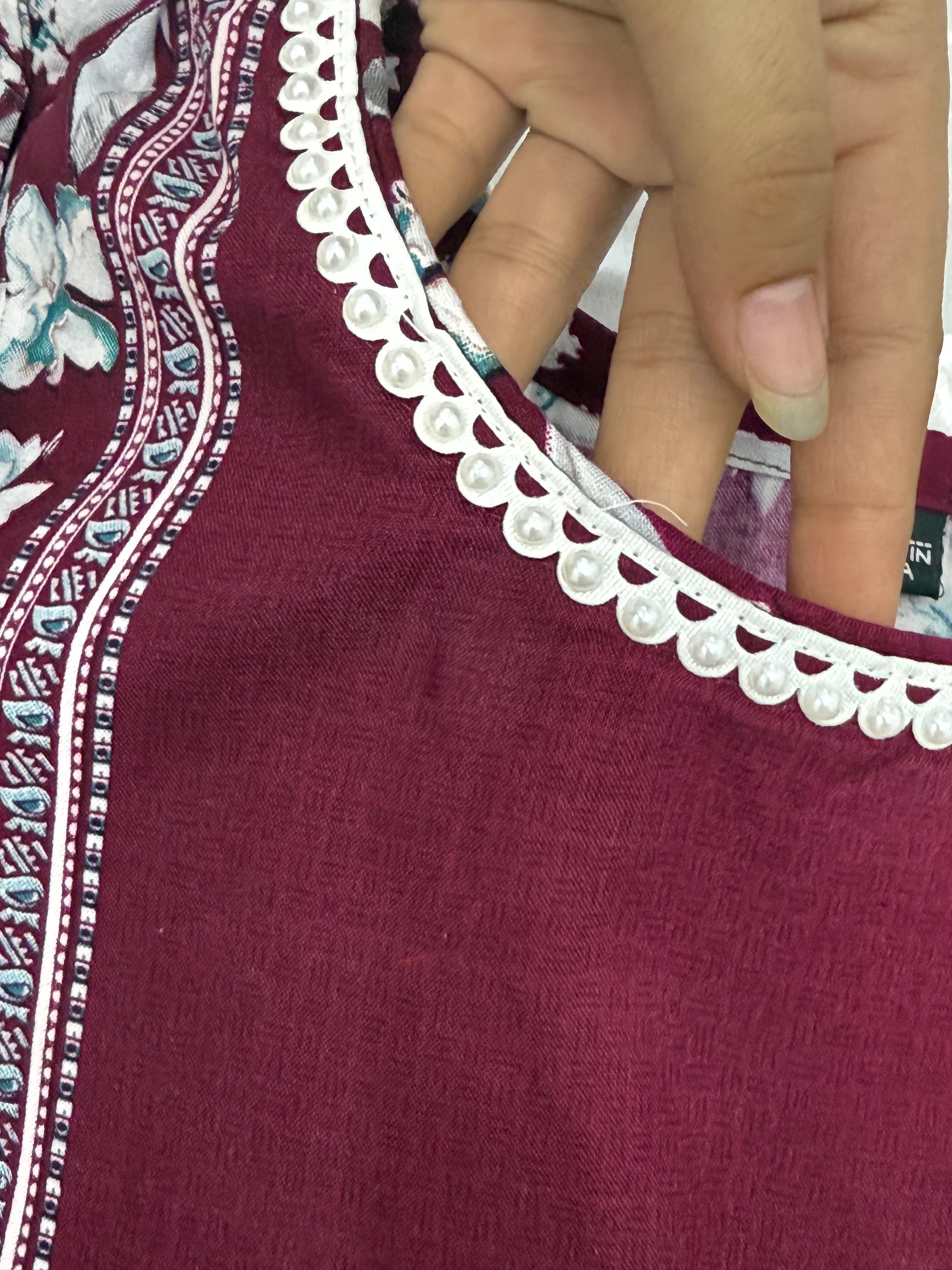 Top Lawn cotton Digital printed....kashmiri embroidery on Neck...... extra pearl lace on sleeves,neck and front...