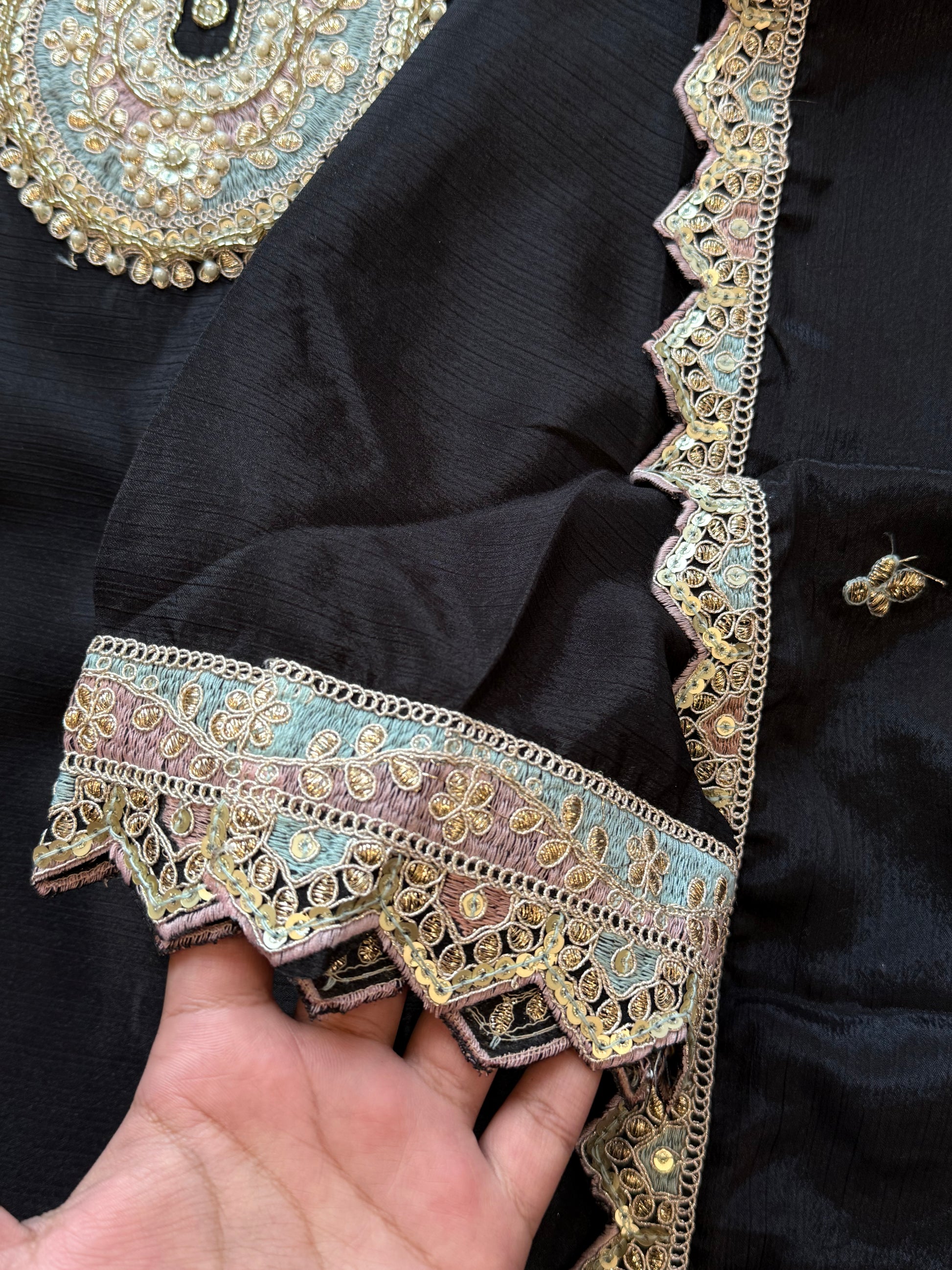 Top Chinnon silk designer stitched with beautiful 3mm sequence and coding dori work...heavy sleeves work..lenght 45 with attached lining and extra beads lace